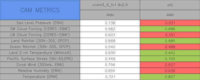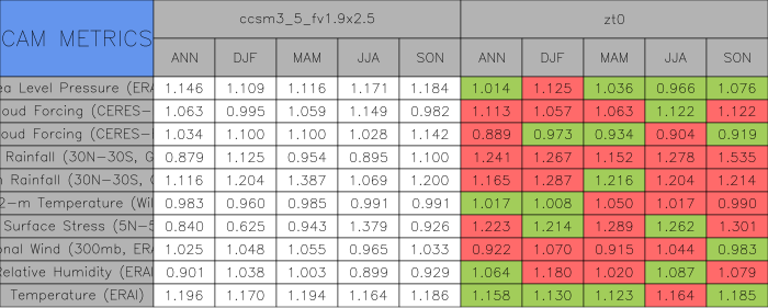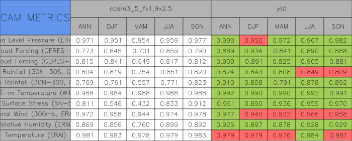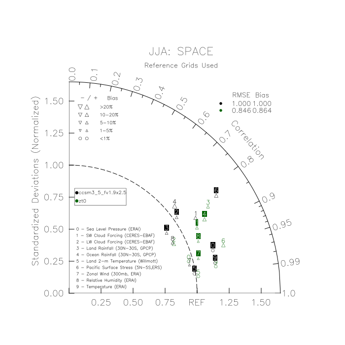 Taylor Diagrams were developed by Karl Taylor at PCMDI (paper|tech note) and aim to condense information about variance and RMSE characteristics of a particular model run when compared with observations in a single diagram. The tables summarize the individual metrics for each variable considered including: