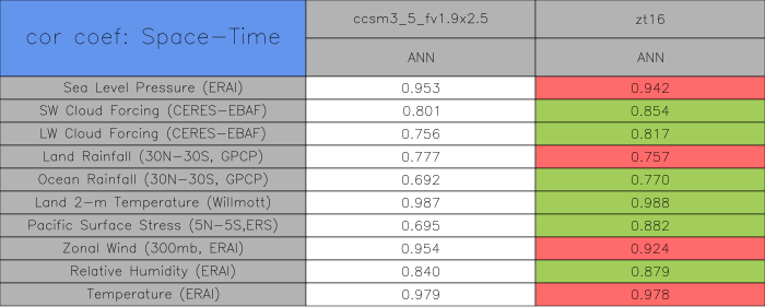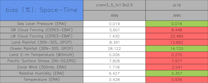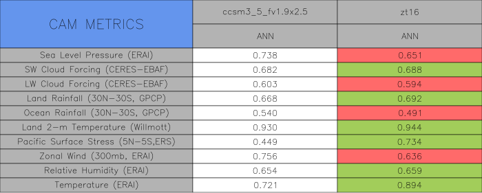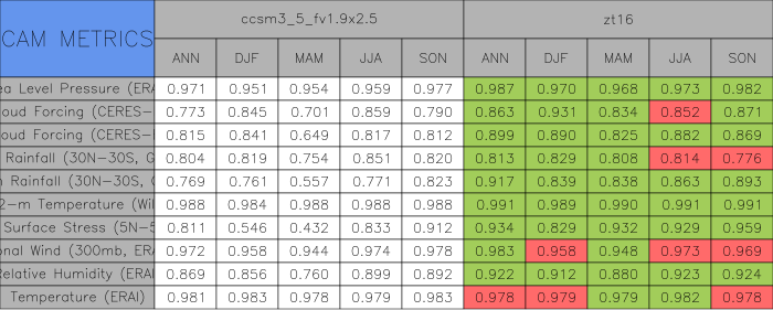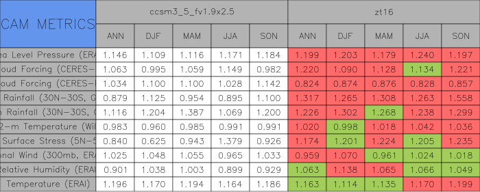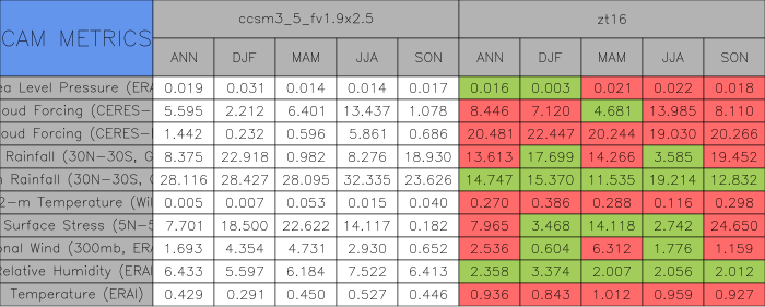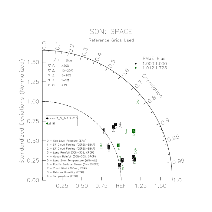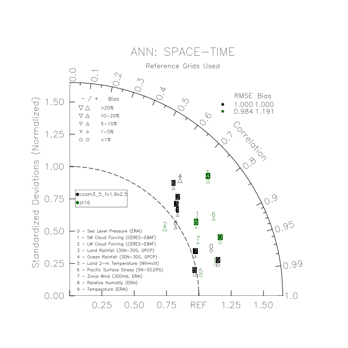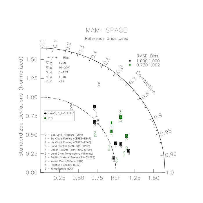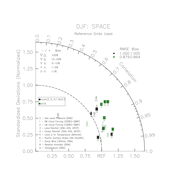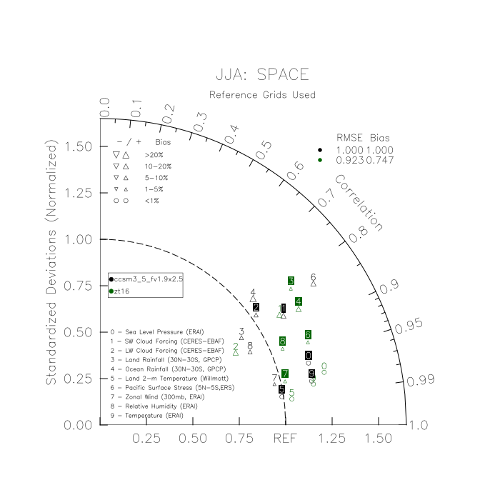 Taylor Diagrams were developed by Karl Taylor at PCMDI (paper|tech note) and aim to condense information about variance and RMSE characteristics of a particular model run when compared with observations in a single diagram. The tables summarize the individual metrics for each variable considered including: