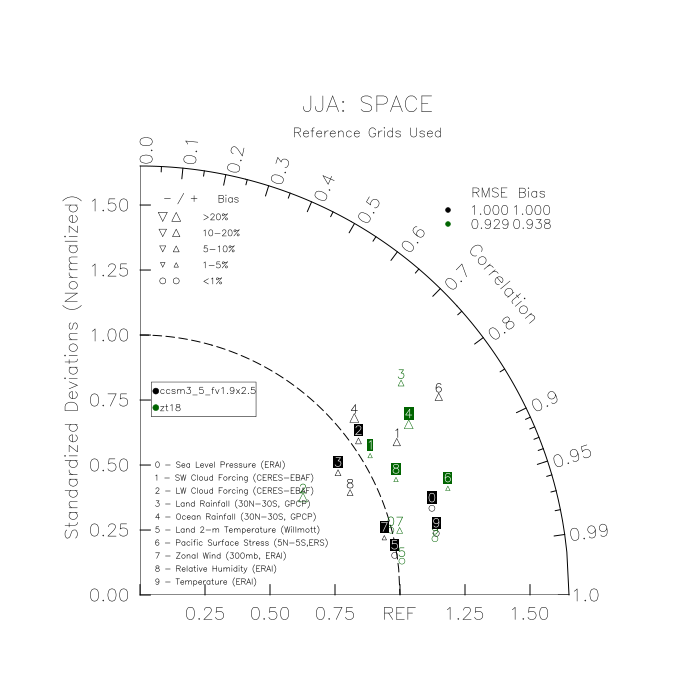 Taylor Diagrams were developed by Karl Taylor at PCMDI (paper|tech note) and aim to condense information about variance and RMSE characteristics of a particular model run when compared with observations in a single diagram. The tables summarize the individual metrics for each variable considered including: