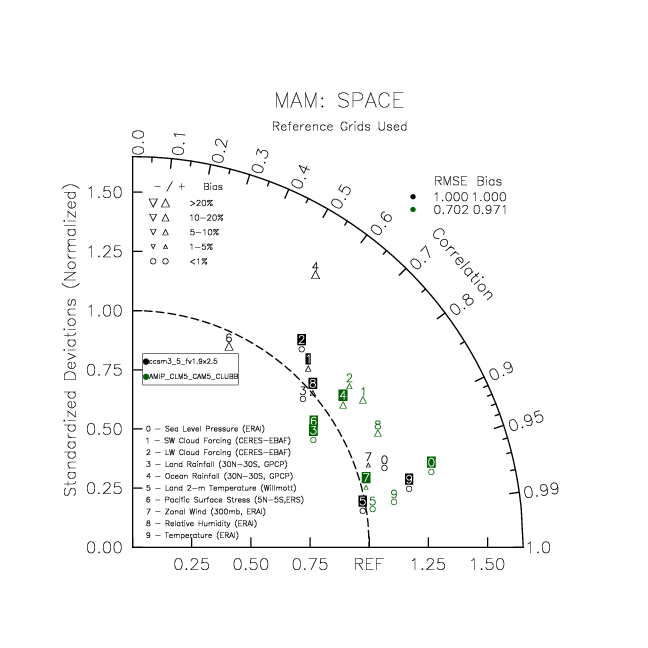 Taylor Diagrams were developed by Karl Taylor at PCMDI (paper|tech note) and aim to condense information about variance and RMSE characteristics of a particular model run when compared with observations in a single diagram. The tables summarize the individual metrics for each variable considered including: