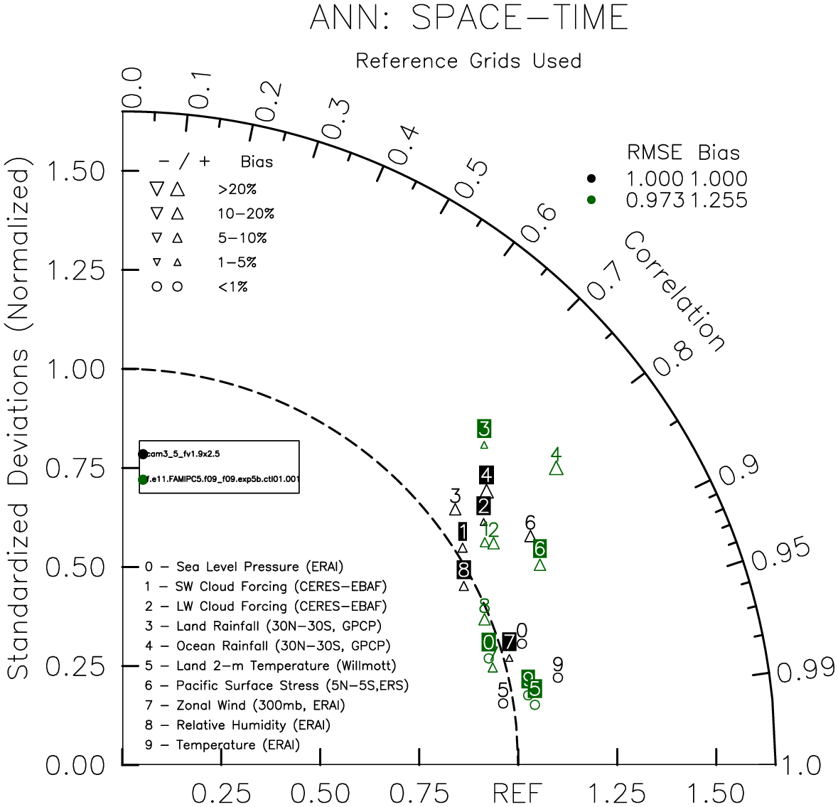 Taylor Diagrams were developed by Karl Taylor at PCMDI (paper|tech note) and aim to condense information about variance and RMSE characteristics of a particular model run when compared with observations in a single diagram. The tables summarize the individual metrics for each variable considered including: