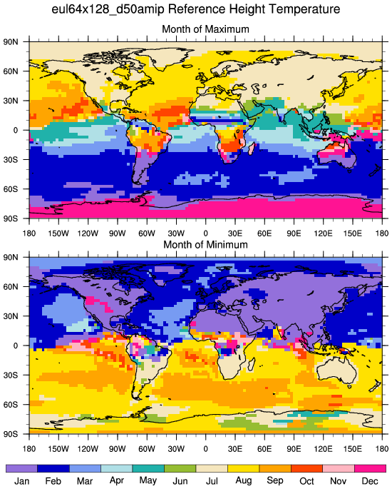 | Temperature Ref Height Month of Max and Min | f.e12.FAMIPC5.f09_f09.amip_L30.001 | NCEP | CAM3 T42 | CAM3 T85 |