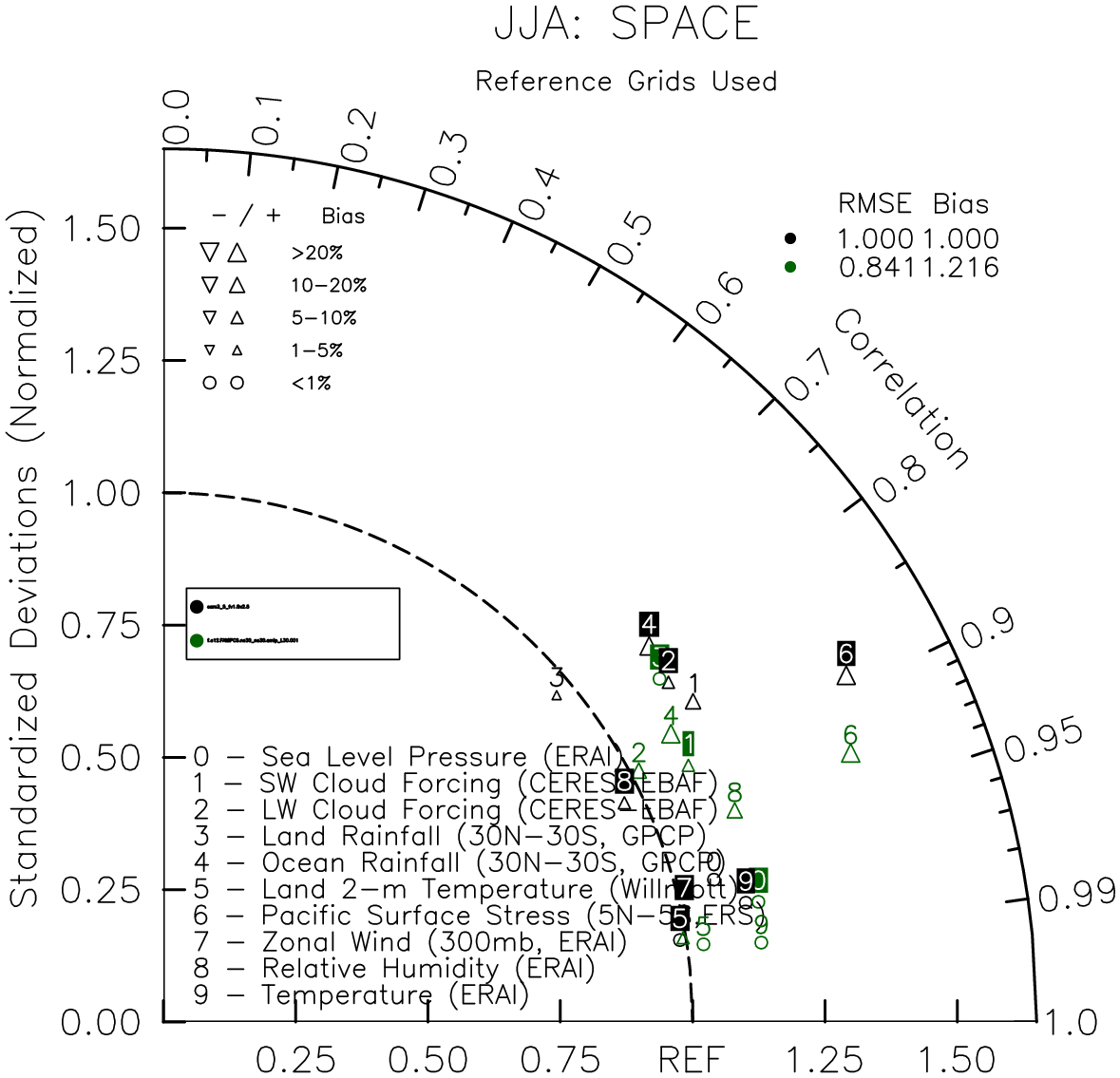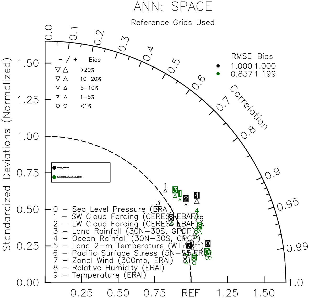 Taylor Diagrams were developed by Karl Taylor at PCMDI (paper|tech note) and aim to condense information about variance and RMSE characteristics of a particular model run when compared with observations in a single diagram. The tables summarize the individual metrics for each variable considered including:
