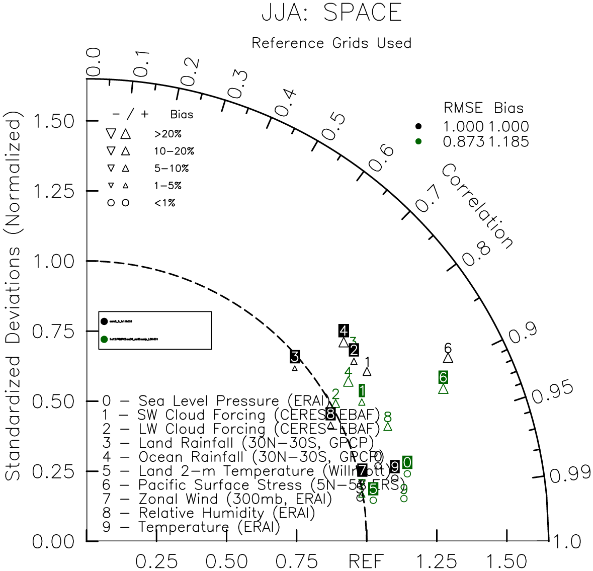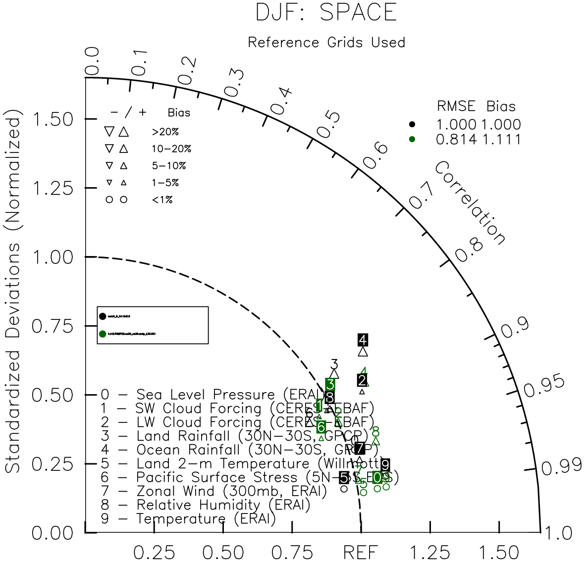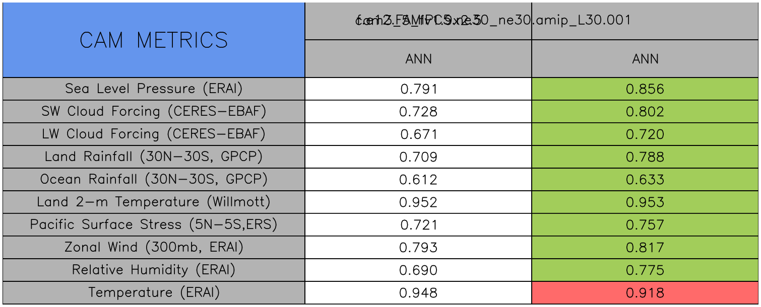 Taylor Diagrams were developed by Karl Taylor at PCMDI (paper|tech note) and aim to condense information about variance and RMSE characteristics of a particular model run when compared with observations in a single diagram. The tables summarize the individual metrics for each variable considered including:
