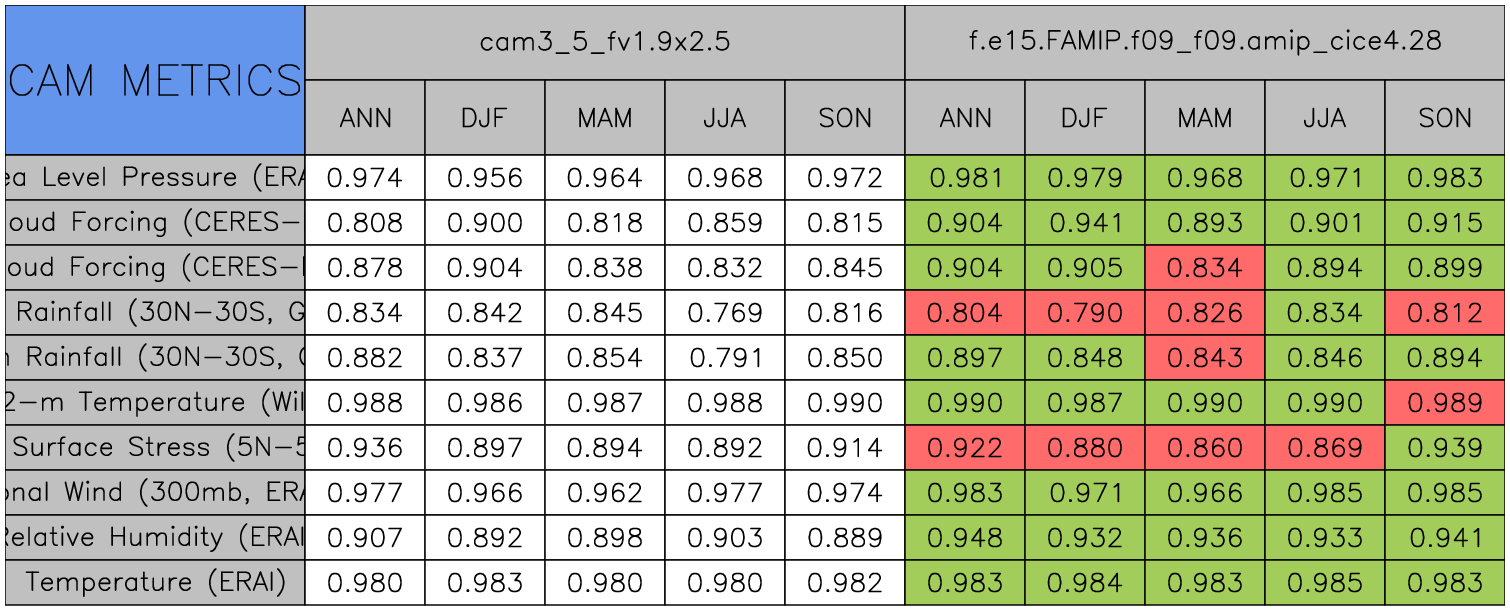 Taylor Diagrams were developed by Karl Taylor at PCMDI (paper|tech note) and aim to condense information about variance and RMSE characteristics of a particular model run when compared with observations in a single diagram. The tables summarize the individual metrics for each variable considered including: