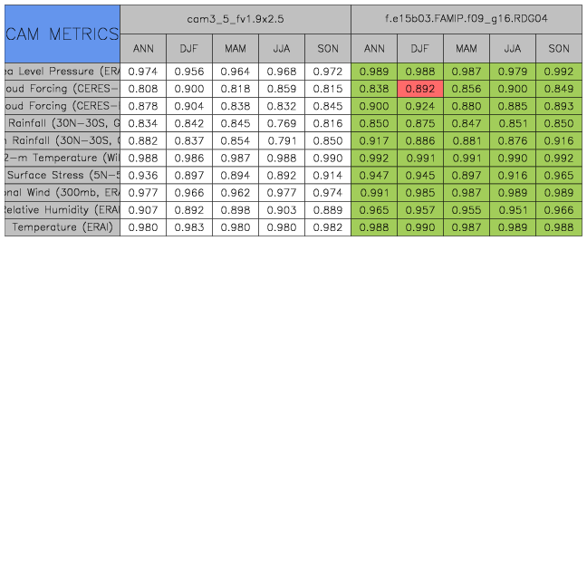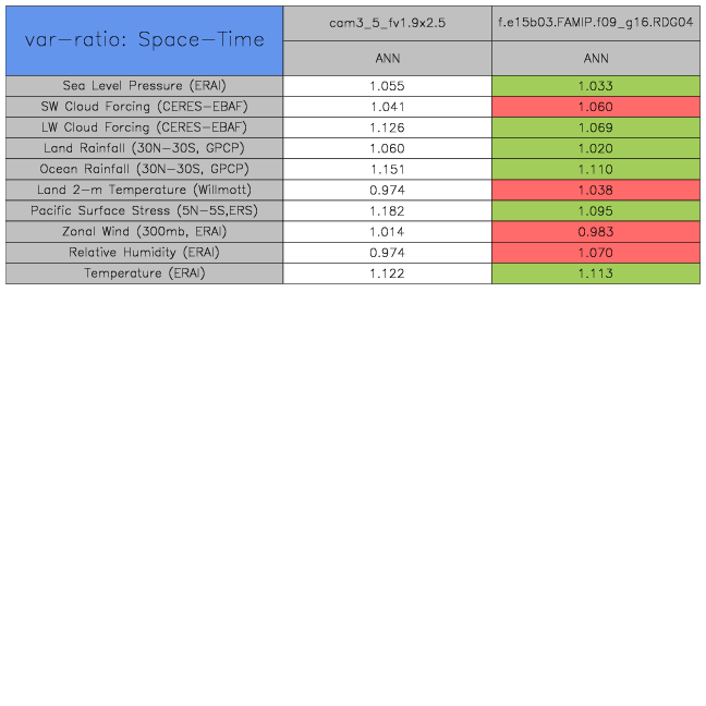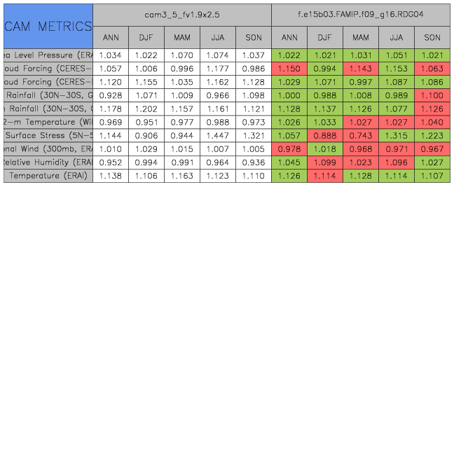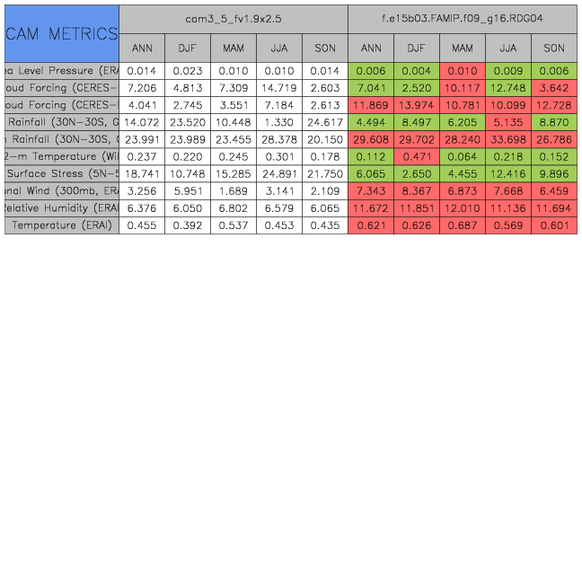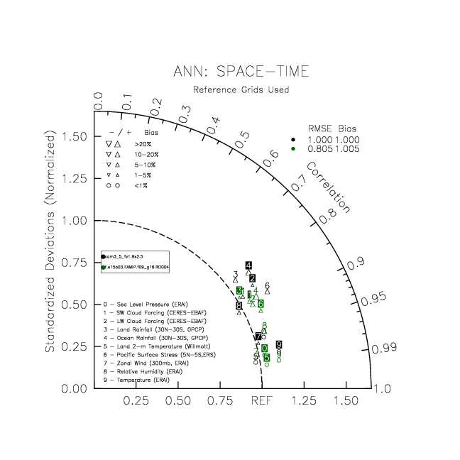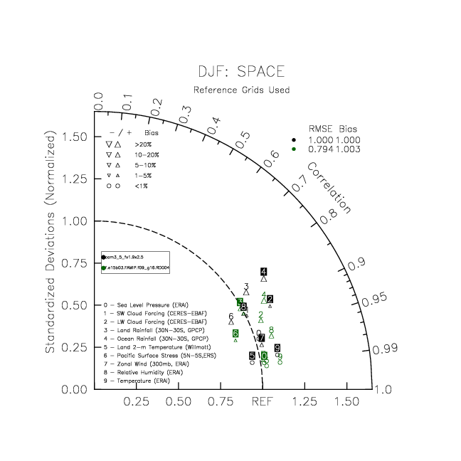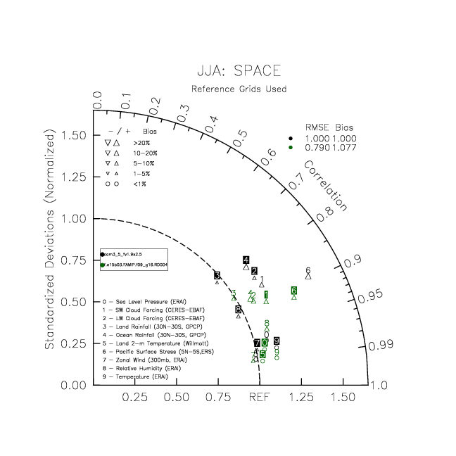 Taylor Diagrams were developed by Karl Taylor at PCMDI (paper|tech note) and aim to condense information about variance and RMSE characteristics of a particular model run when compared with observations in a single diagram. The tables summarize the individual metrics for each variable considered including: