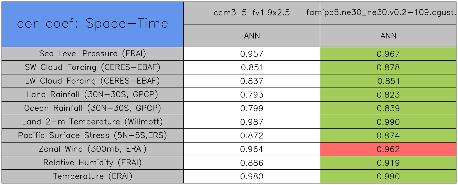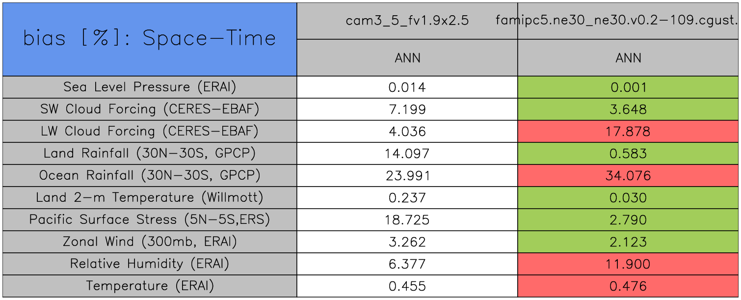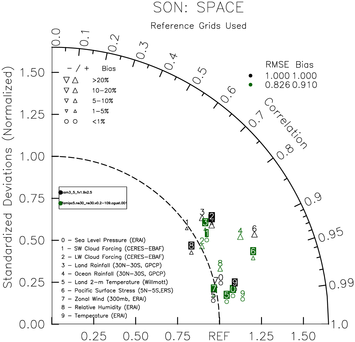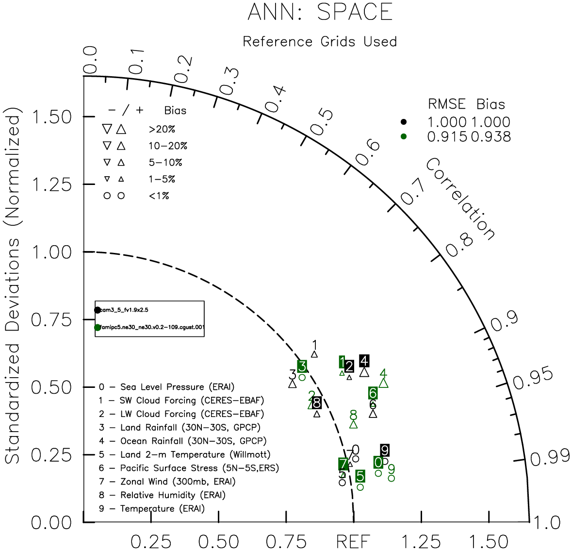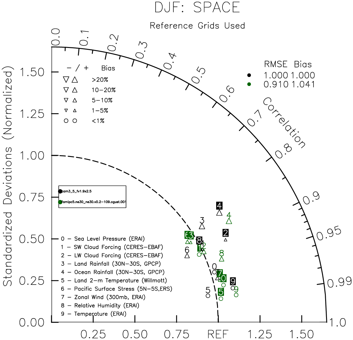 Taylor Diagrams were developed by Karl Taylor at PCMDI (paper|tech note) and aim to condense information about variance and RMSE characteristics of a particular model run when compared with observations in a single diagram. The tables summarize the individual metrics for each variable considered including: