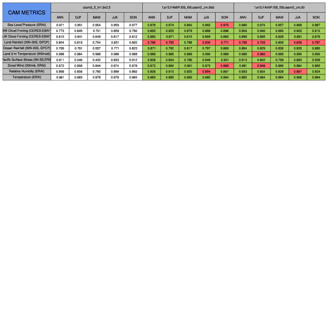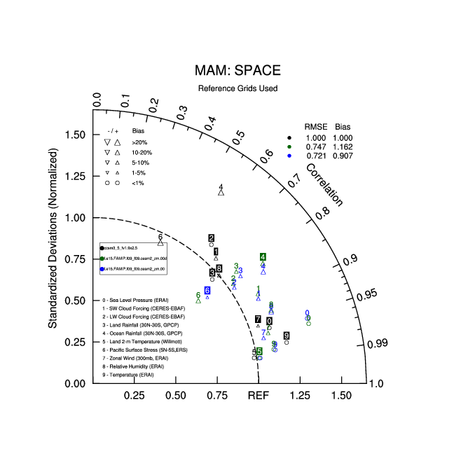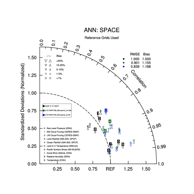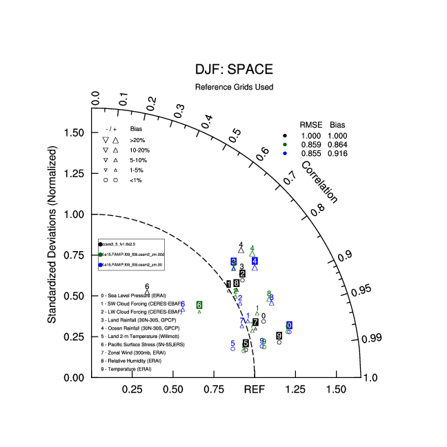 Taylor Diagrams were developed by Karl Taylor at PCMDI (paper|tech note) and aim to condense information about variance and RMSE characteristics of a particular model run when compared with observations in a single diagram. The tables summarize the individual metrics for each variable considered including: