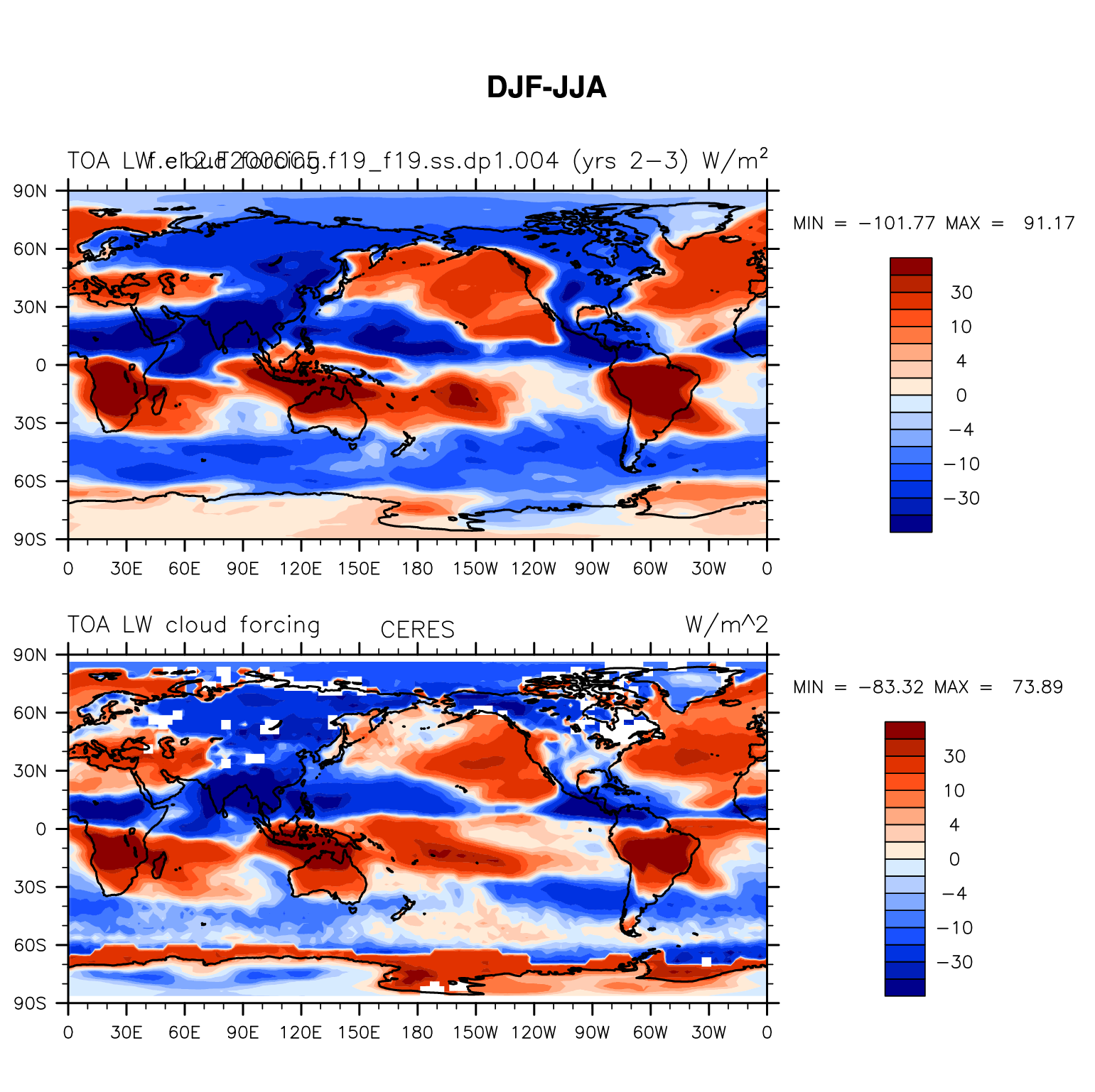 f.e12.F2000C5.f19_f19.ss.dp1.004 DIAG Set 9 - Horizontal contour plots of DJF-JJA differences