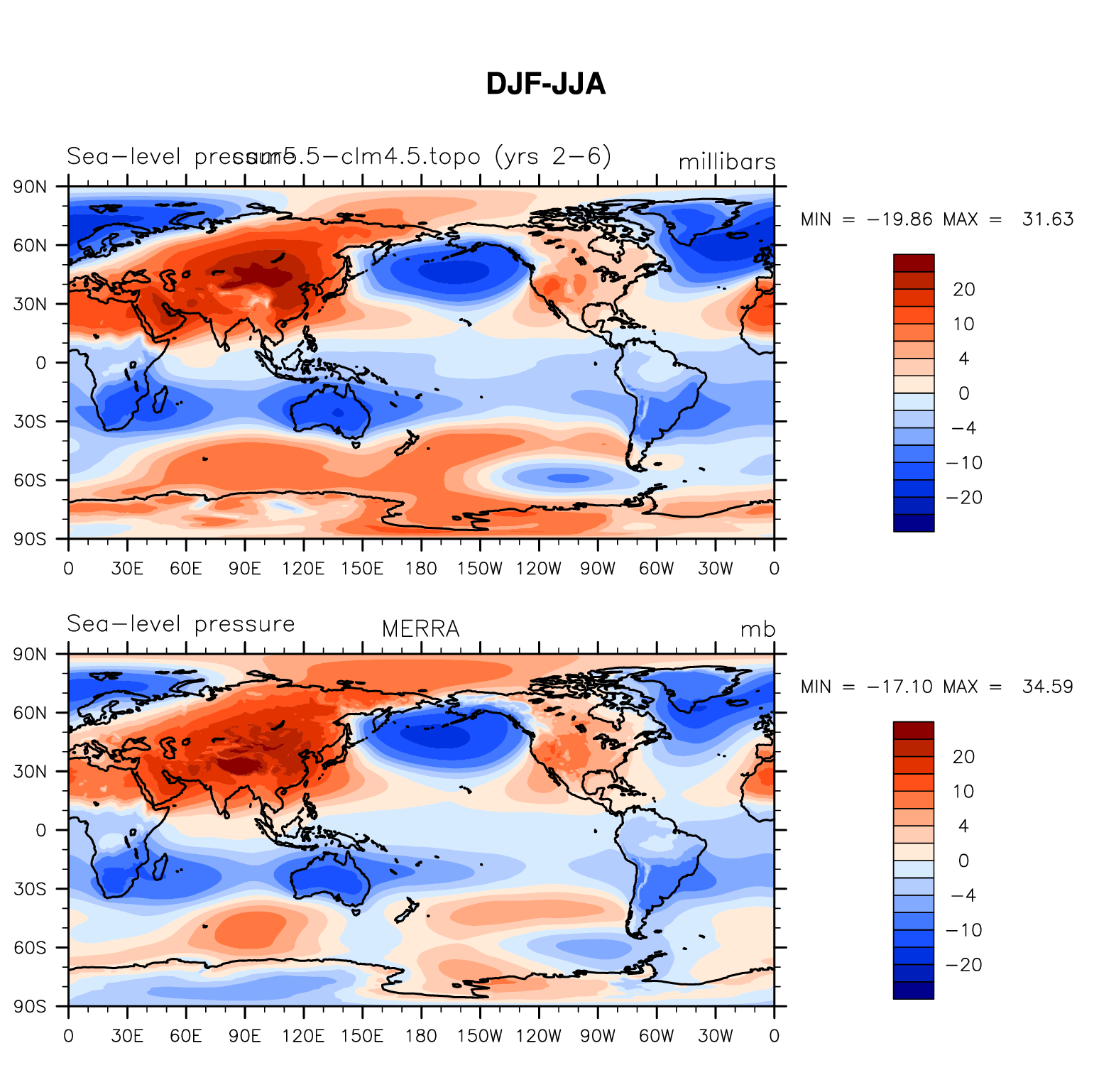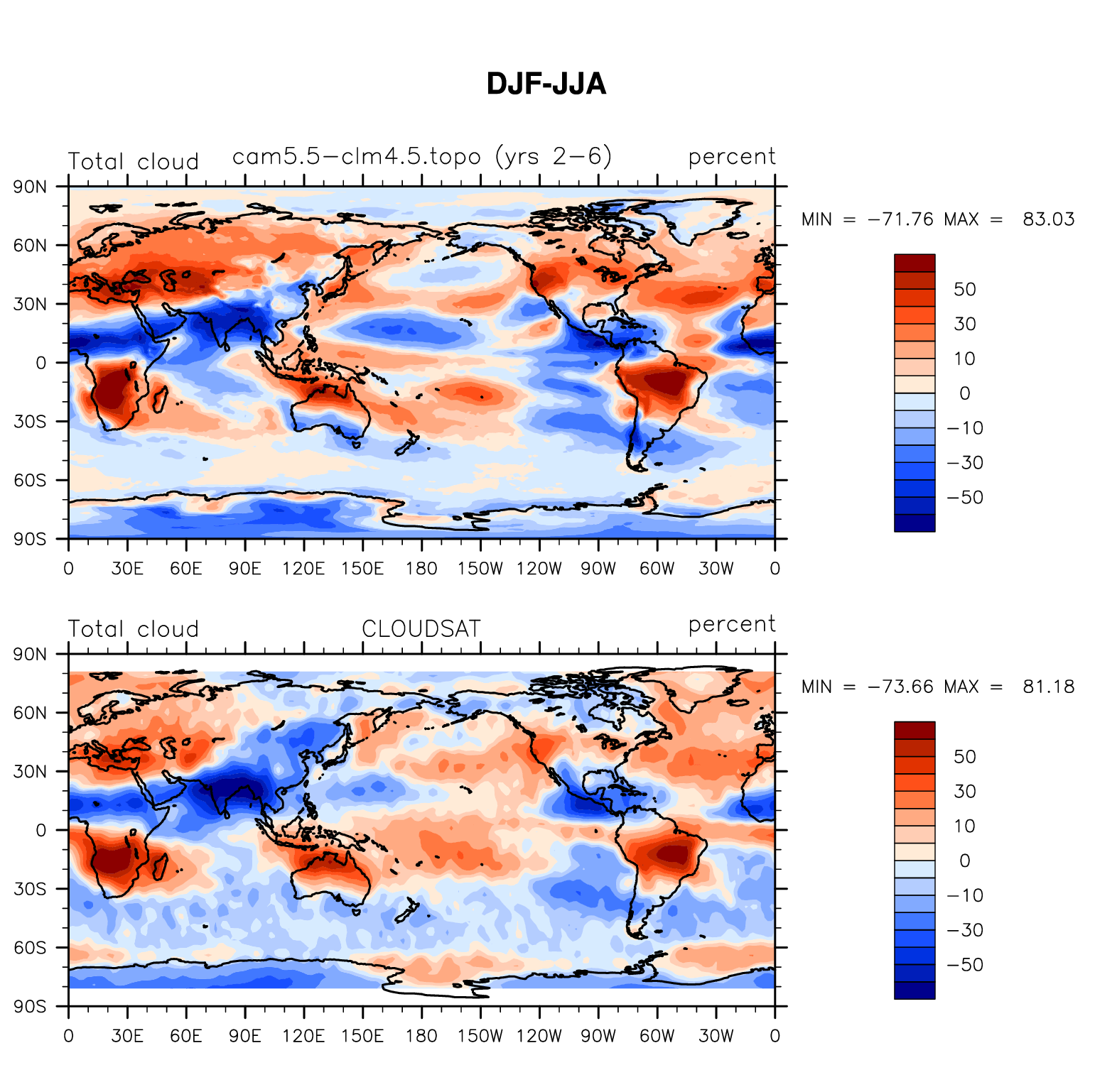 f.e13.F1850C5CLM45.f09_g16.beta06_mods.cam5.5-clm4.5.topo.001 DIAG Set 9 - Horizontal contour plots of DJF-JJA differences