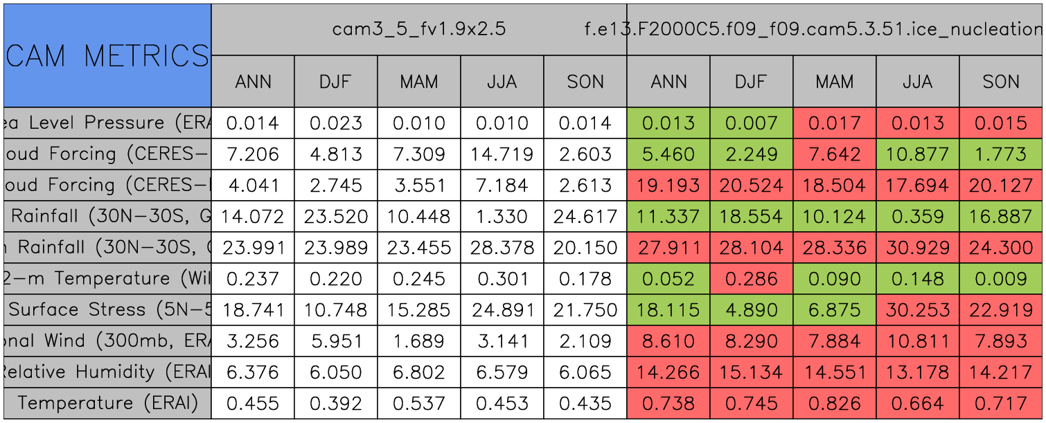 Taylor Diagrams were developed by Karl Taylor at PCMDI (paper|tech note) and aim to condense information about variance and RMSE characteristics of a particular model run when compared with observations in a single diagram. The tables summarize the individual metrics for each variable considered including:
