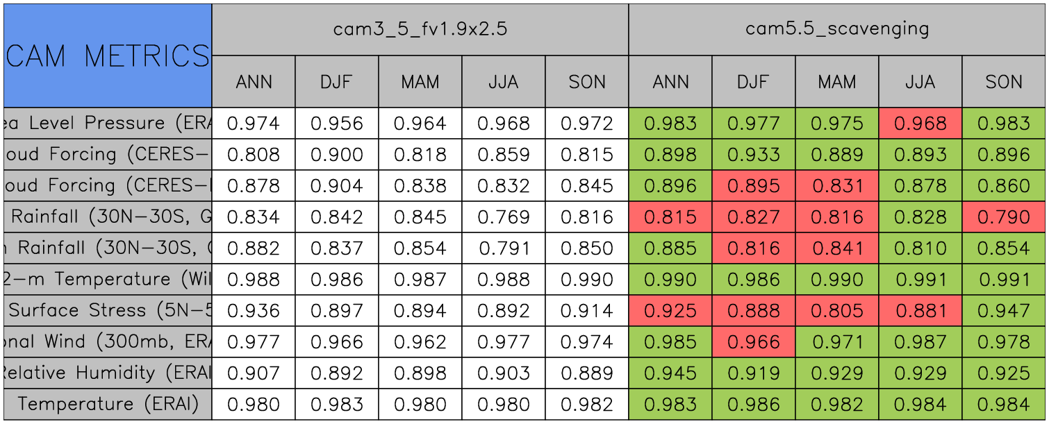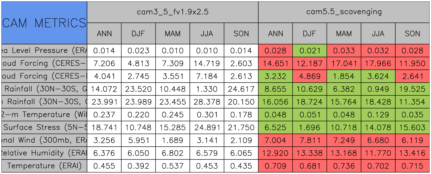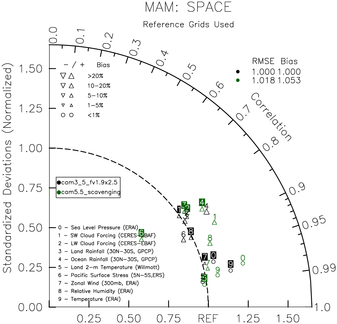Taylor Diagrams were developed by Karl Taylor at PCMDI (paper|tech note) and aim to condense information about variance and RMSE characteristics of a particular model run when compared with observations in a single diagram. The tables summarize the individual metrics for each variable considered including: