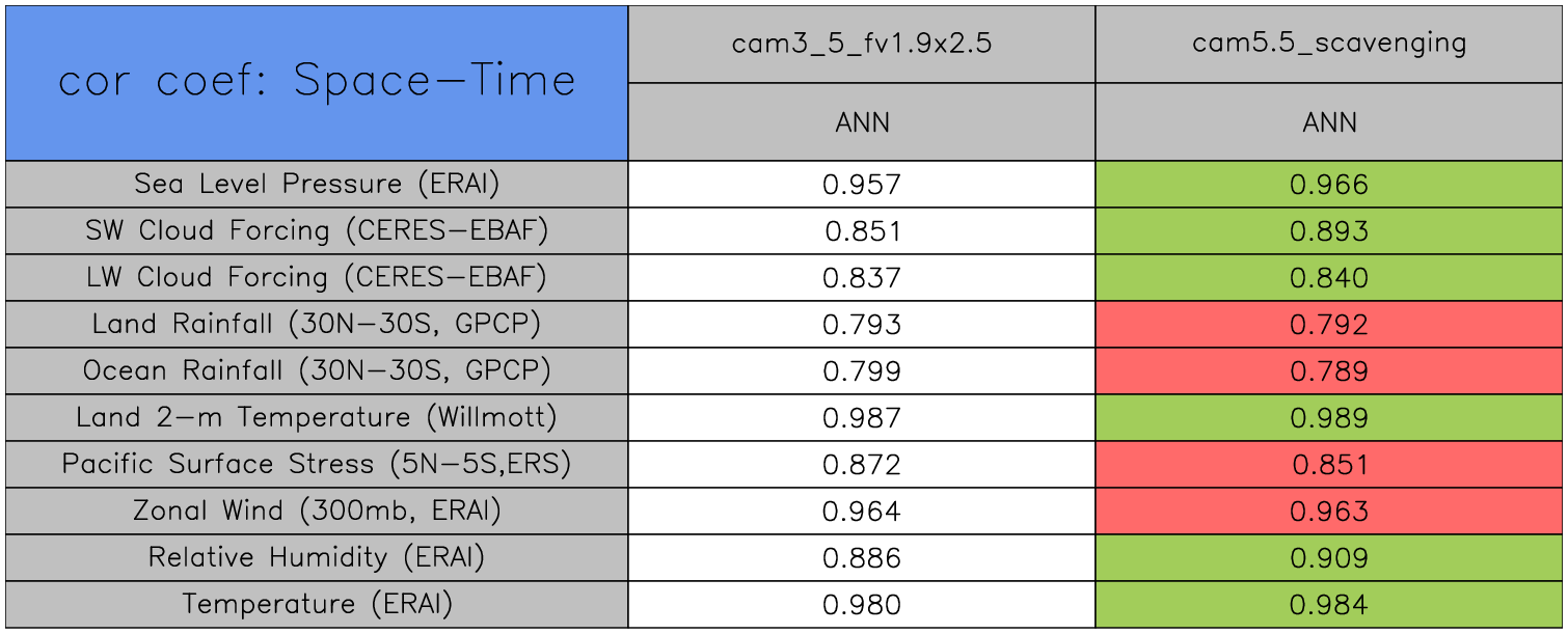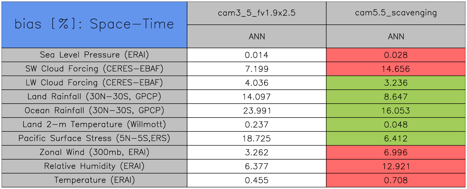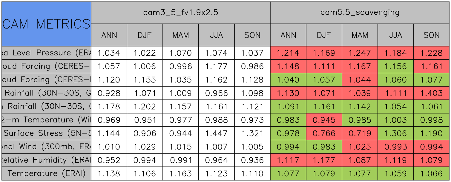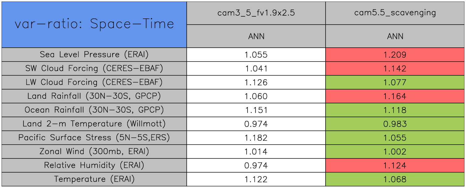 Taylor Diagrams were developed by Karl Taylor at PCMDI (paper|tech note) and aim to condense information about variance and RMSE characteristics of a particular model run when compared with observations in a single diagram. The tables summarize the individual metrics for each variable considered including: