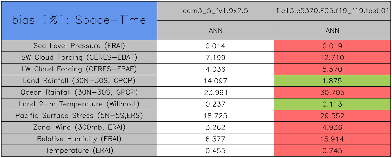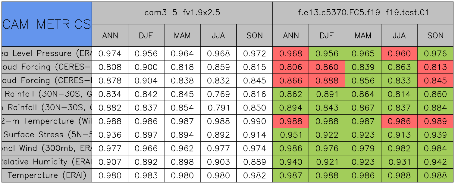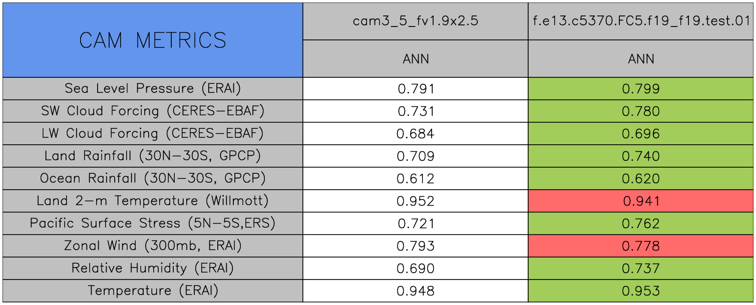 Taylor Diagrams were developed by Karl Taylor at PCMDI (paper|tech note) and aim to condense information about variance and RMSE characteristics of a particular model run when compared with observations in a single diagram. The tables summarize the individual metrics for each variable considered including: