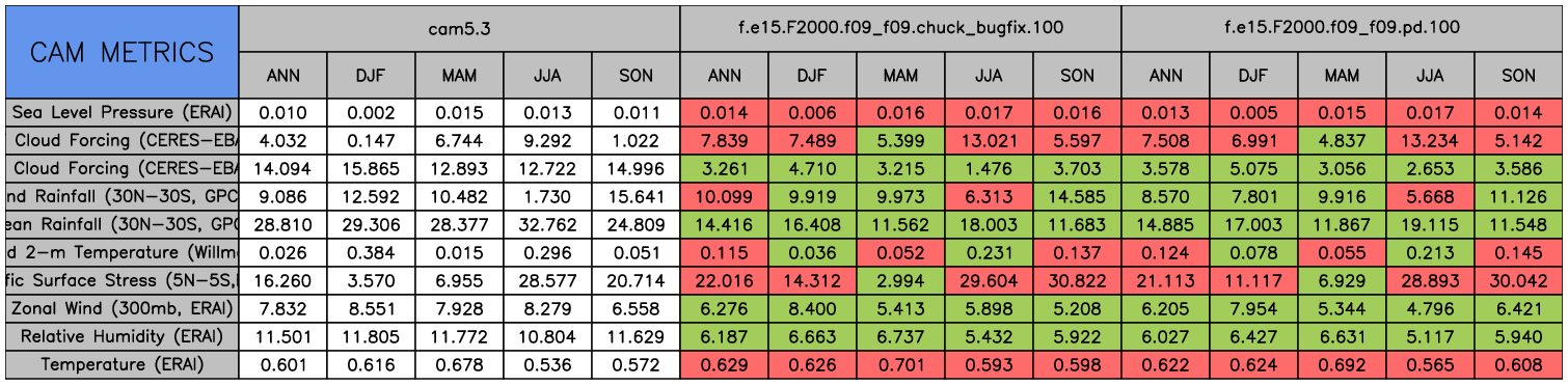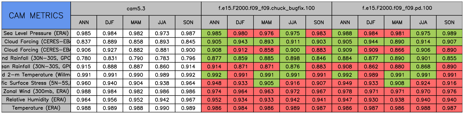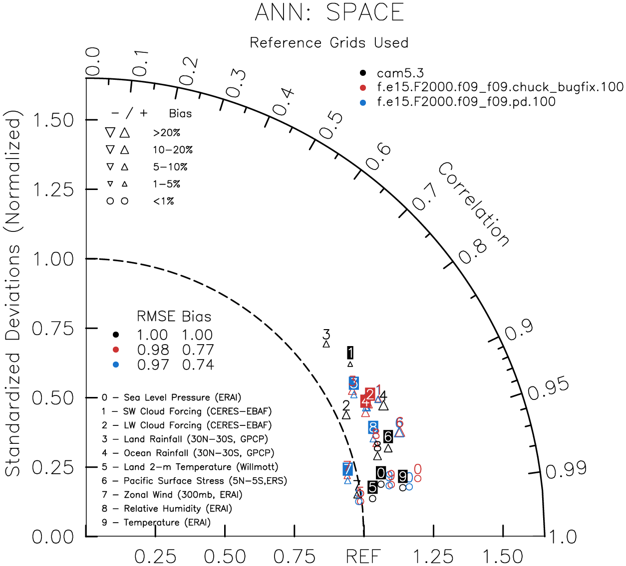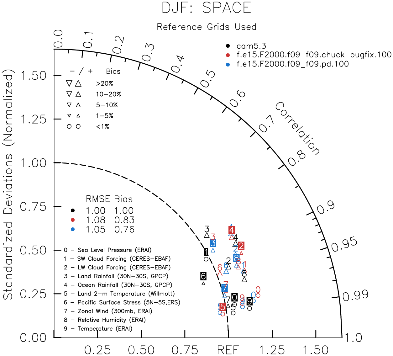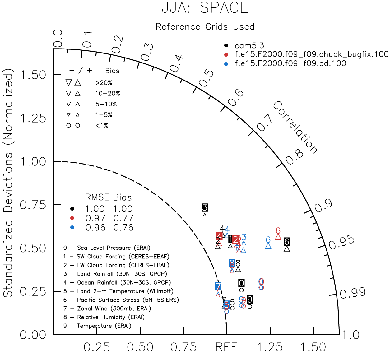 Taylor Diagrams were developed by Karl Taylor at PCMDI (paper|tech note) and aim to condense information about variance and RMSE characteristics of a particular model run when compared with observations in a single diagram. The tables summarize the individual metrics for each variable considered including: