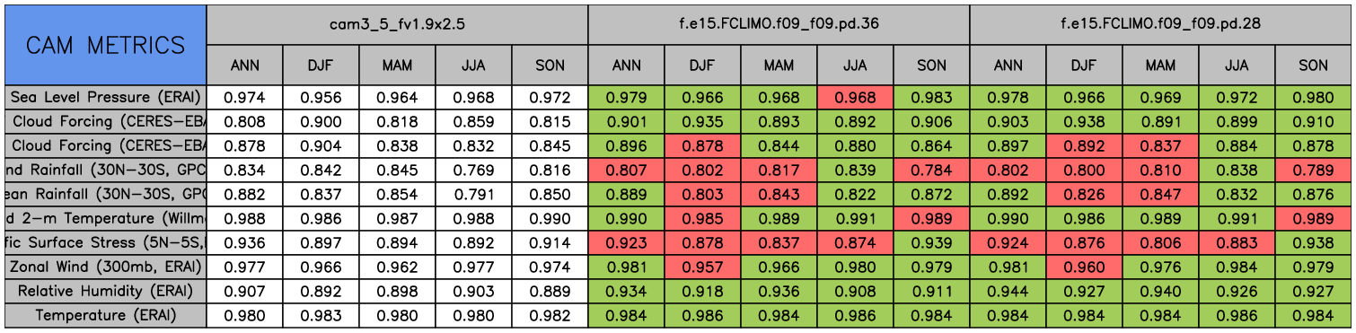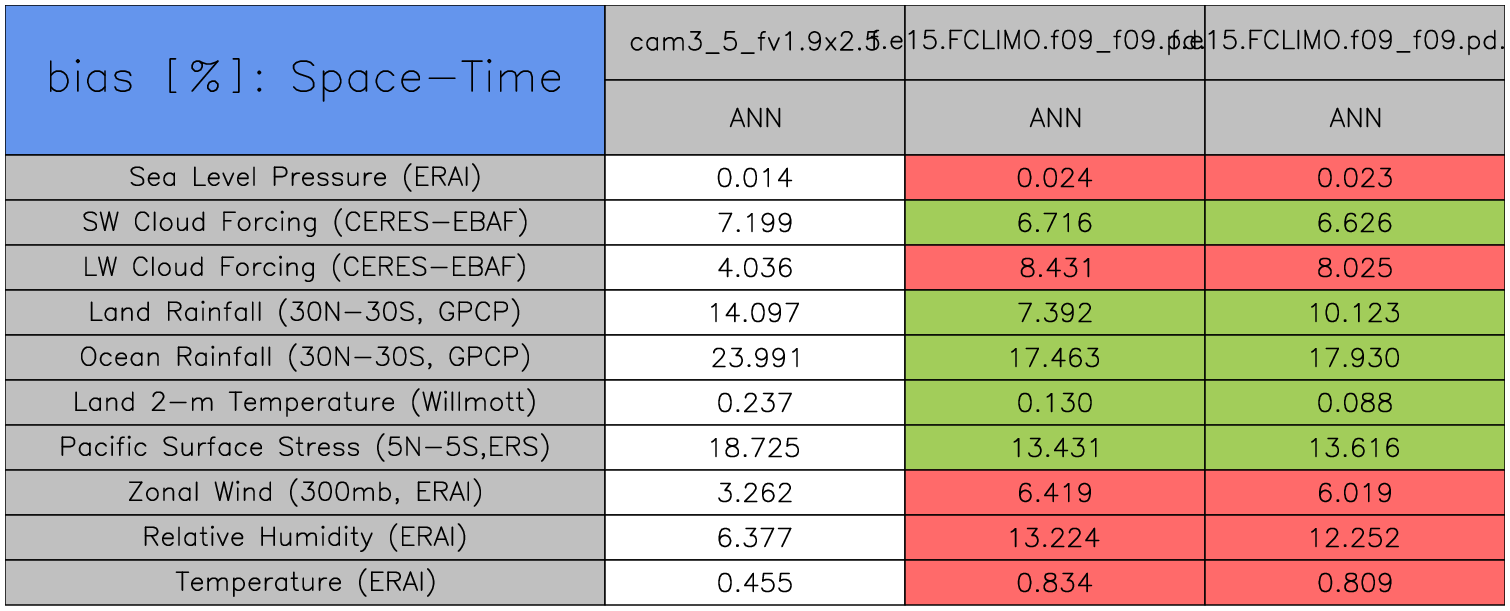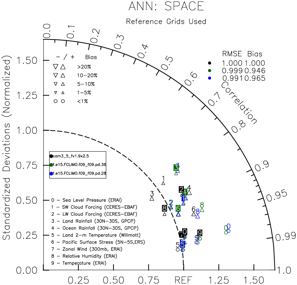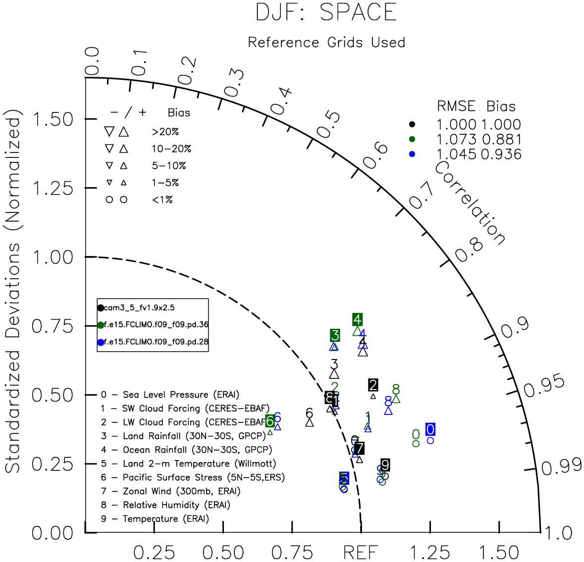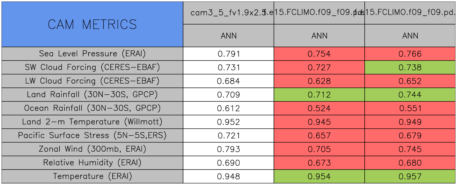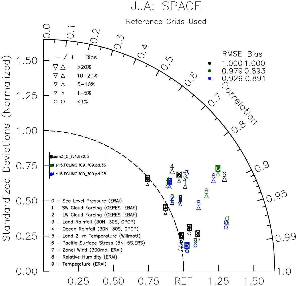Taylor Diagrams were developed by Karl Taylor at PCMDI (paper|tech note) and aim to condense information about variance and RMSE characteristics of a particular model run when compared with observations in a single diagram. The tables summarize the individual metrics for each variable considered including:
