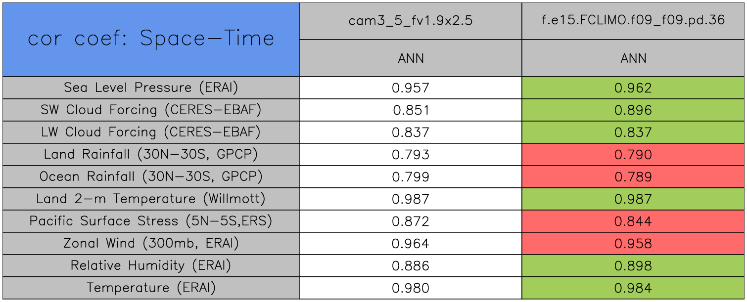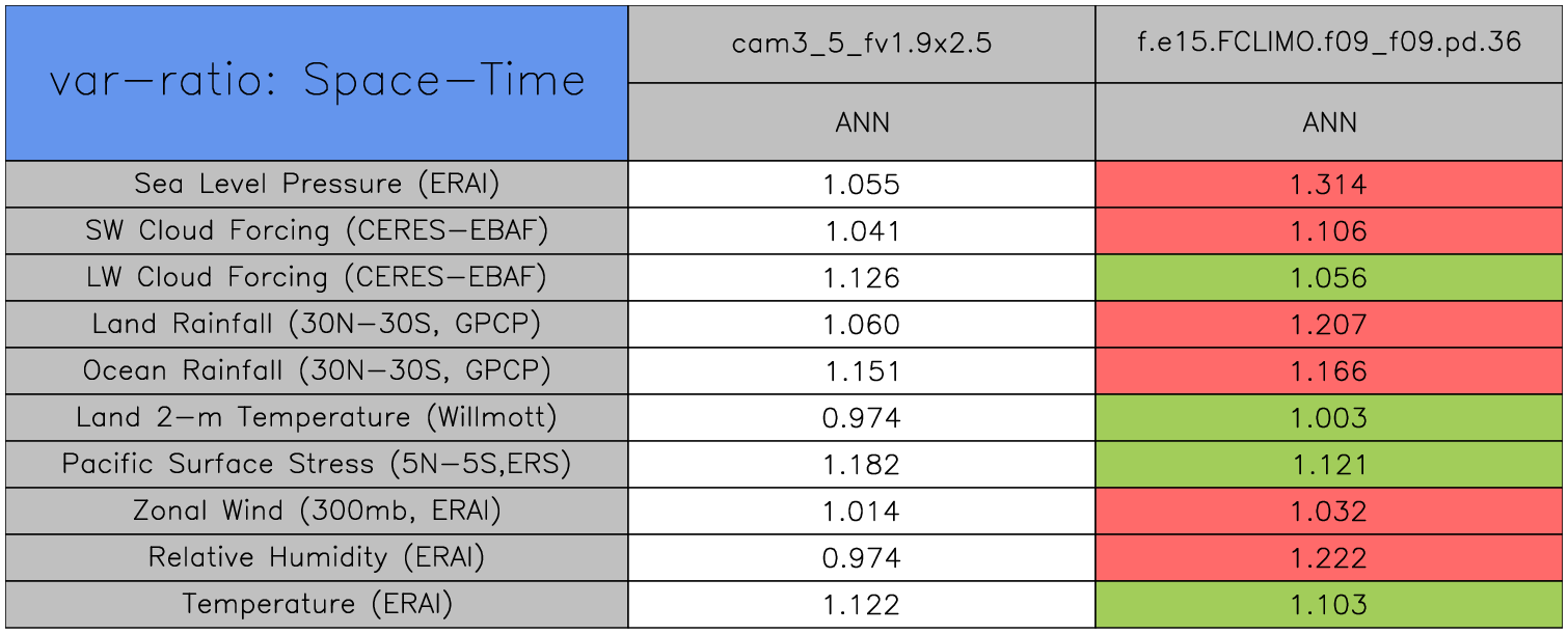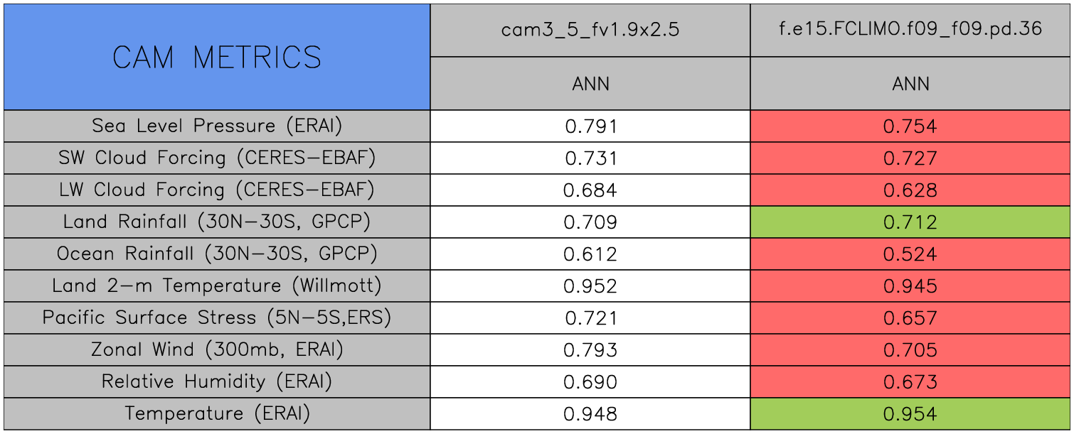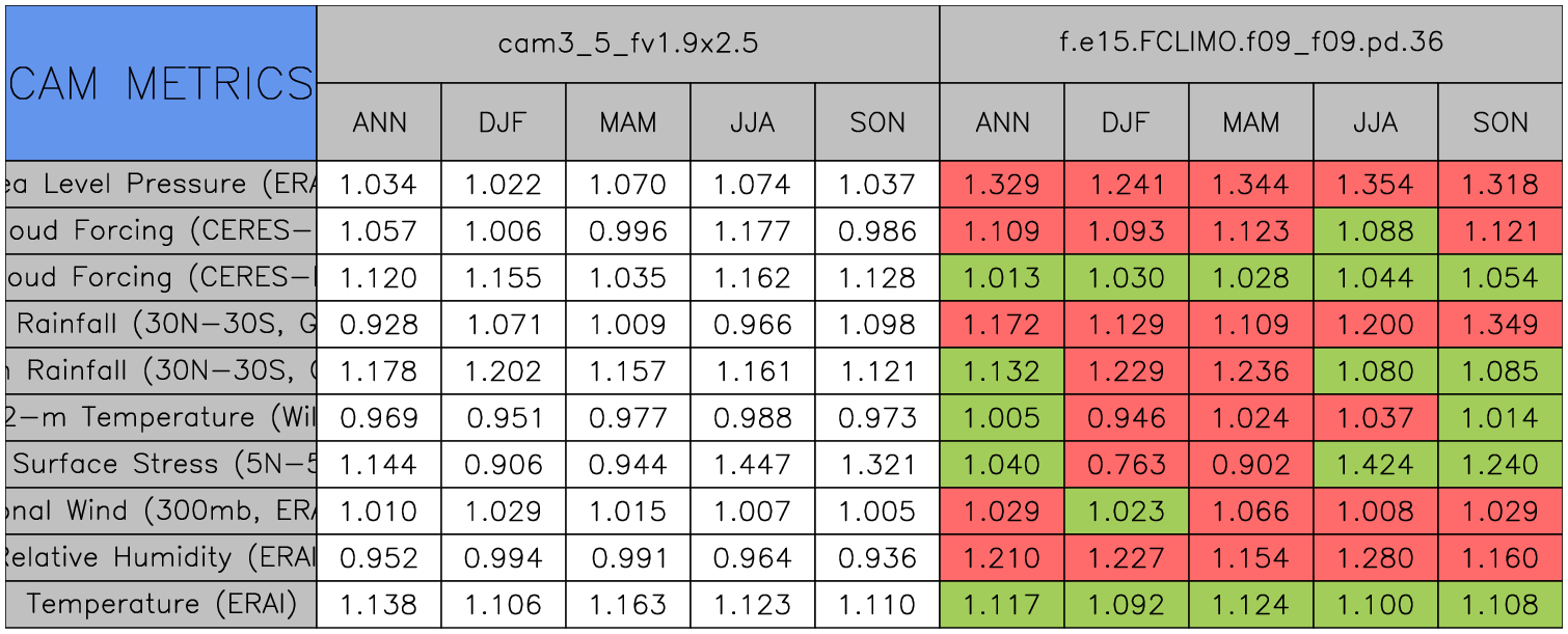 Taylor Diagrams were developed by Karl Taylor at PCMDI (paper|tech note) and aim to condense information about variance and RMSE characteristics of a particular model run when compared with observations in a single diagram. The tables summarize the individual metrics for each variable considered including: