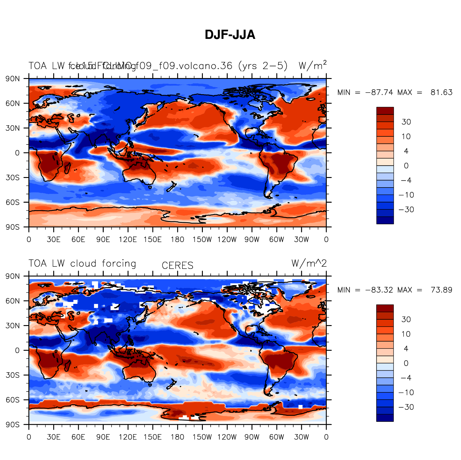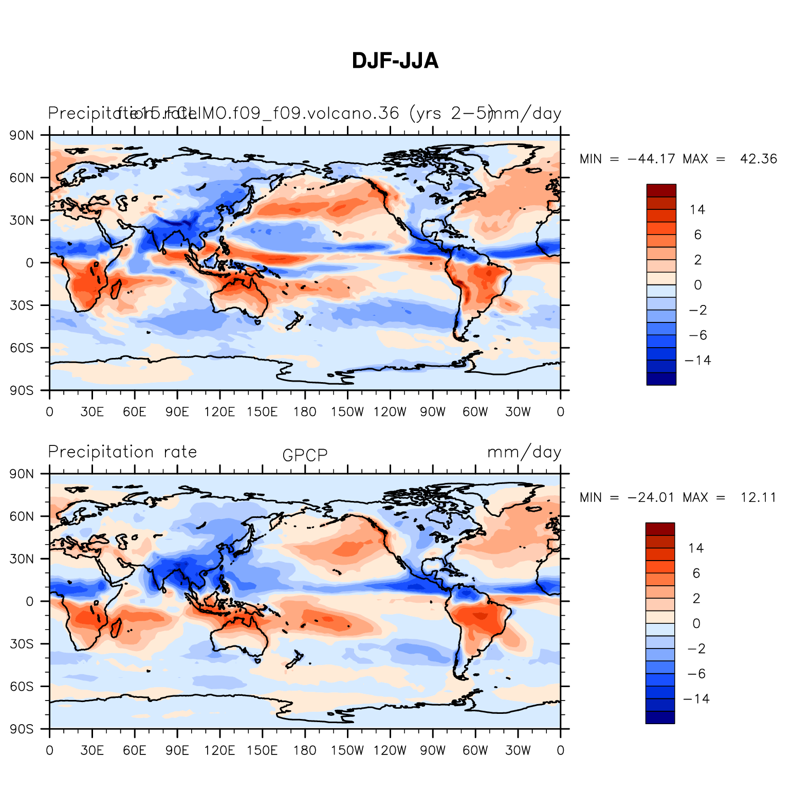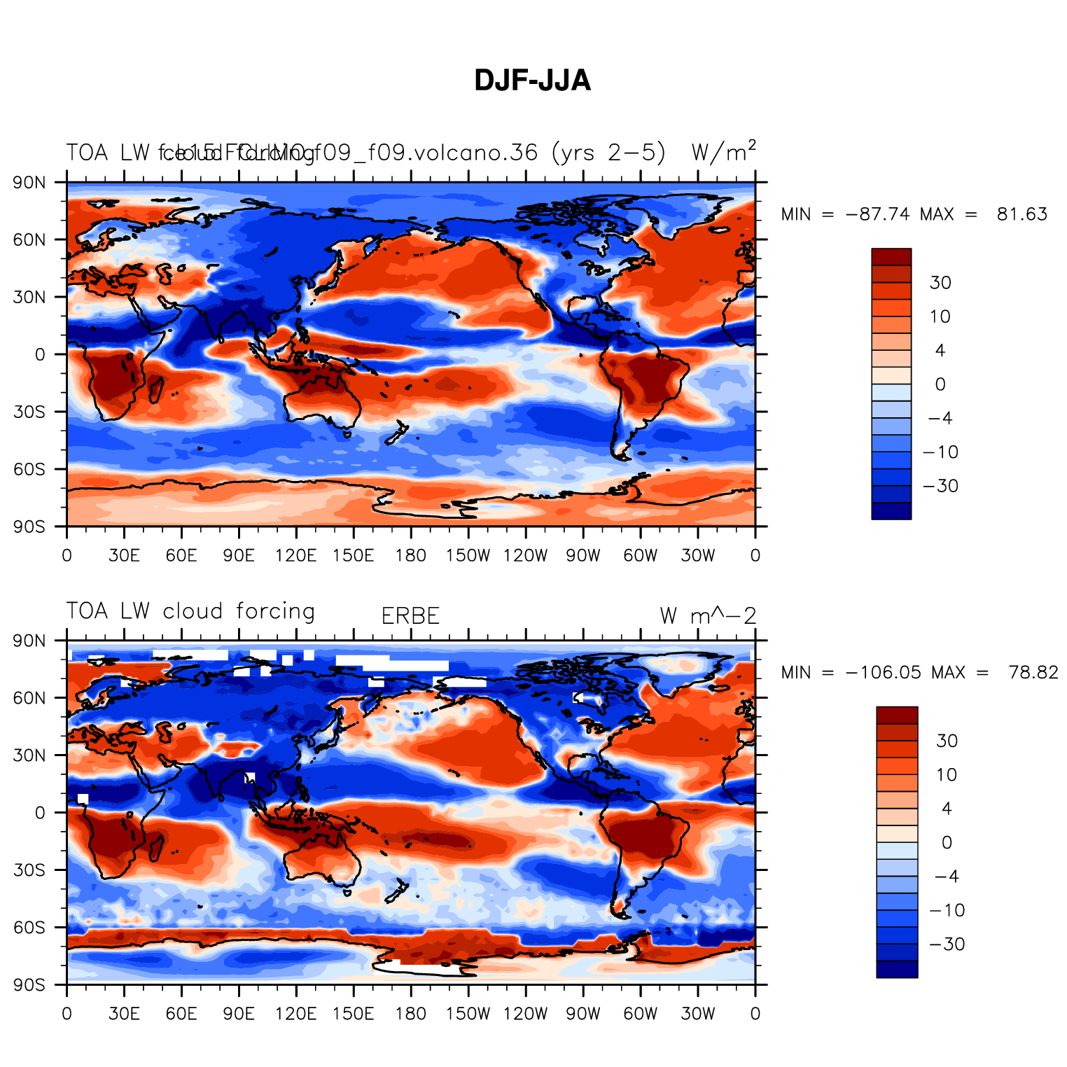 f.e15.FCLIMO.f09_f09.volcano.36 DIAG Set 9 - Horizontal contour plots of DJF-JJA differences