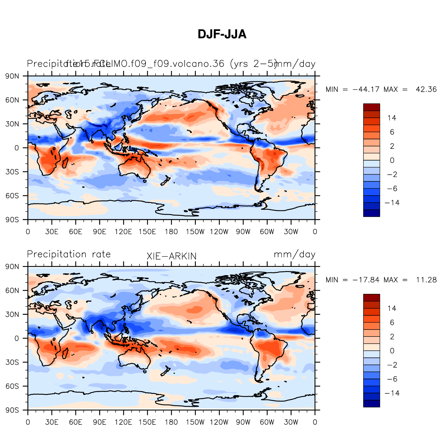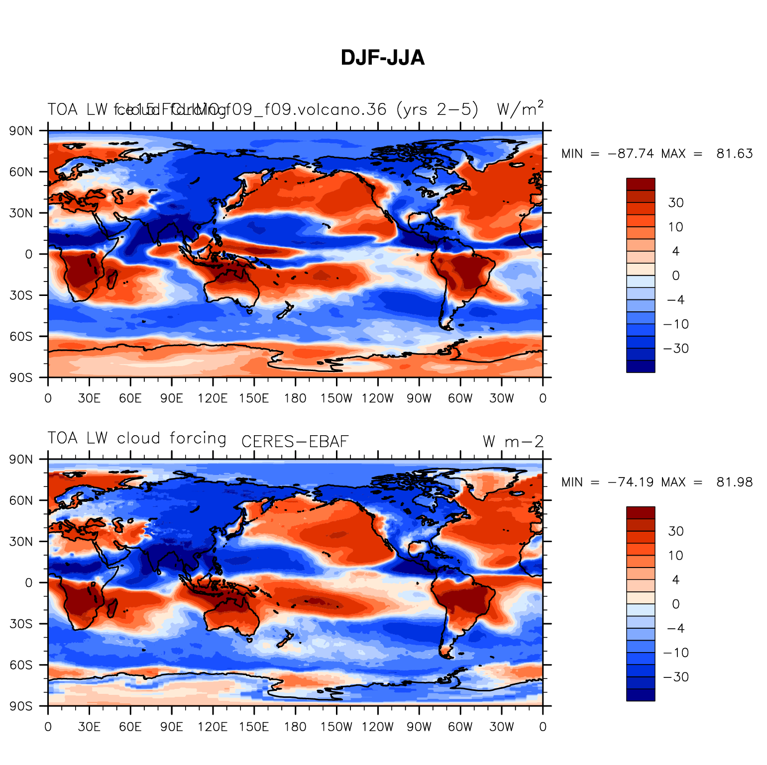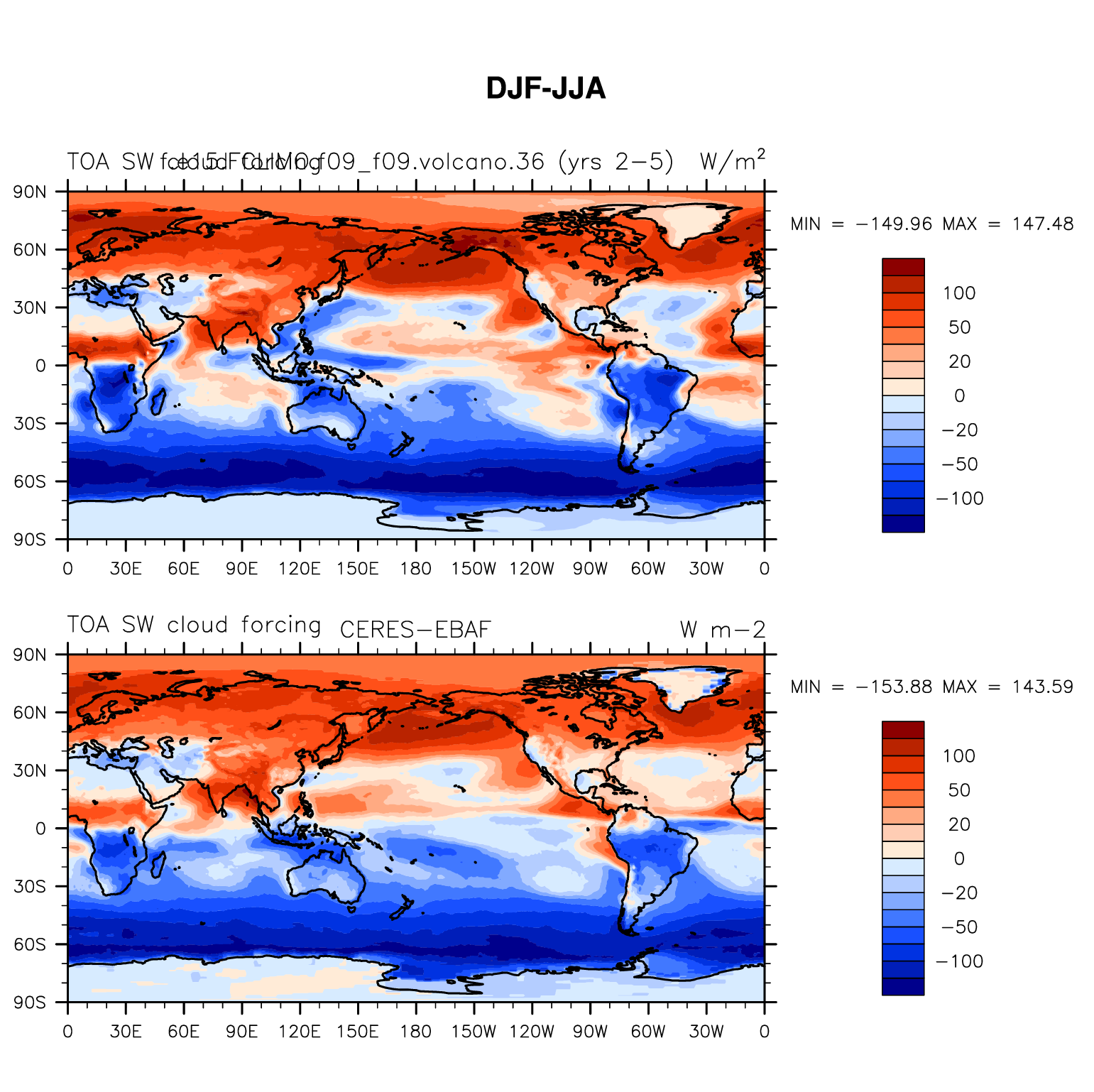 f.e15.FCLIMO.f09_f09.volcano.36 DIAG Set 9 - Horizontal contour plots of DJF-JJA differences