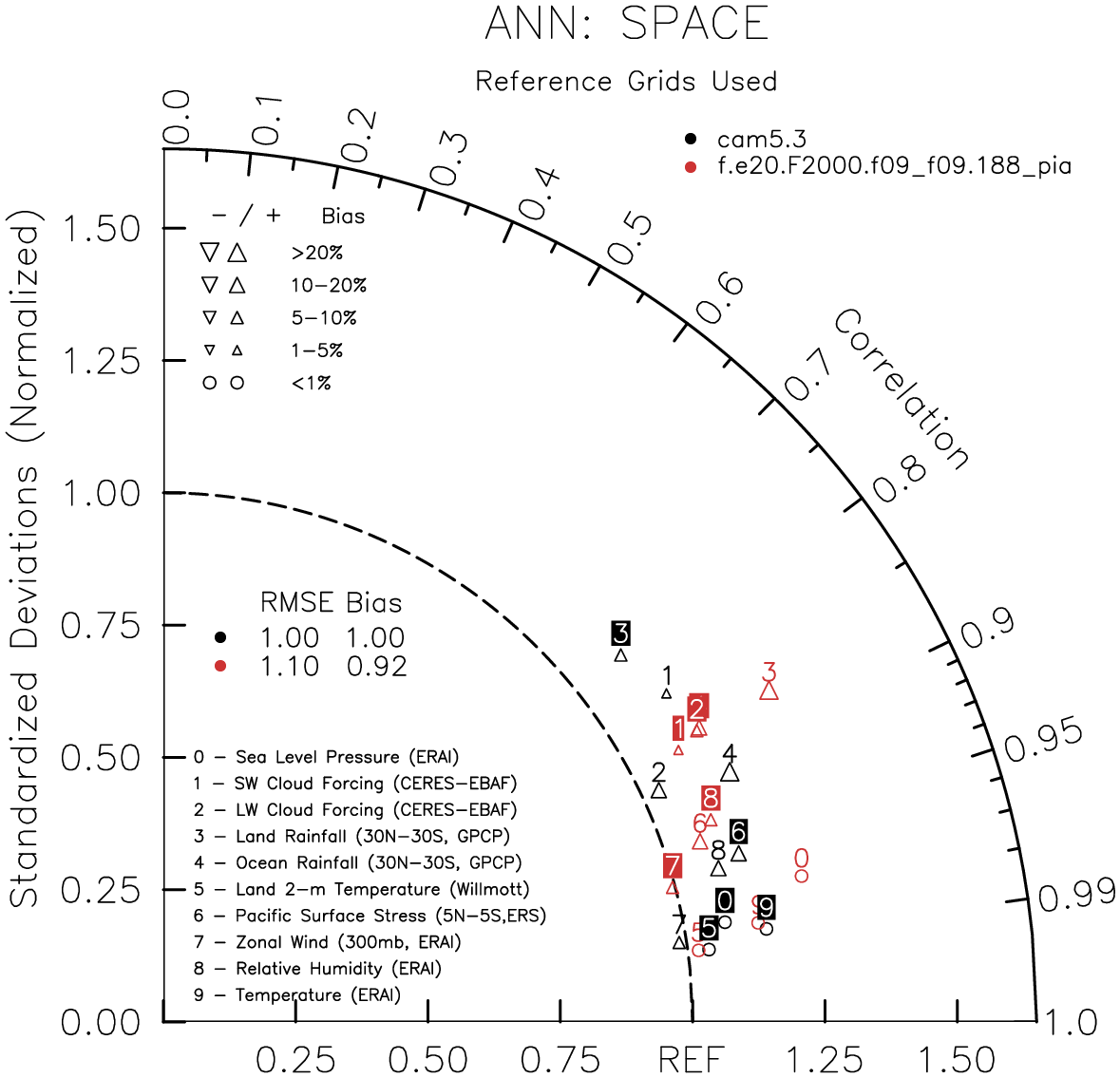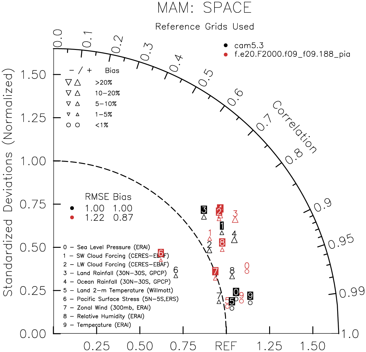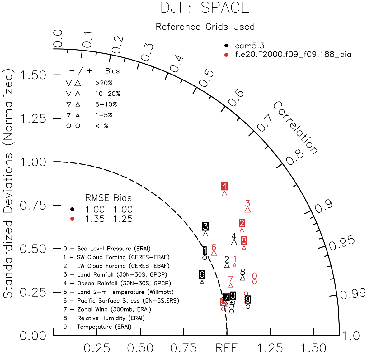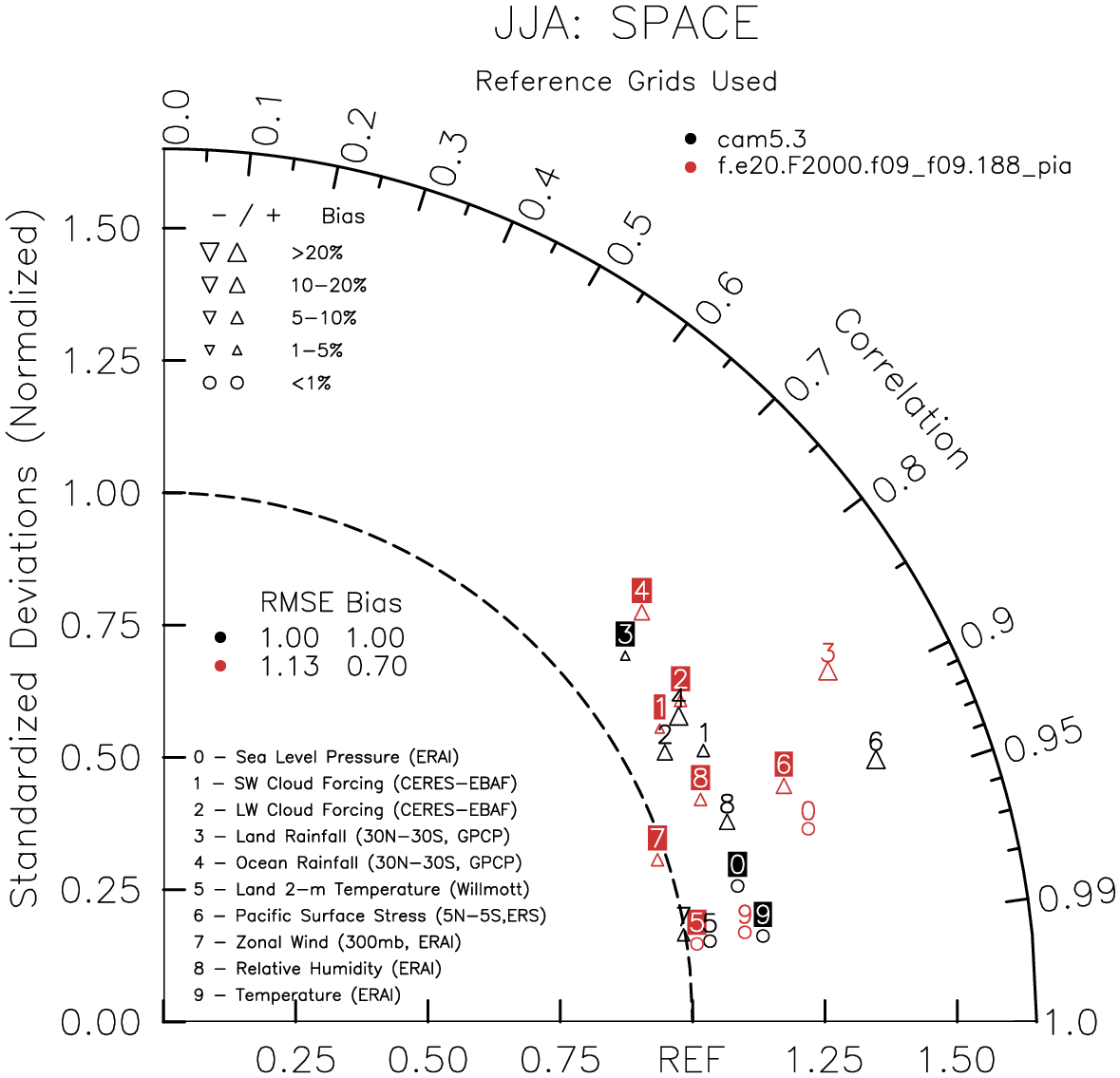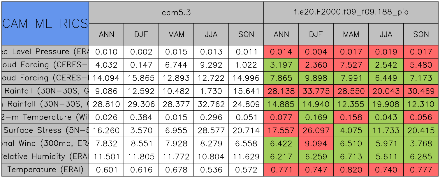 Taylor Diagrams were developed by Karl Taylor at PCMDI (paper|tech note) and aim to condense information about variance and RMSE characteristics of a particular model run when compared with observations in a single diagram. The tables summarize the individual metrics for each variable considered including: