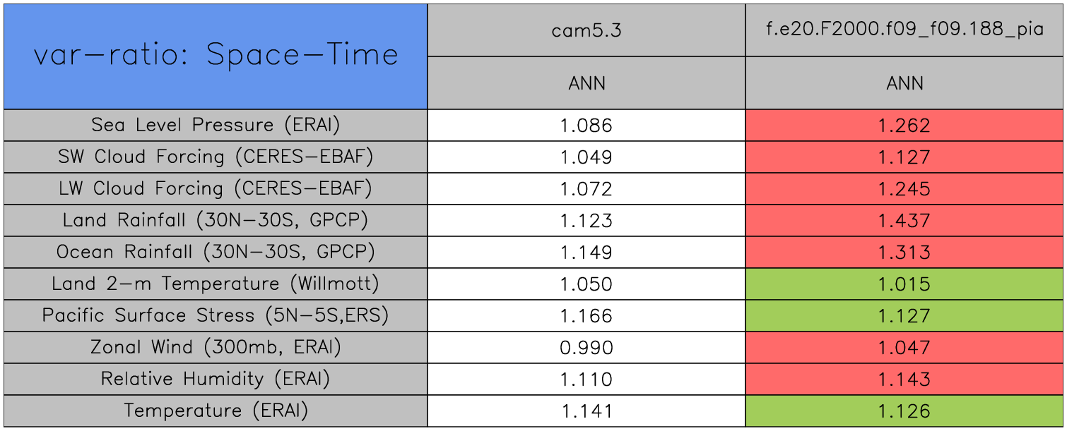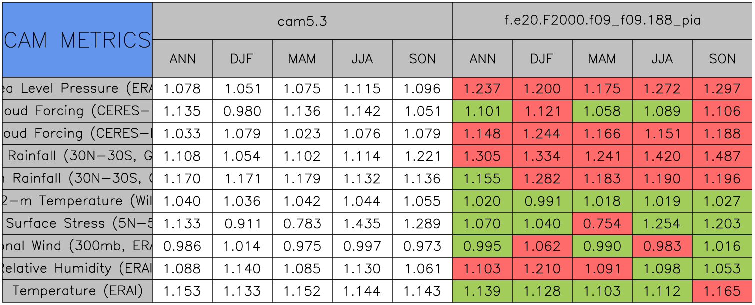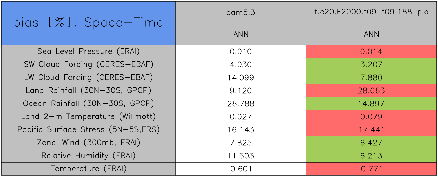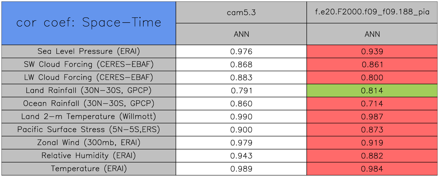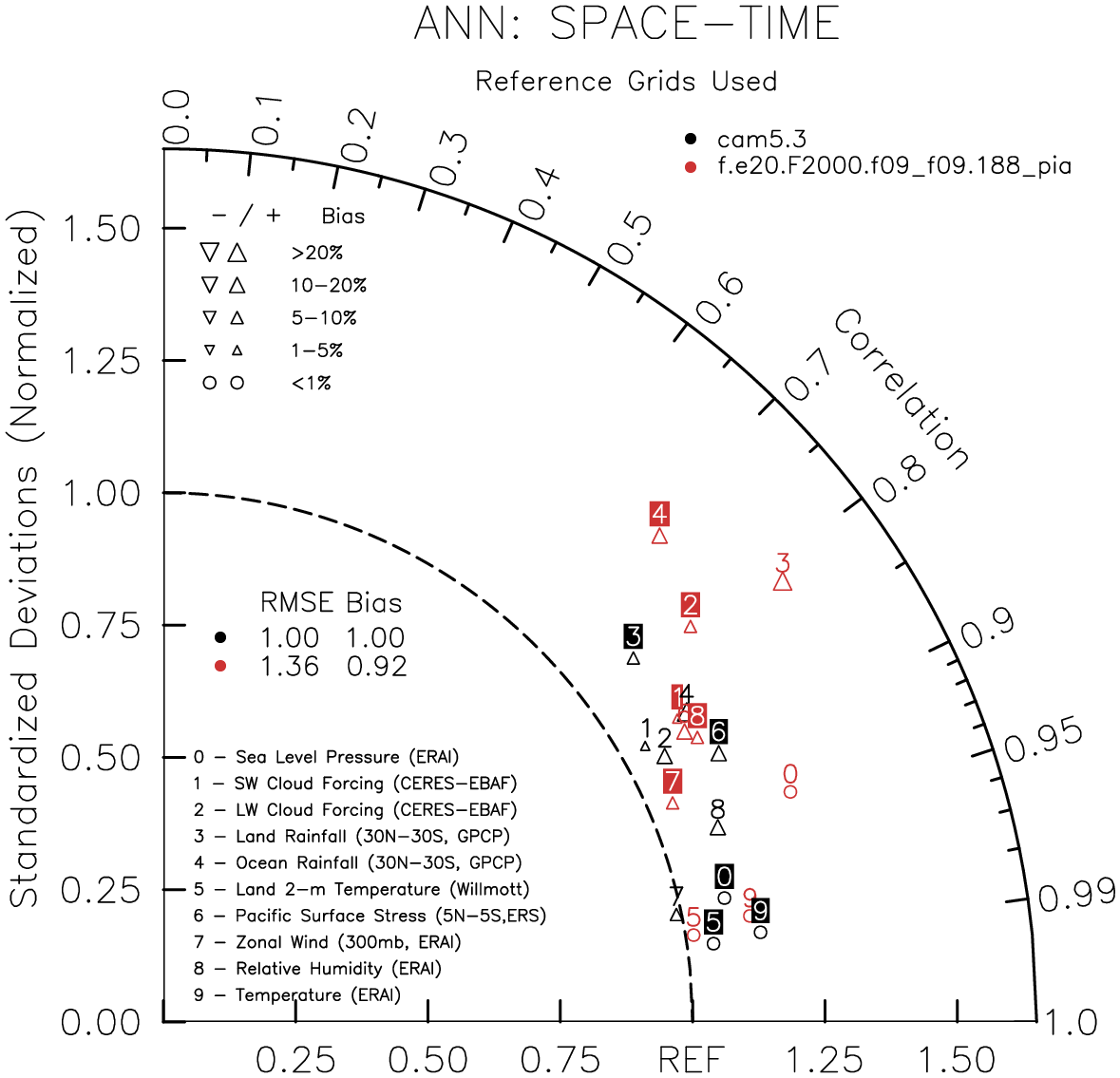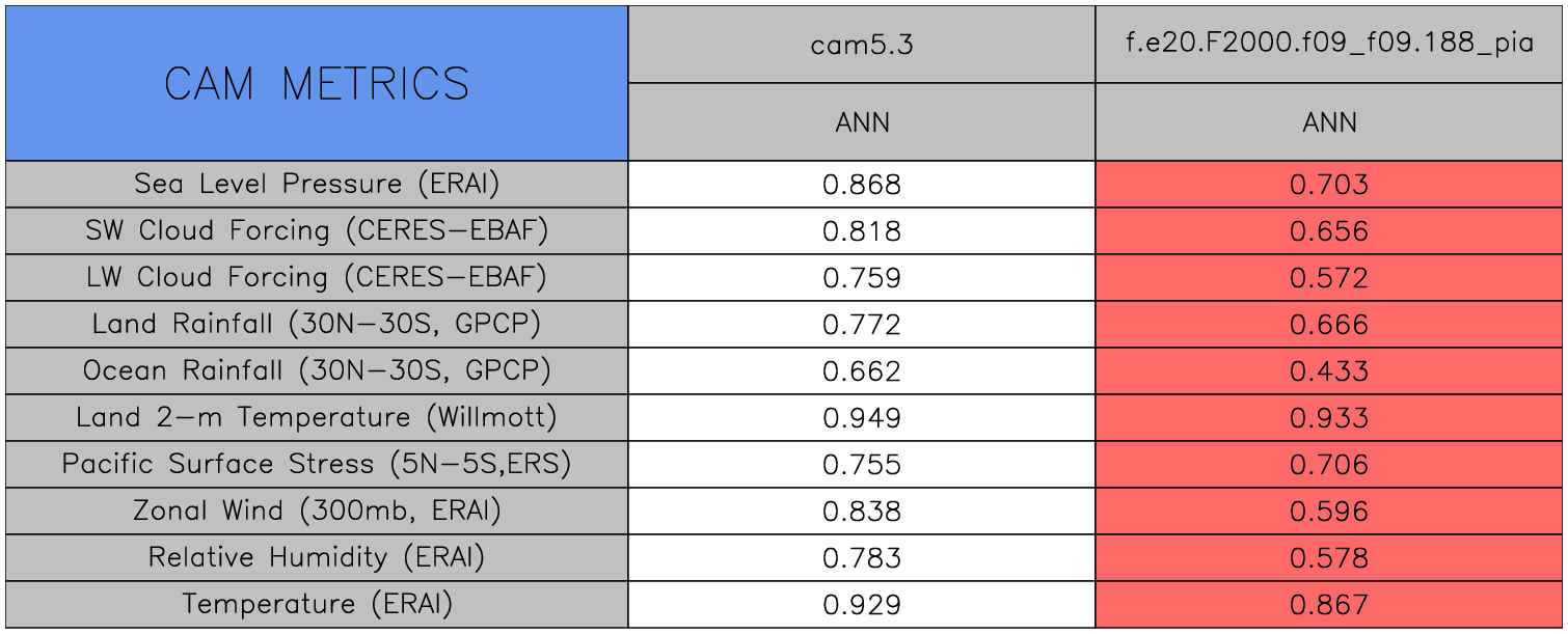 Taylor Diagrams were developed by Karl Taylor at PCMDI (paper|tech note) and aim to condense information about variance and RMSE characteristics of a particular model run when compared with observations in a single diagram. The tables summarize the individual metrics for each variable considered including: