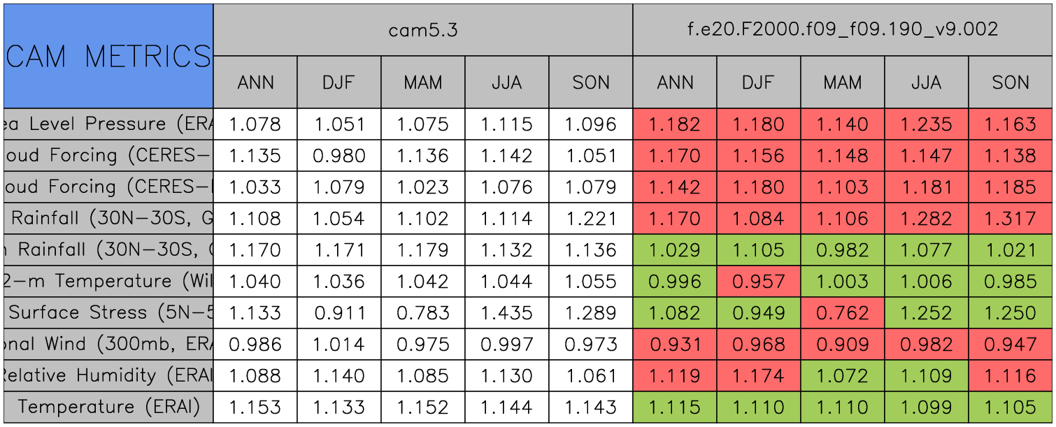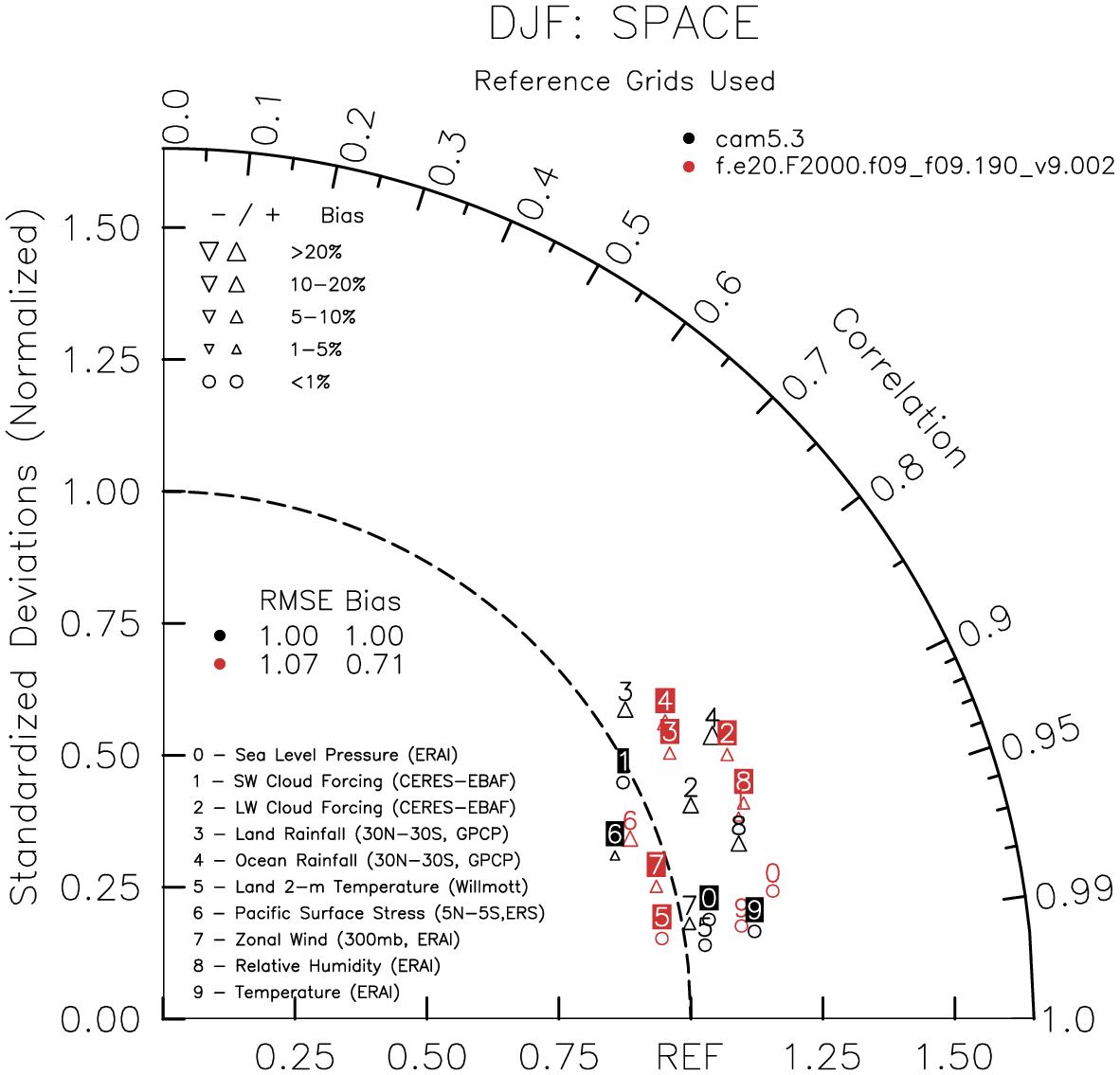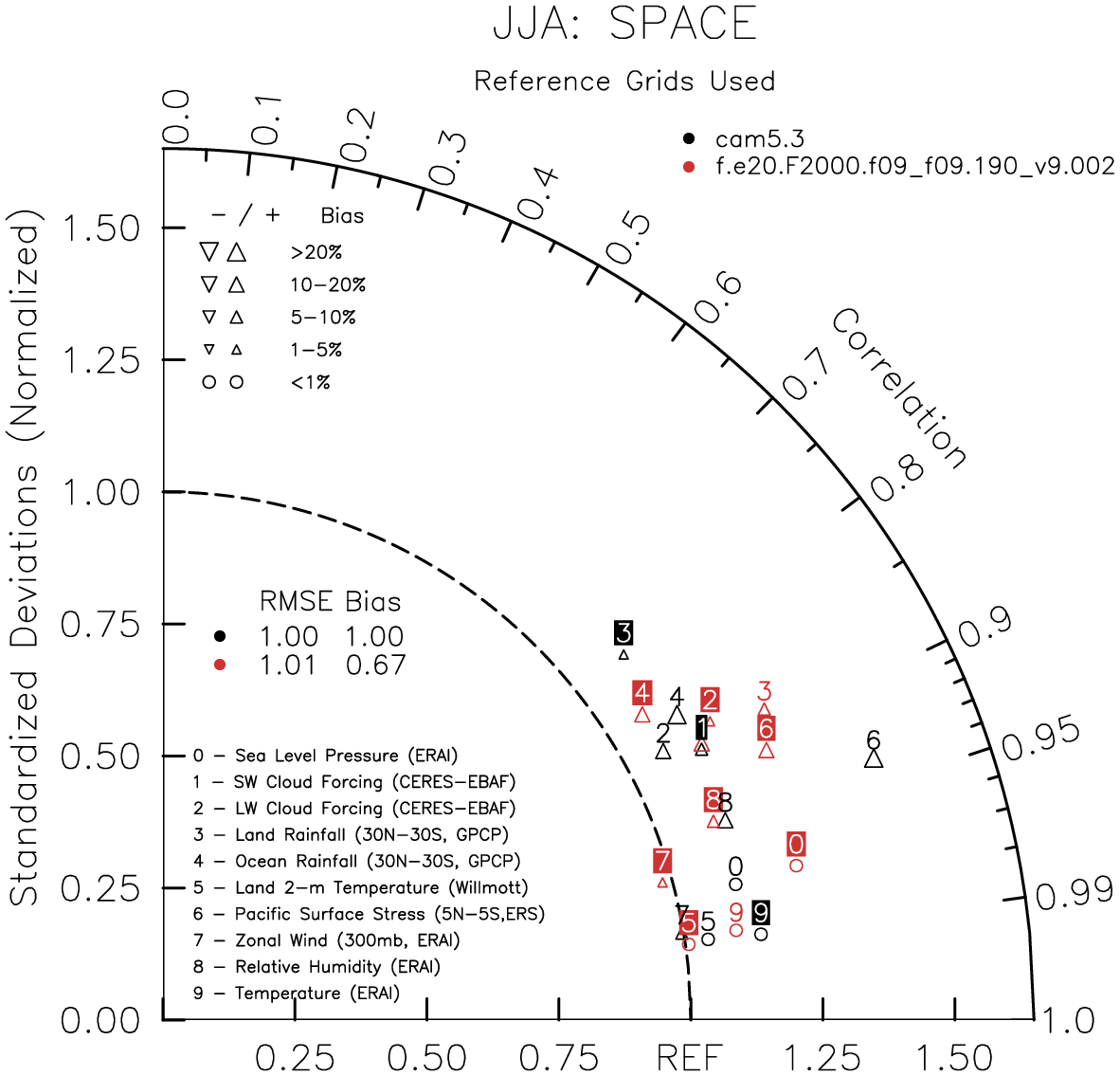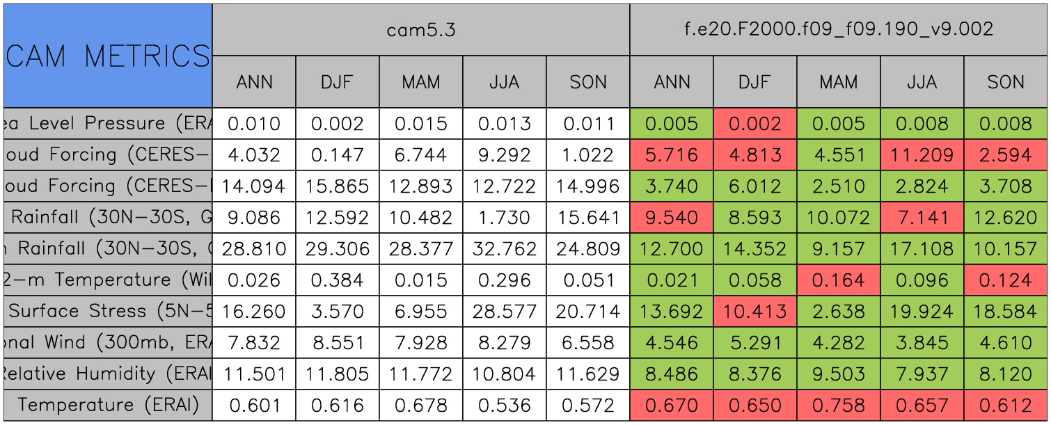 Taylor Diagrams were developed by Karl Taylor at PCMDI (paper|tech note) and aim to condense information about variance and RMSE characteristics of a particular model run when compared with observations in a single diagram. The tables summarize the individual metrics for each variable considered including: