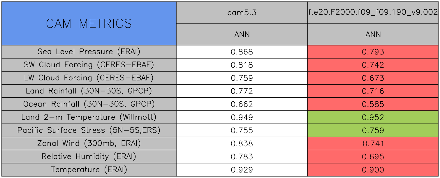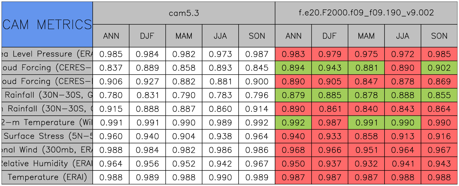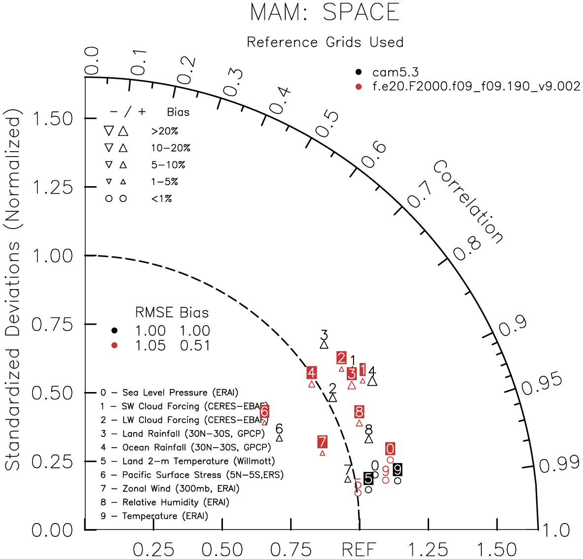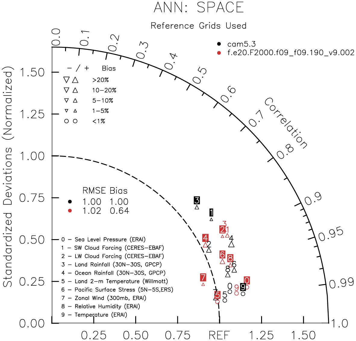 Taylor Diagrams were developed by Karl Taylor at PCMDI (paper|tech note) and aim to condense information about variance and RMSE characteristics of a particular model run when compared with observations in a single diagram. The tables summarize the individual metrics for each variable considered including:
