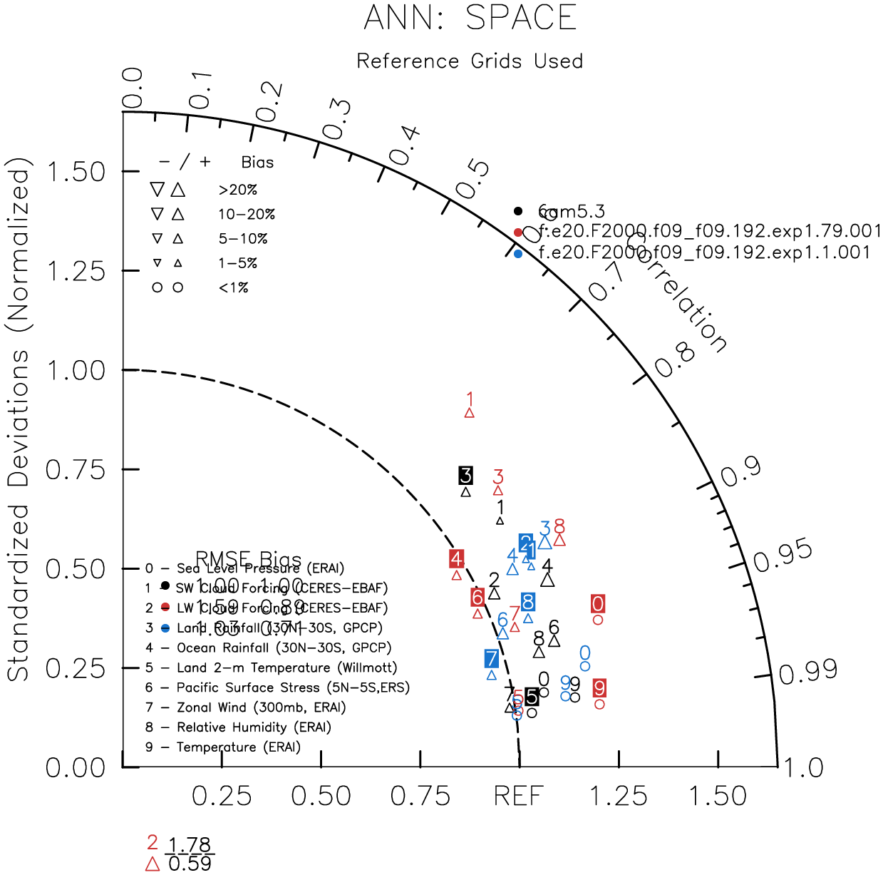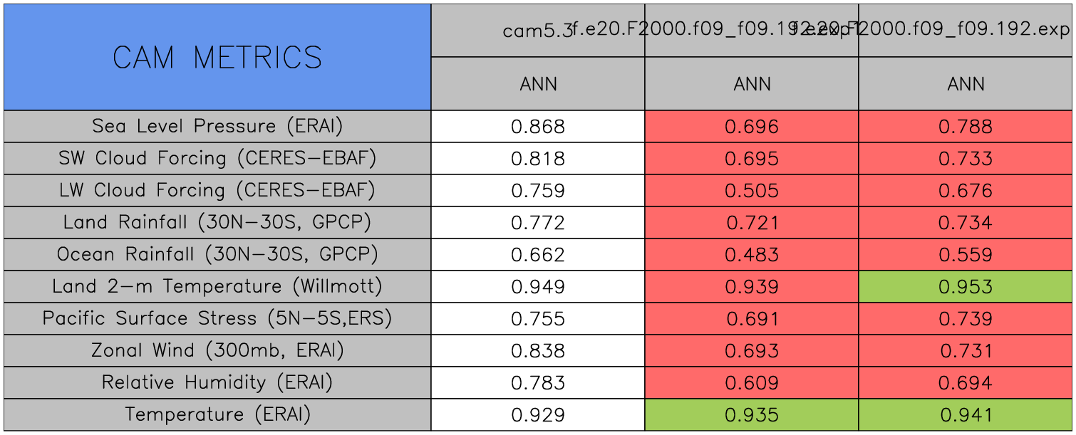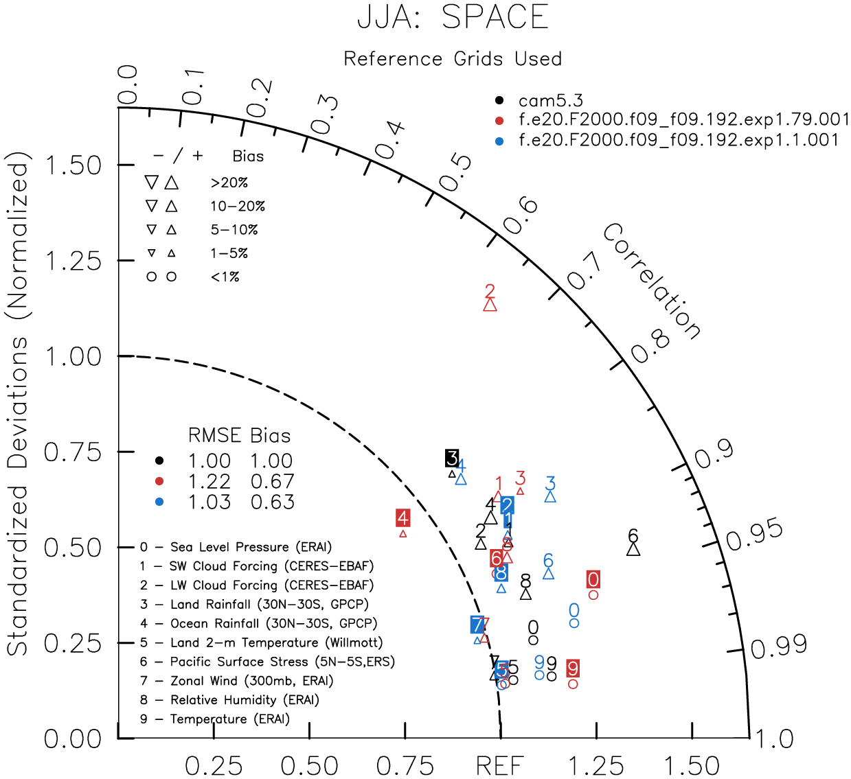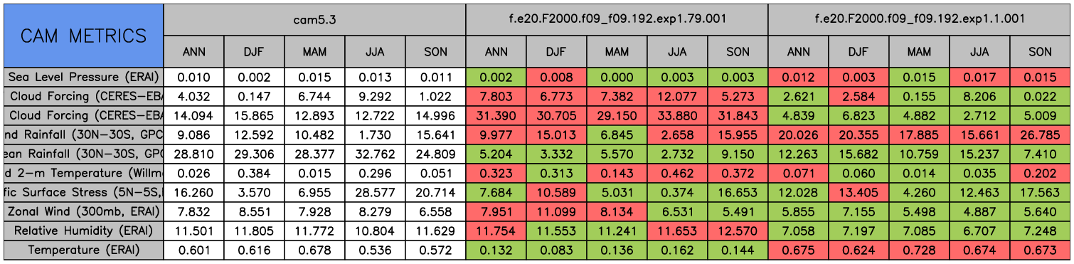 Taylor Diagrams were developed by Karl Taylor at PCMDI (paper|tech note) and aim to condense information about variance and RMSE characteristics of a particular model run when compared with observations in a single diagram. The tables summarize the individual metrics for each variable considered including: