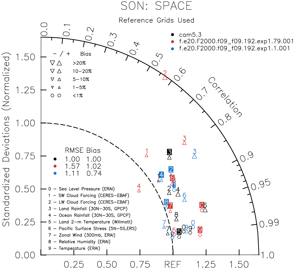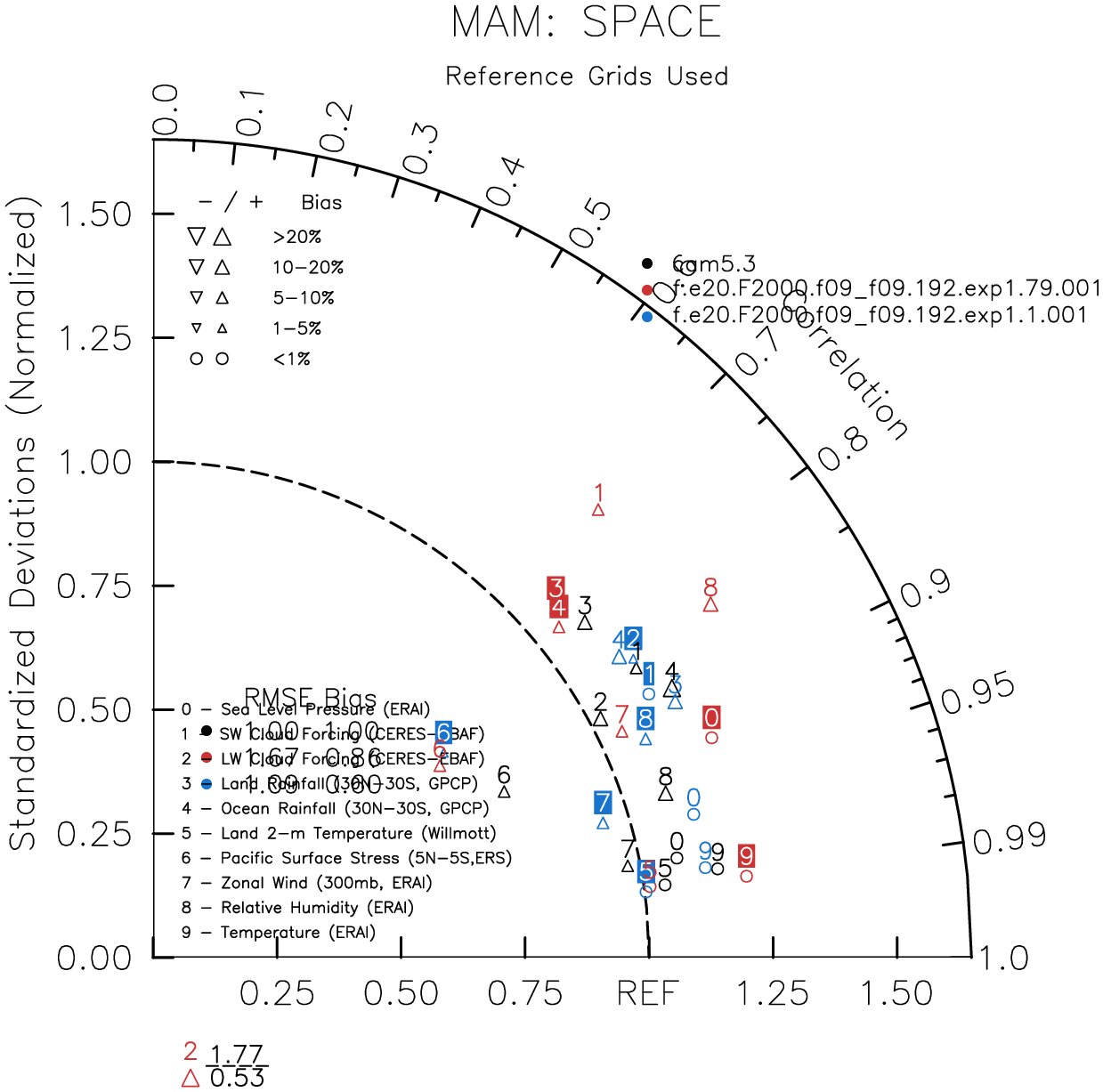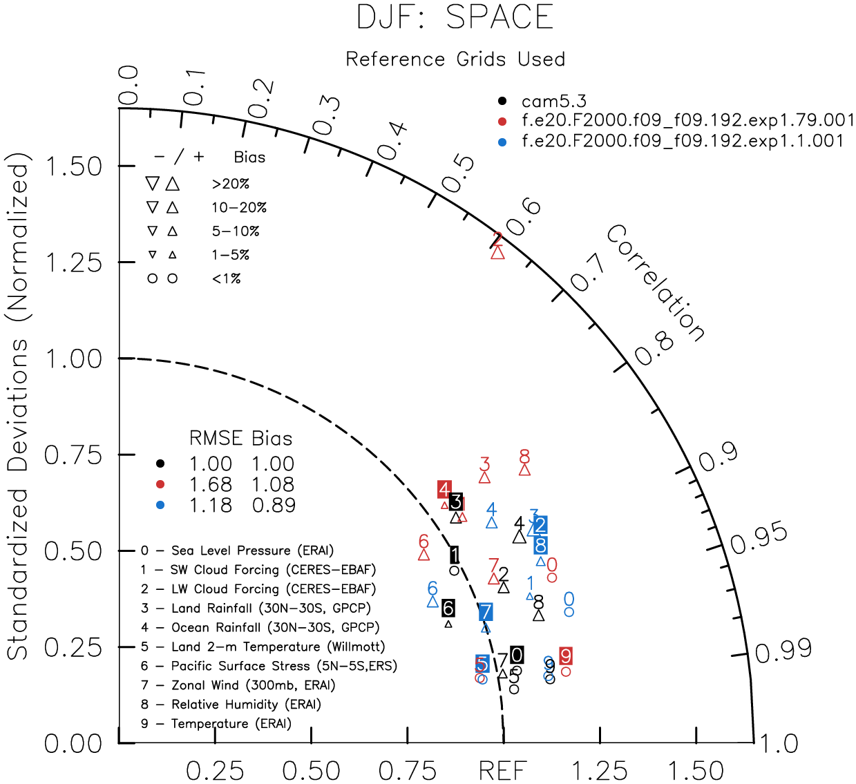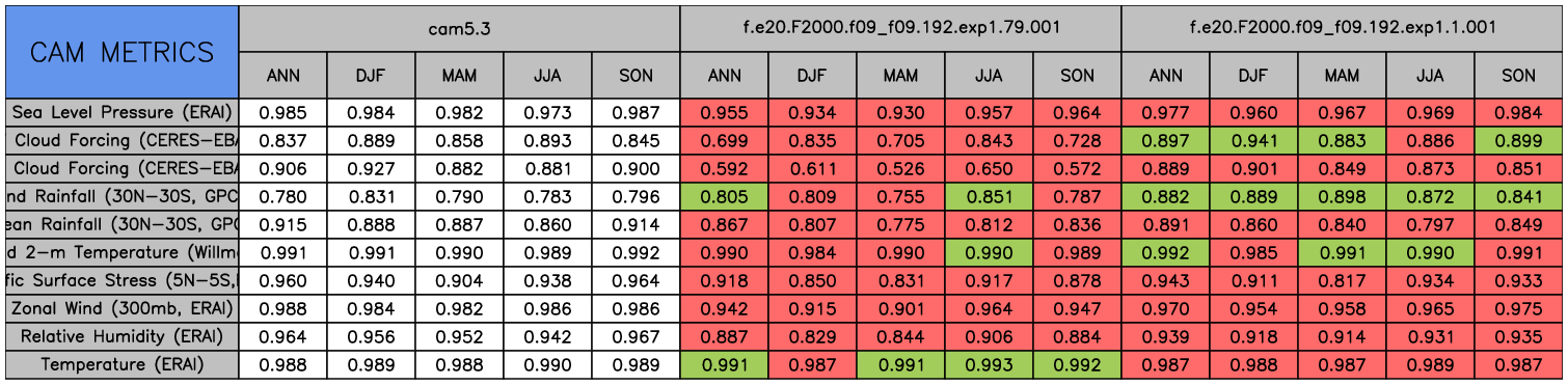 Taylor Diagrams were developed by Karl Taylor at PCMDI (paper|tech note) and aim to condense information about variance and RMSE characteristics of a particular model run when compared with observations in a single diagram. The tables summarize the individual metrics for each variable considered including: