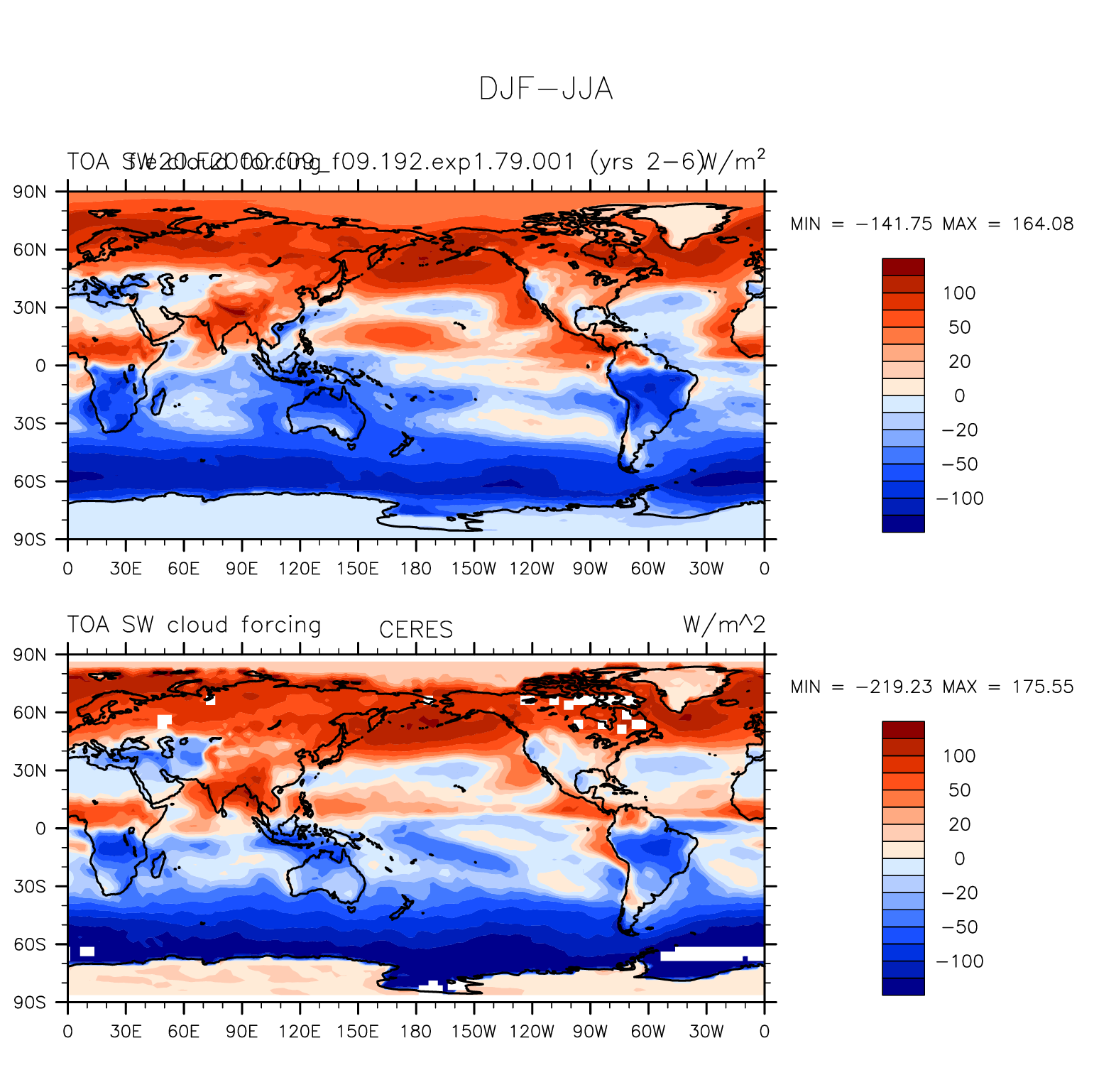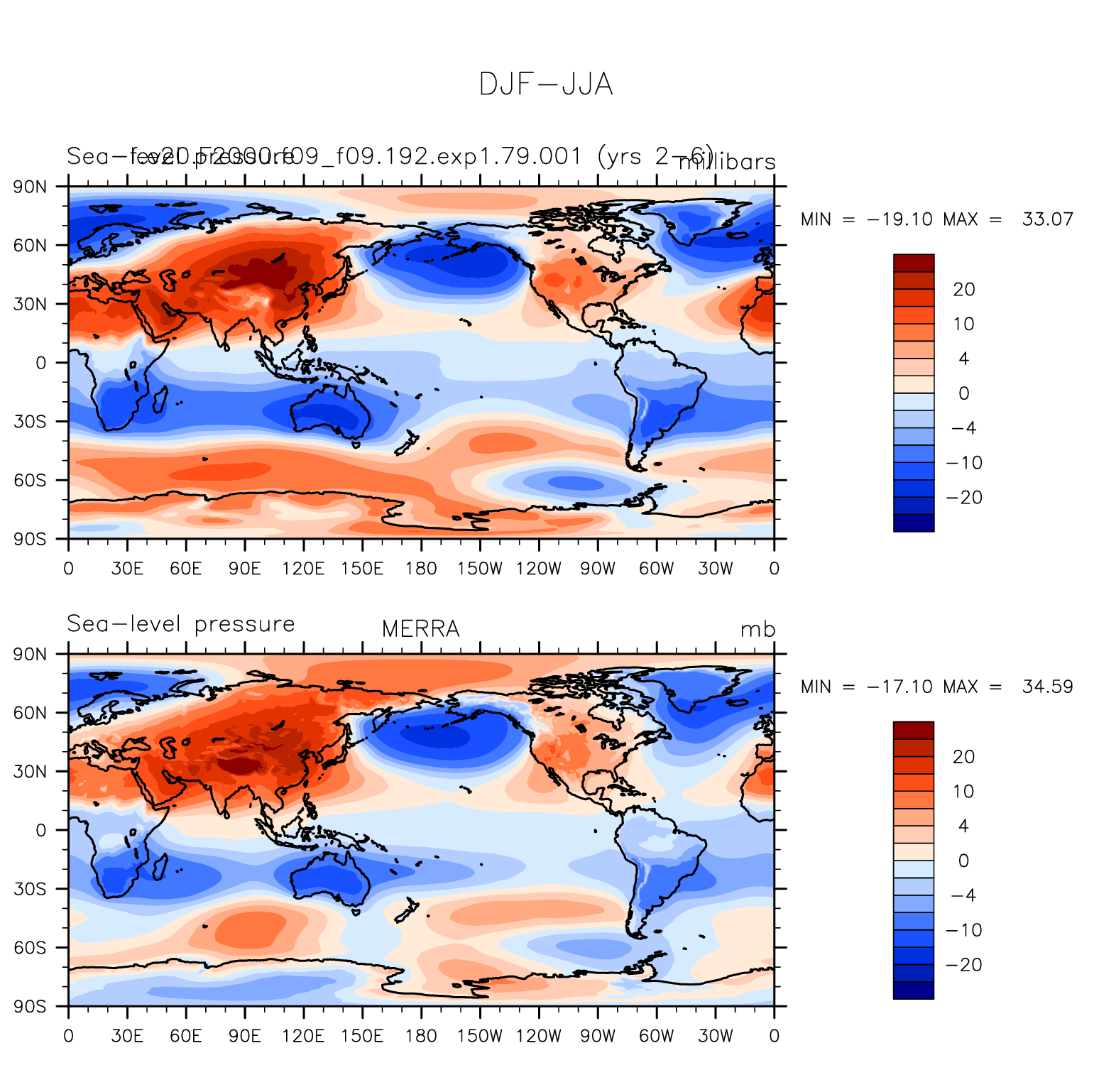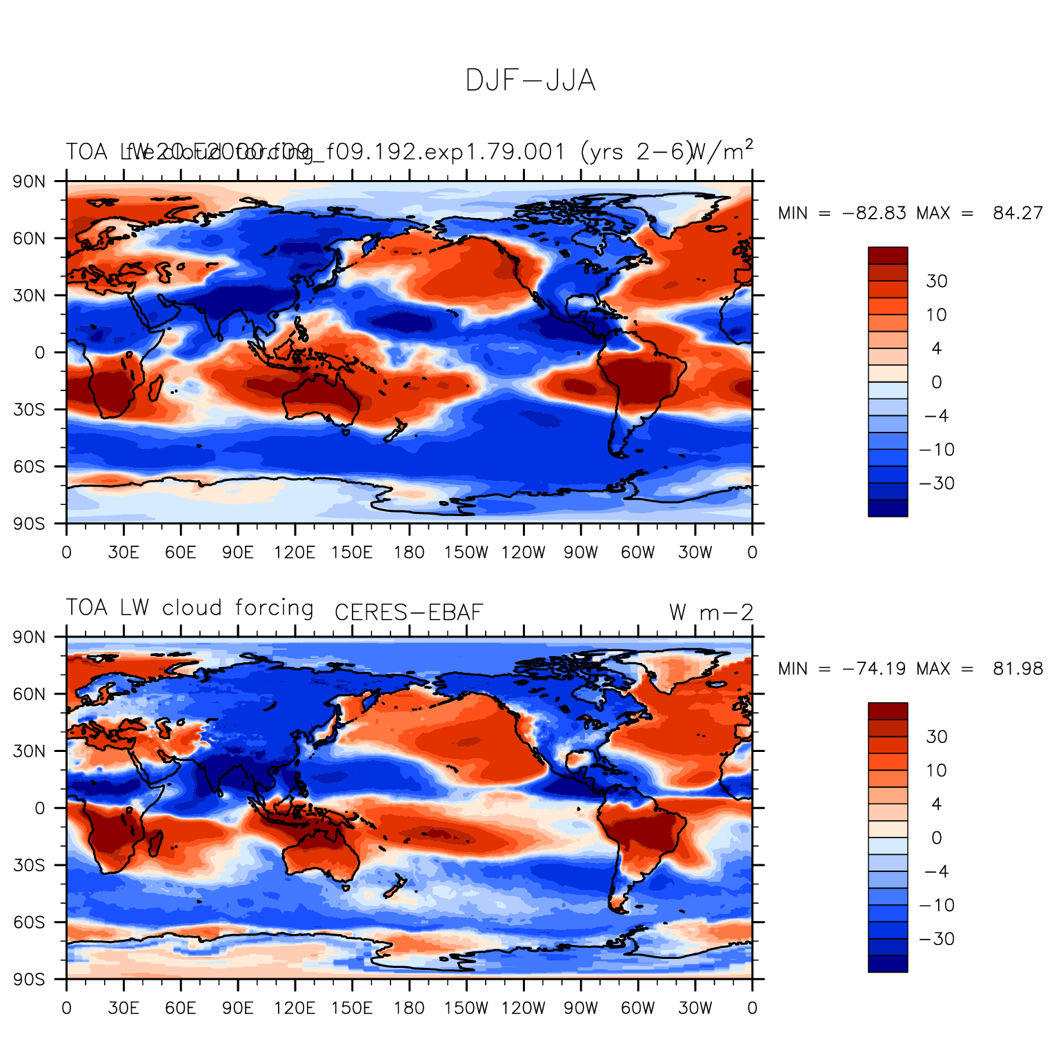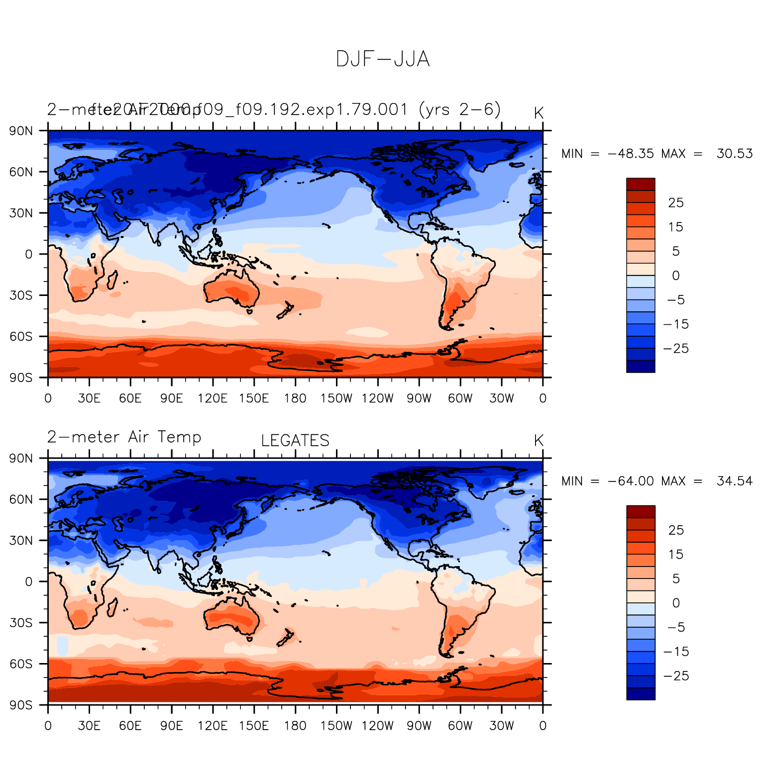 f.e20.F2000.f09_f09.192.exp1.79.001 DIAG Set 9 - Horizontal contour plots of DJF-JJA differences