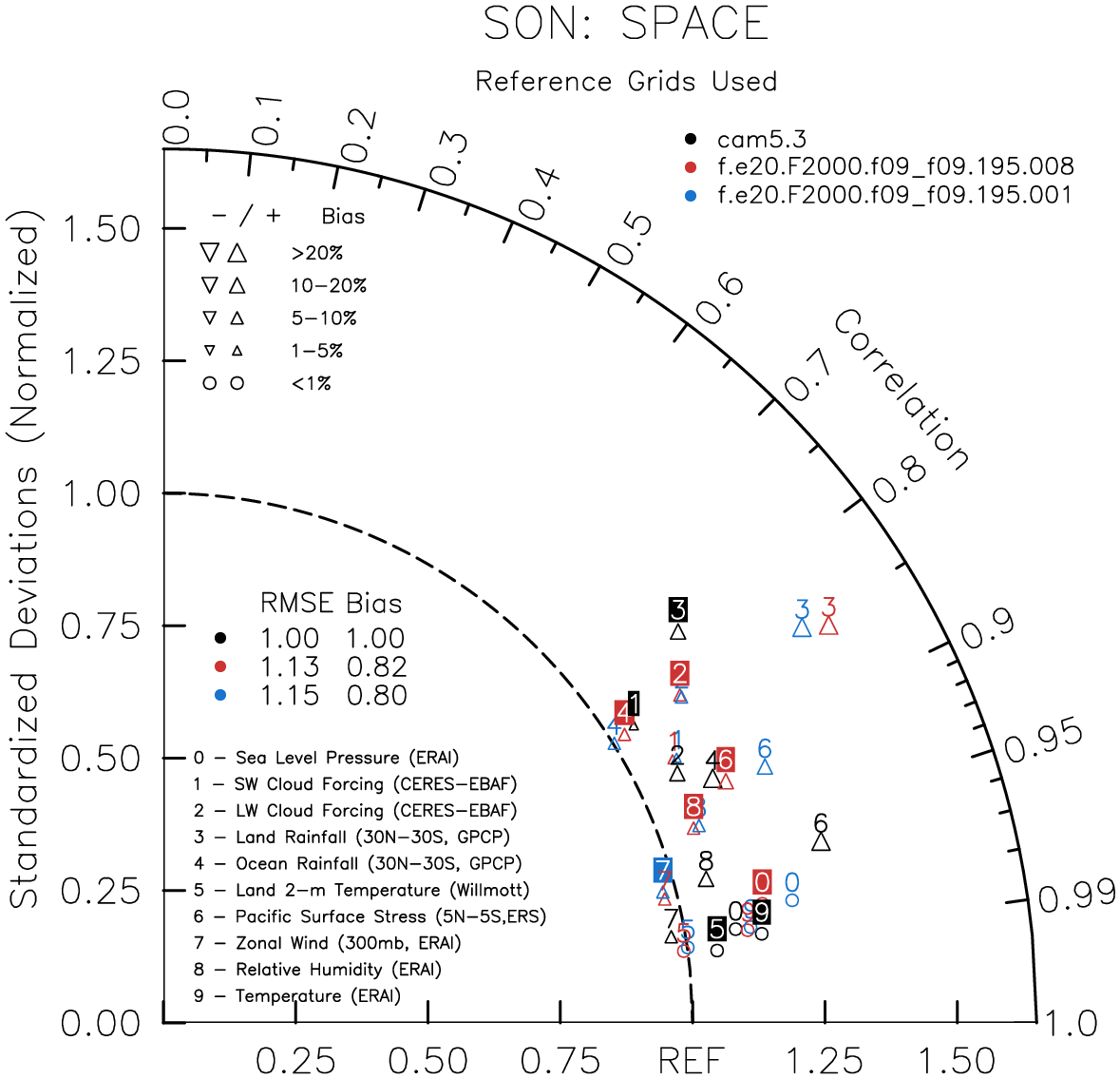Taylor Diagrams were developed by Karl Taylor at PCMDI (paper|tech note) and aim to condense information about variance and RMSE characteristics of a particular model run when compared with observations in a single diagram. The tables summarize the individual metrics for each variable considered including: