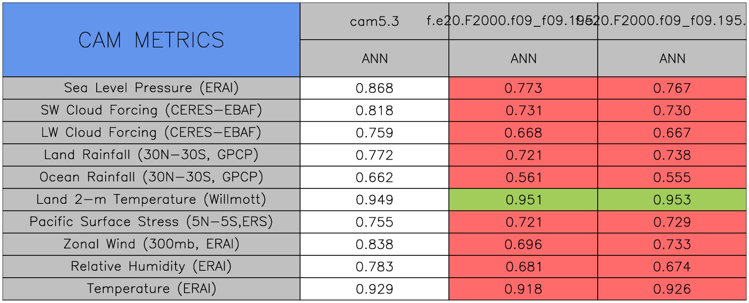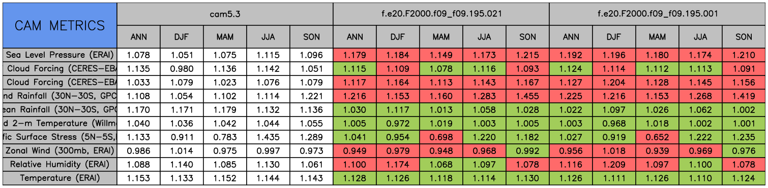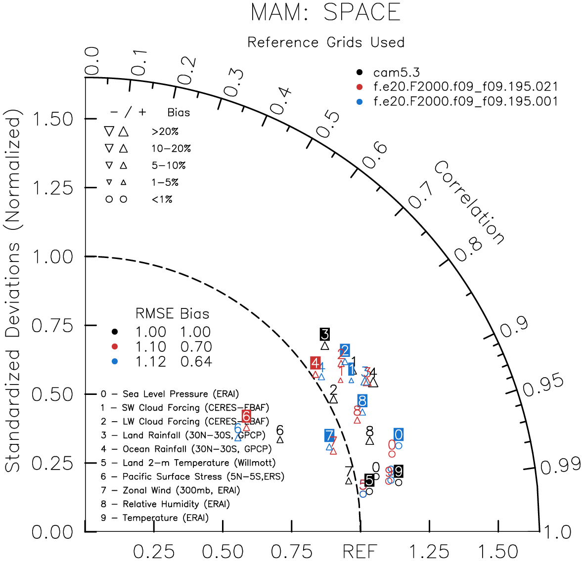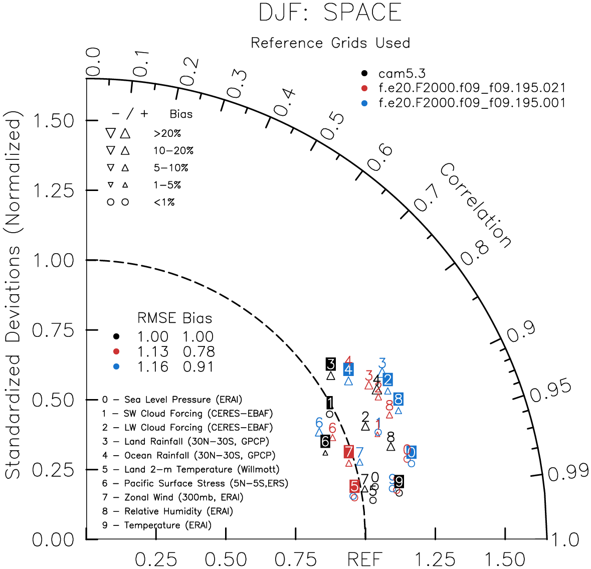 Taylor Diagrams were developed by Karl Taylor at PCMDI (paper|tech note) and aim to condense information about variance and RMSE characteristics of a particular model run when compared with observations in a single diagram. The tables summarize the individual metrics for each variable considered including: