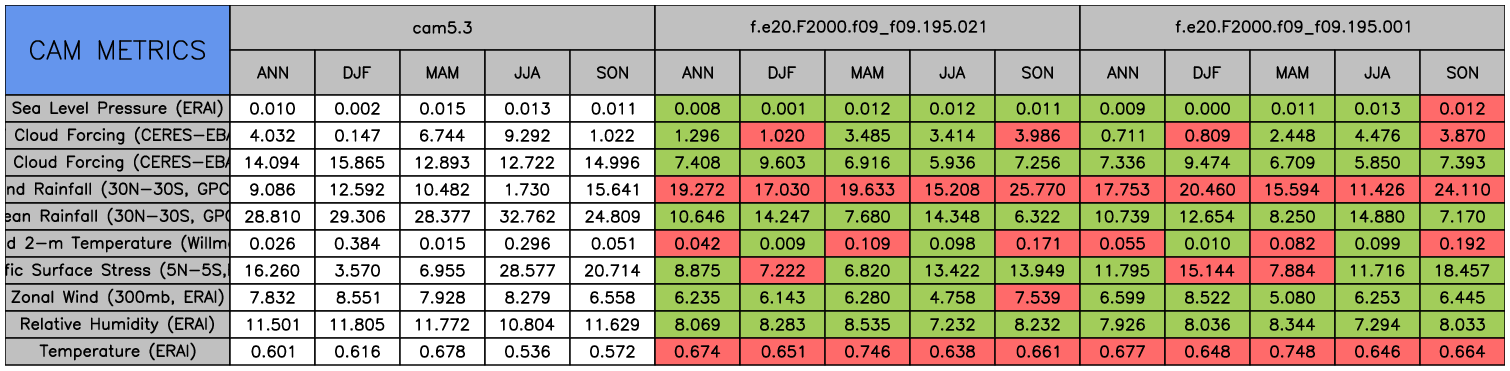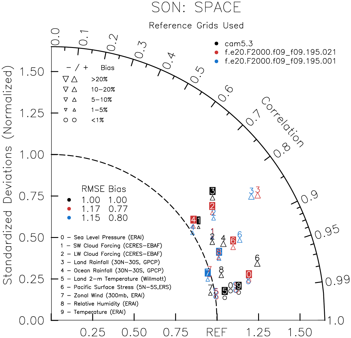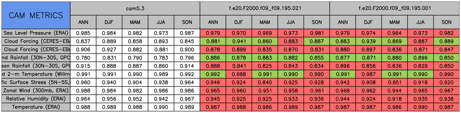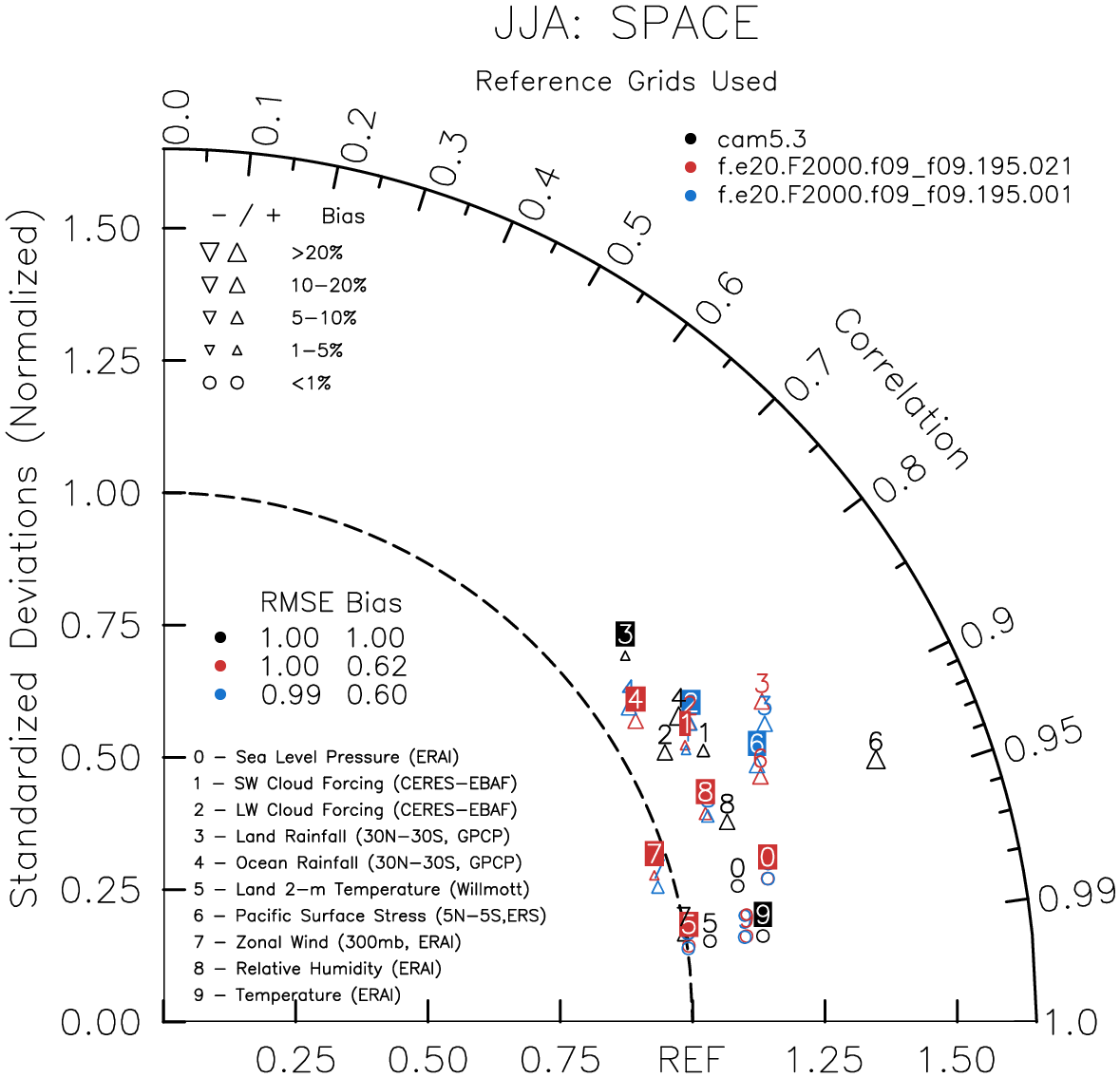 Taylor Diagrams were developed by Karl Taylor at PCMDI (paper|tech note) and aim to condense information about variance and RMSE characteristics of a particular model run when compared with observations in a single diagram. The tables summarize the individual metrics for each variable considered including:
