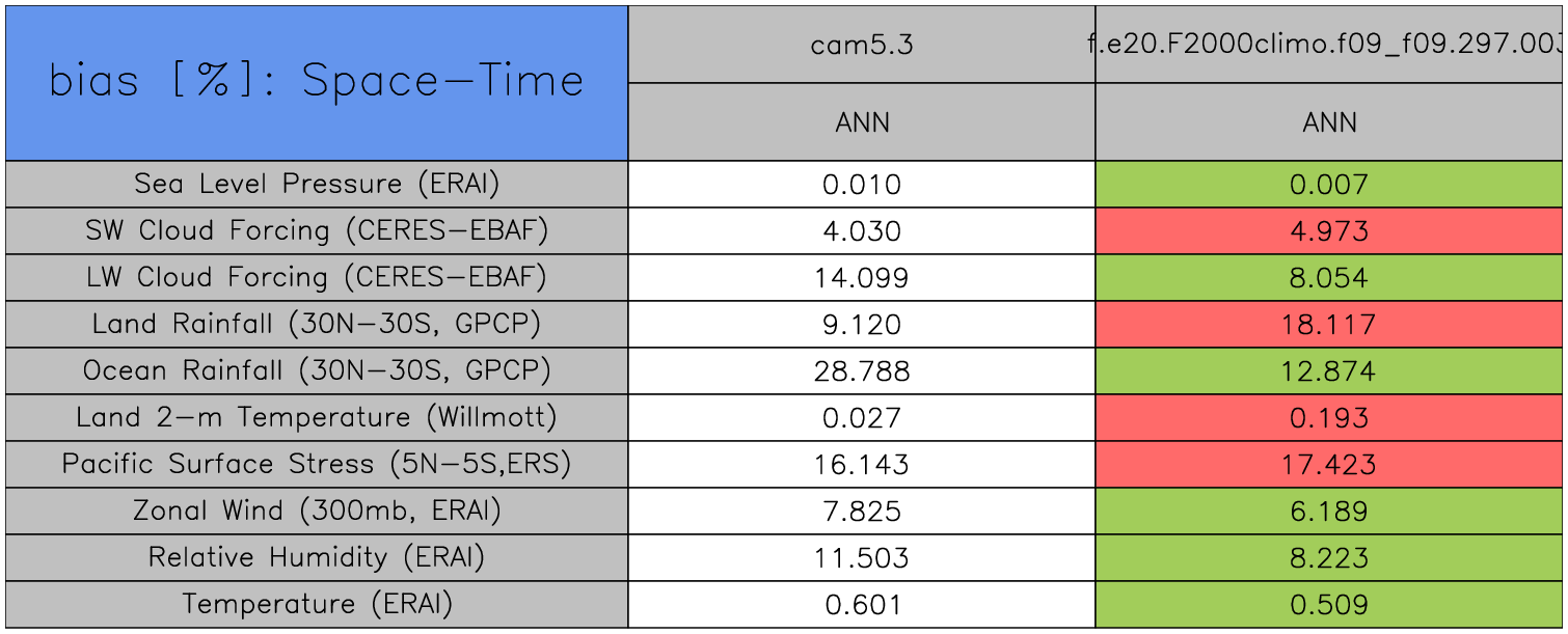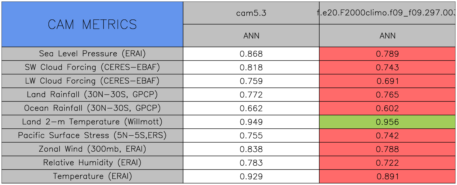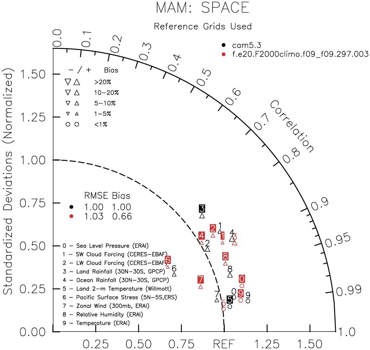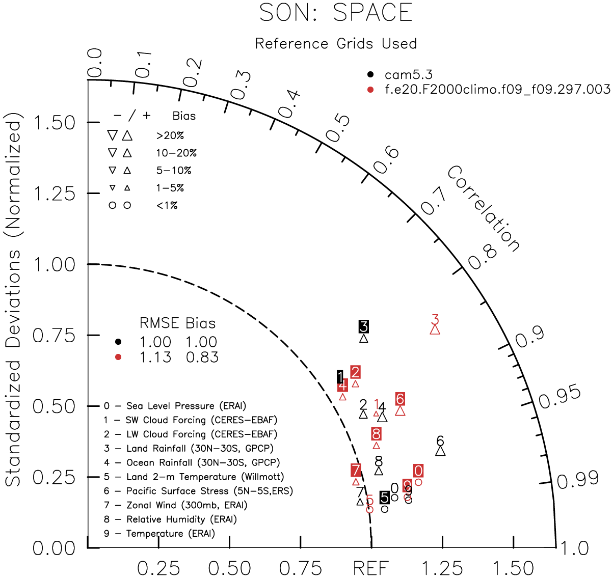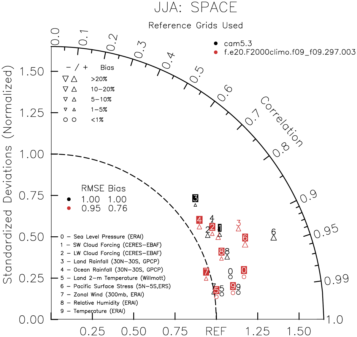 Taylor Diagrams were developed by Karl Taylor at PCMDI (paper|tech note) and aim to condense information about variance and RMSE characteristics of a particular model run when compared with observations in a single diagram. The tables summarize the individual metrics for each variable considered including: