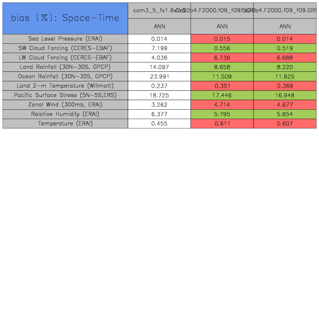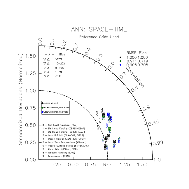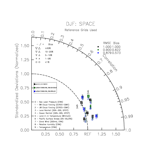 Taylor Diagrams were developed by Karl Taylor at PCMDI (paper|tech note) and aim to condense information about variance and RMSE characteristics of a particular model run when compared with observations in a single diagram. The tables summarize the individual metrics for each variable considered including: