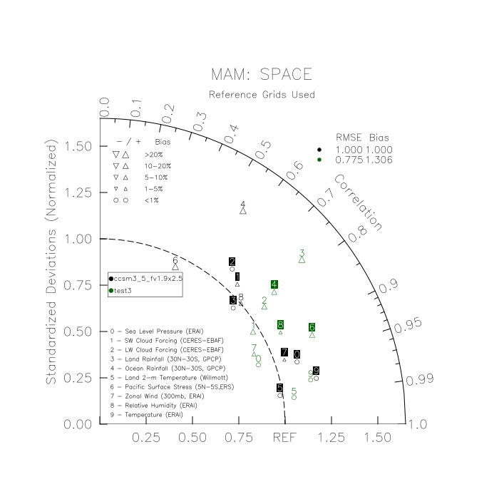 Taylor Diagrams were developed by Karl Taylor at PCMDI (paper|tech note) and aim to condense information about variance and RMSE characteristics of a particular model run when compared with observations in a single diagram. The tables summarize the individual metrics for each variable considered including: