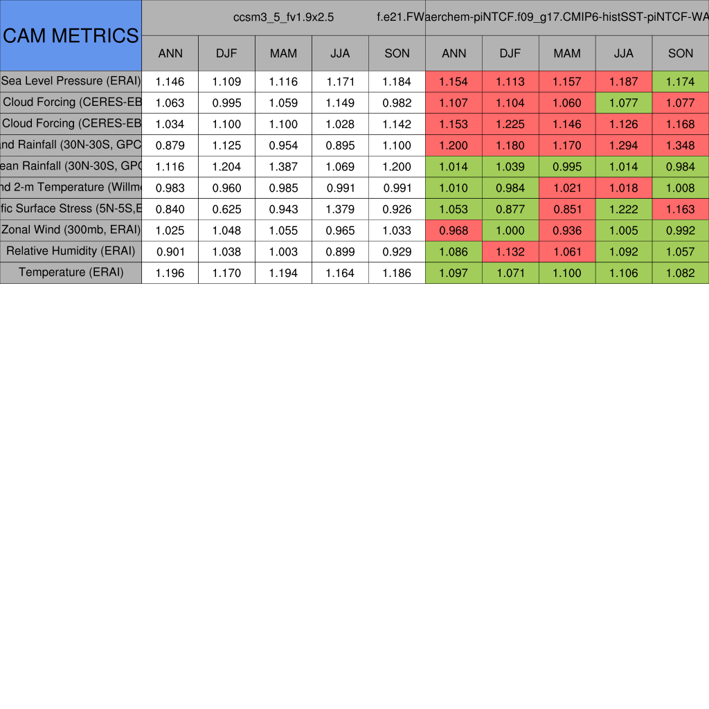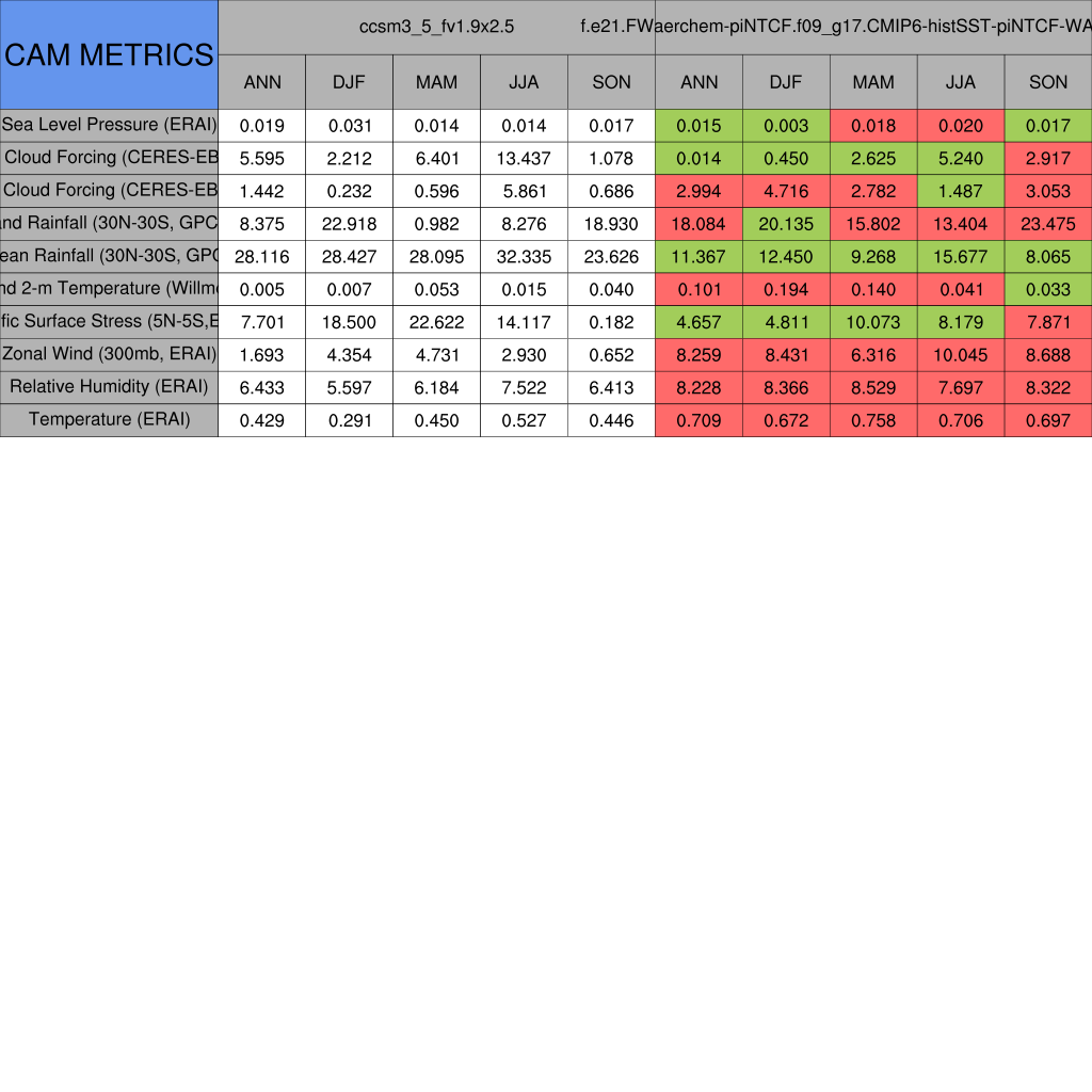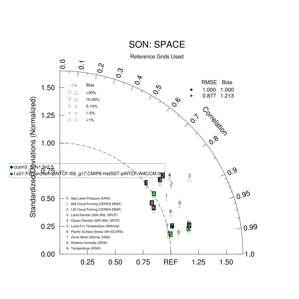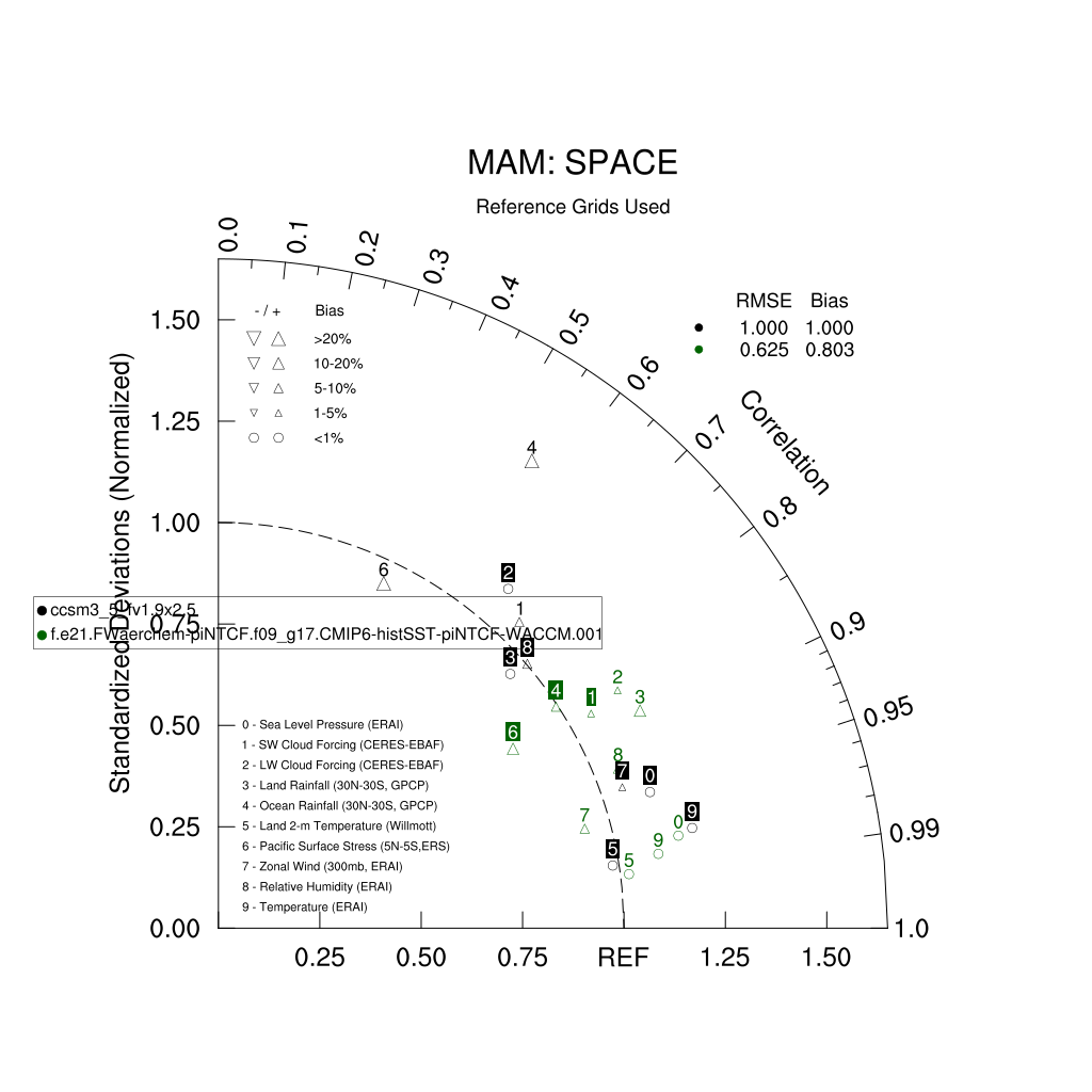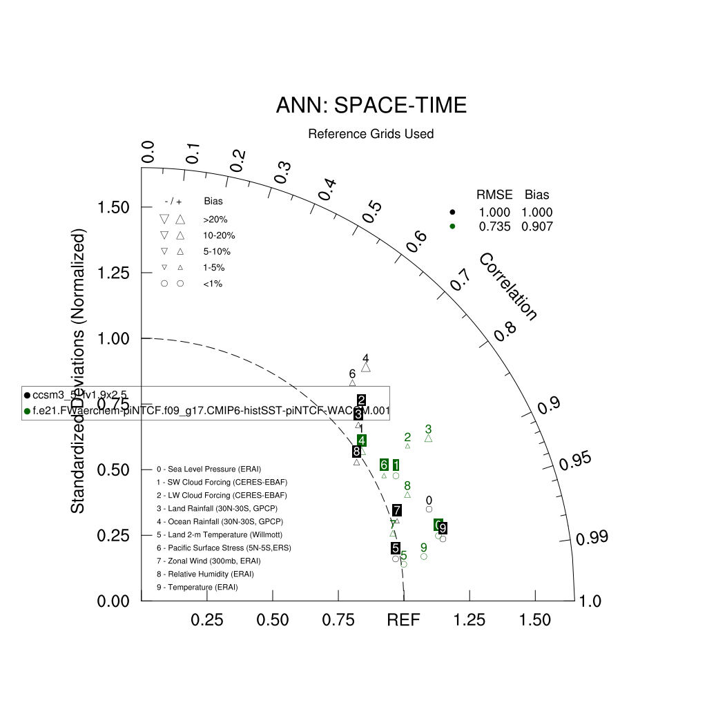 Taylor Diagrams were developed by Karl Taylor at PCMDI (paper|tech note) and aim to condense information about variance and RMSE characteristics of a particular model run when compared with observations in a single diagram. The tables summarize the individual metrics for each variable considered including: