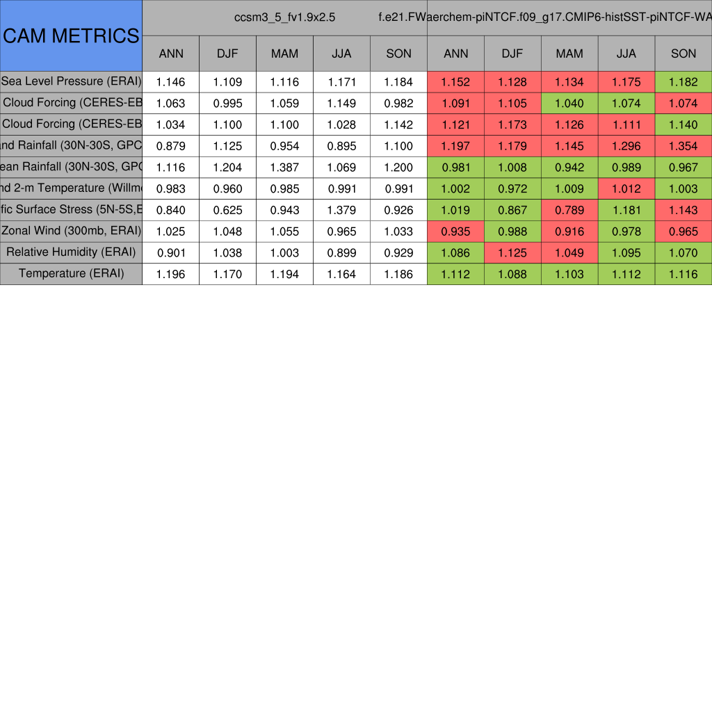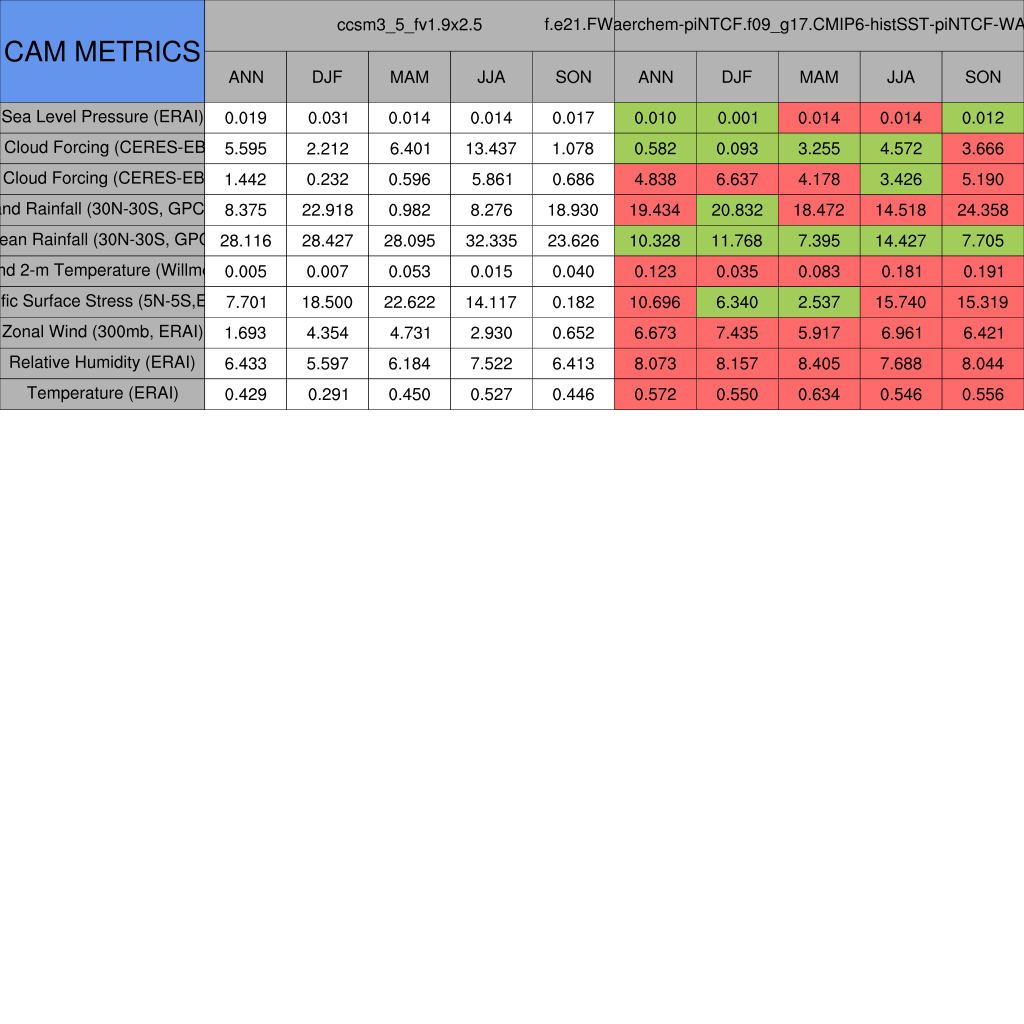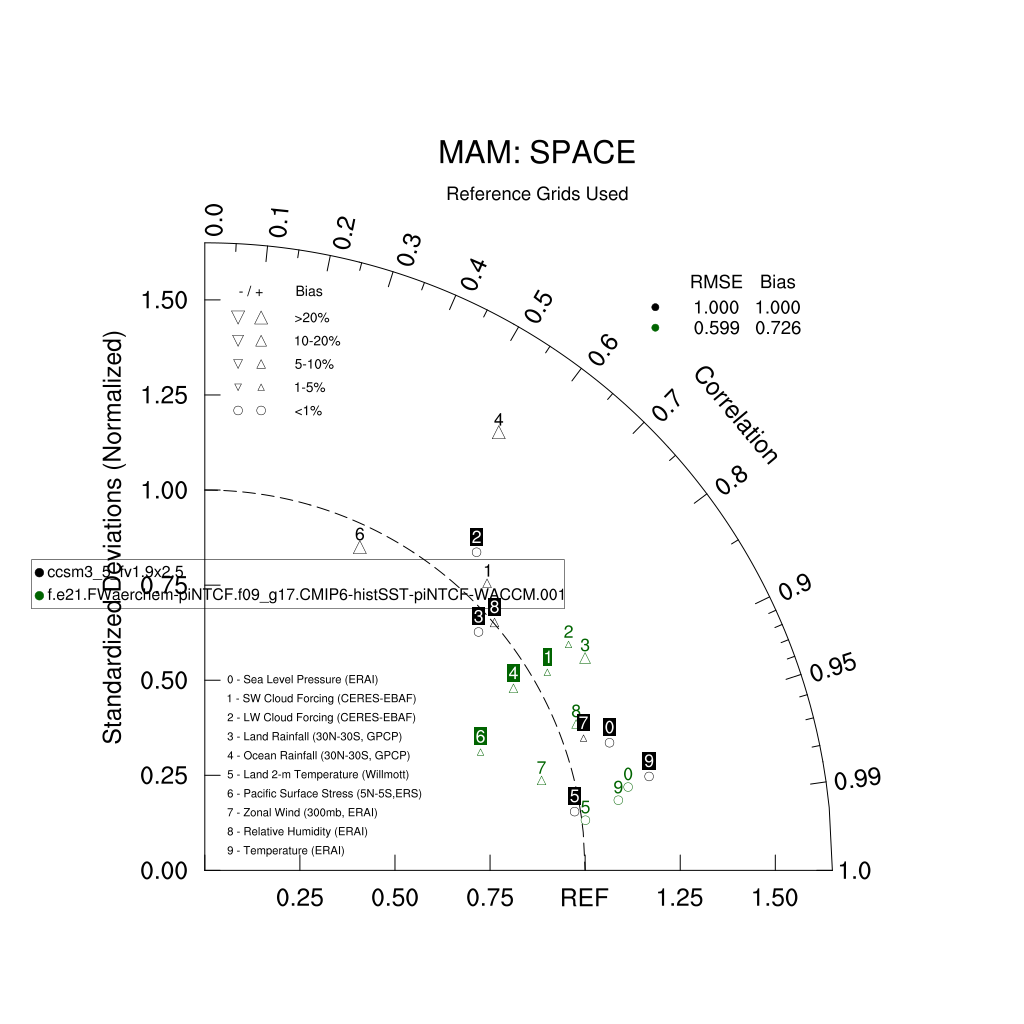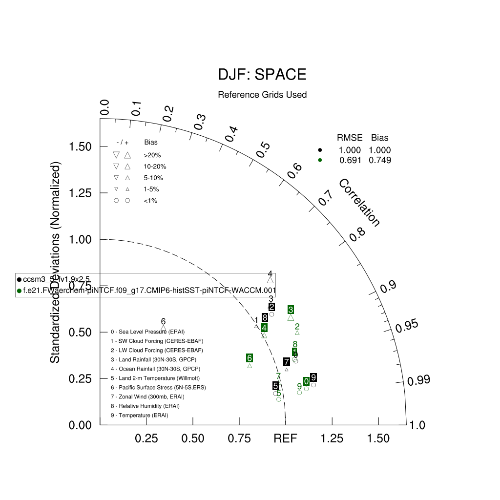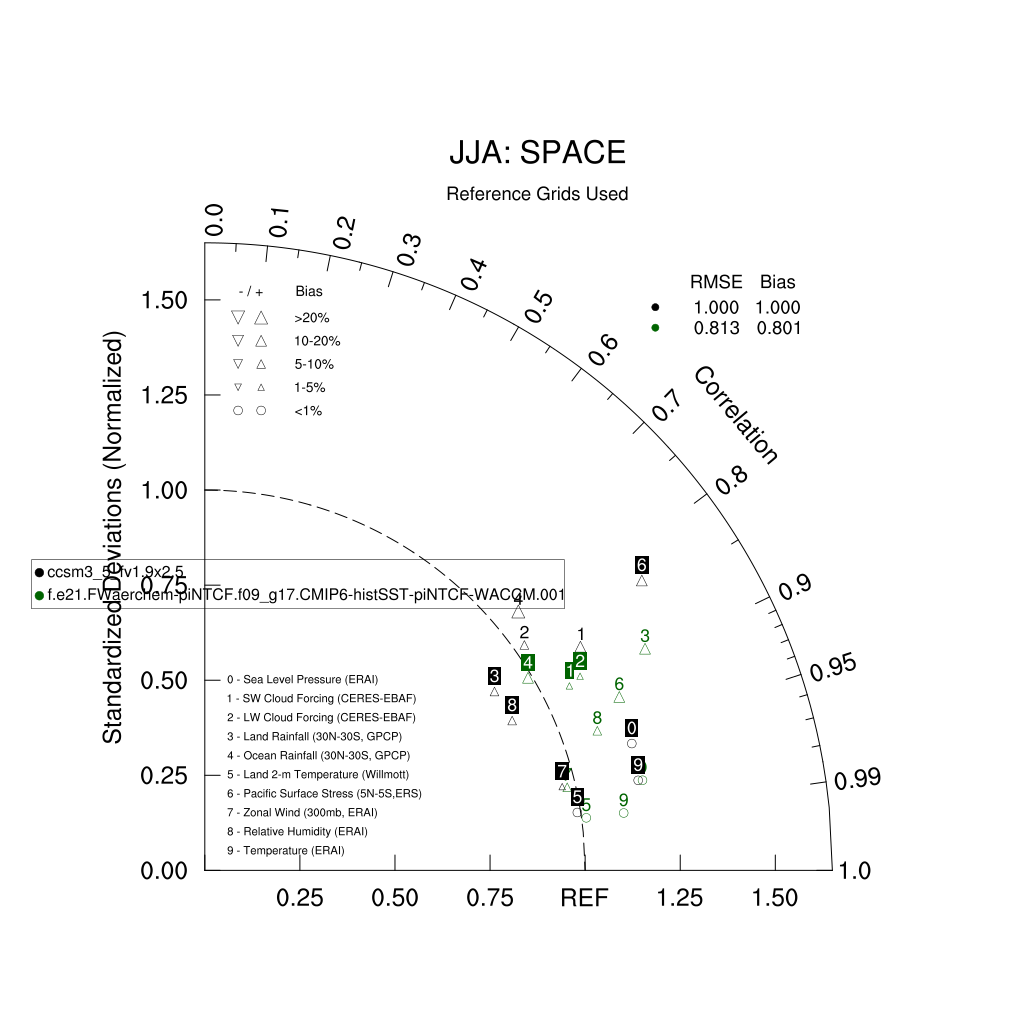 Taylor Diagrams were developed by Karl Taylor at PCMDI (paper|tech note) and aim to condense information about variance and RMSE characteristics of a particular model run when compared with observations in a single diagram. The tables summarize the individual metrics for each variable considered including: