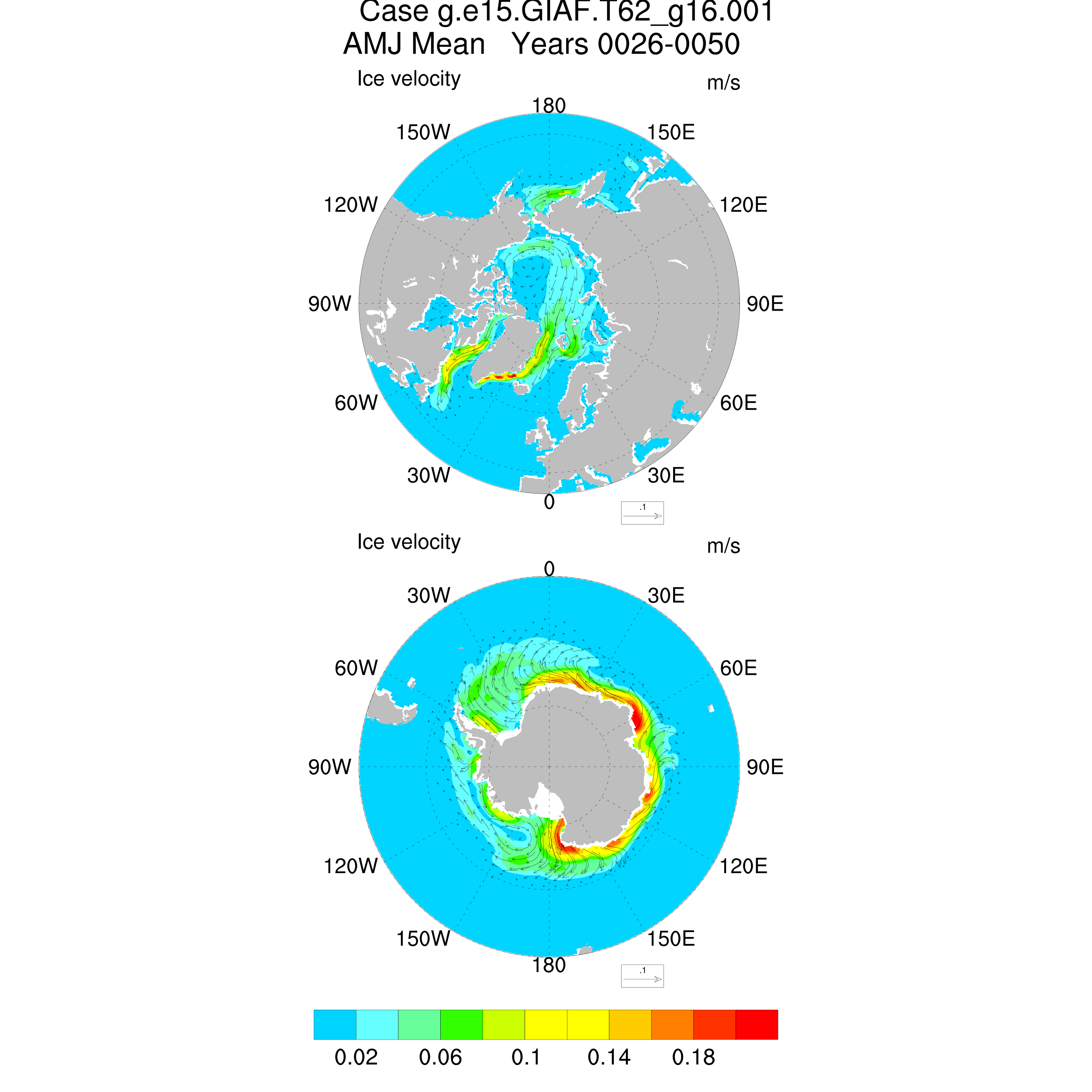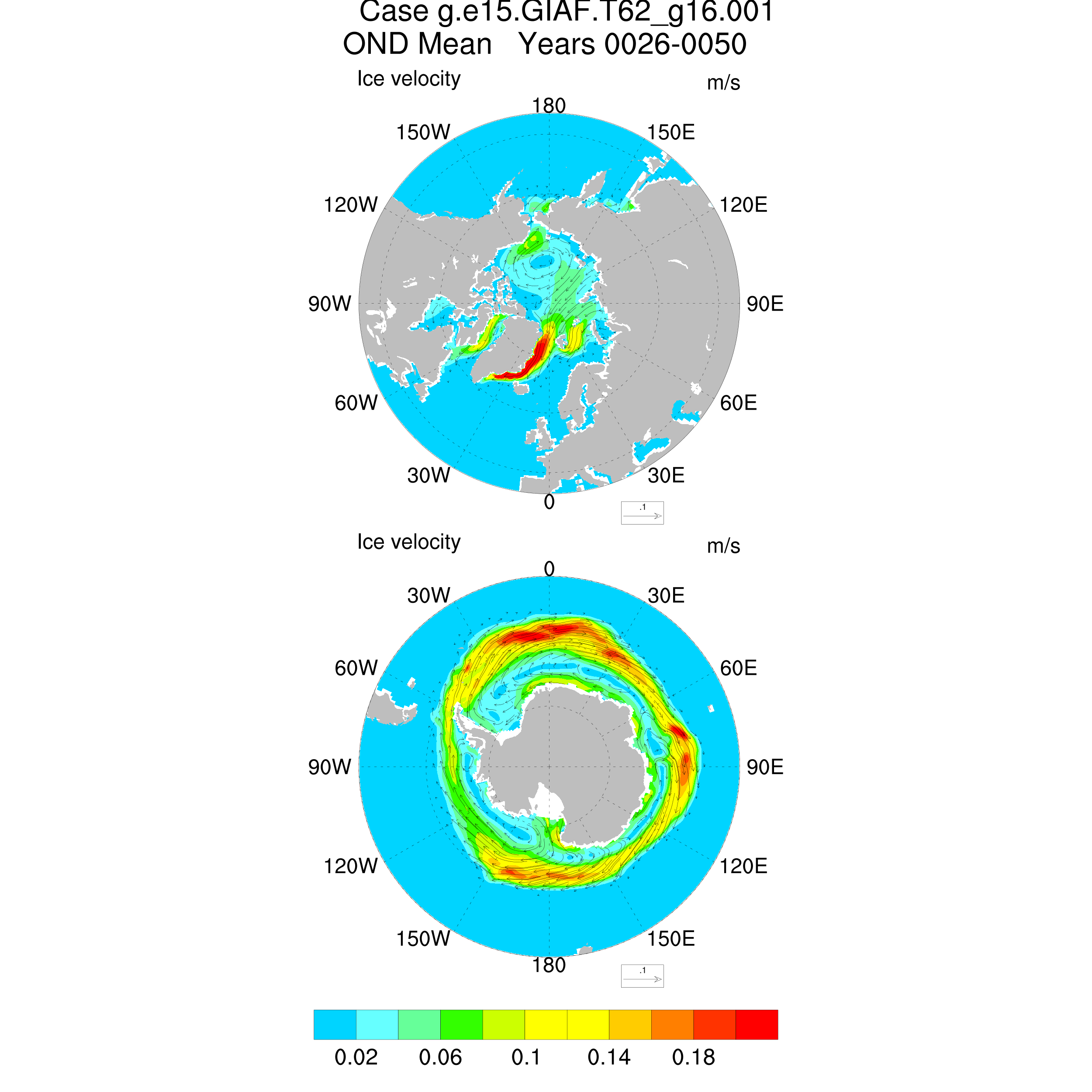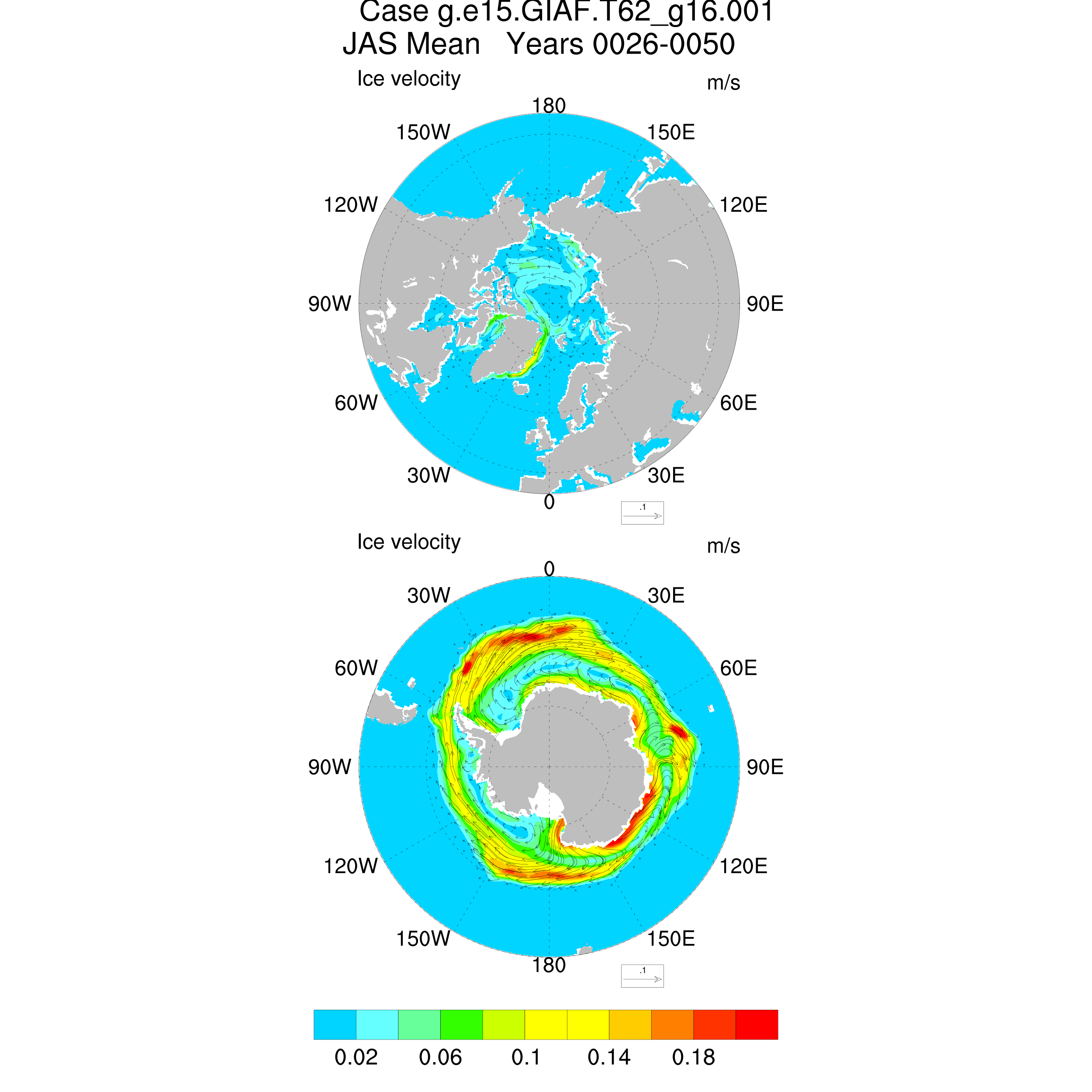 CICE Output for g.e15.GIAF.T62_g16.001 Hemisphere Vector Plots NH and SH Vector Plots Seasonal and Annual Means Ice Velocity JFM AMJ JAS OND ANN