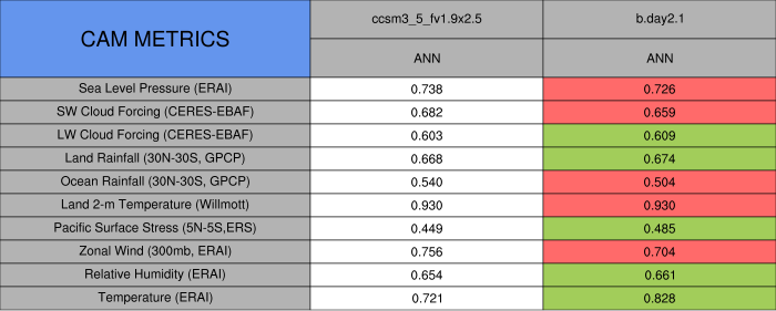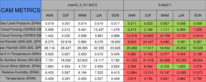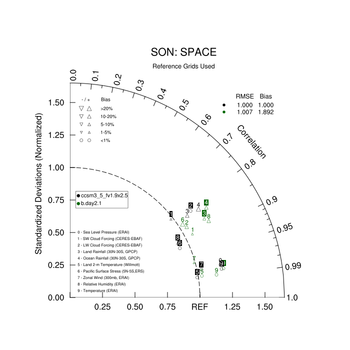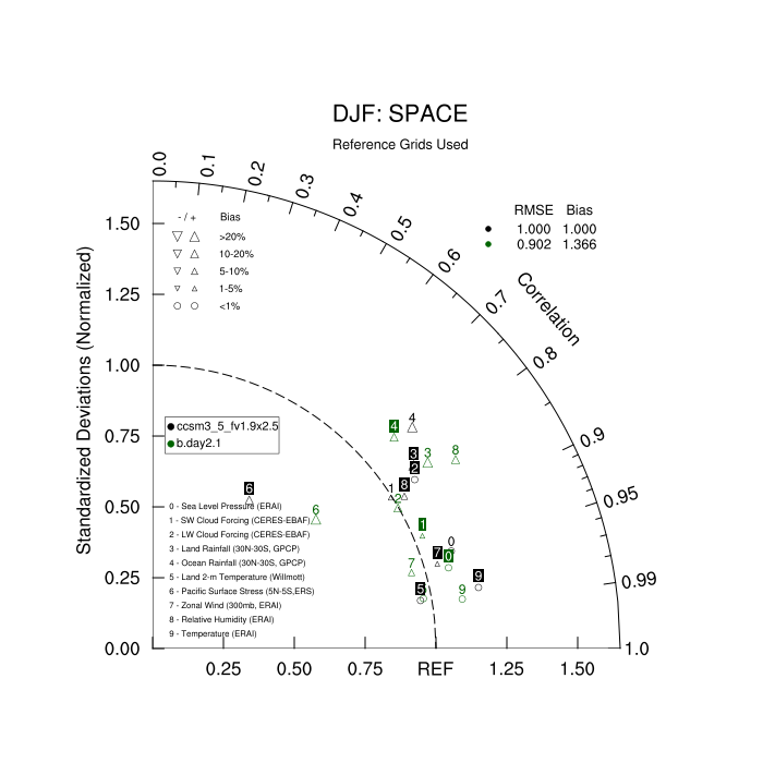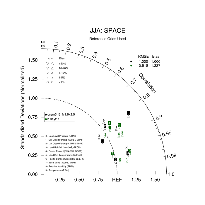 Taylor Diagrams were developed by Karl Taylor at PCMDI (paper|tech note) and aim to condense information about variance and RMSE characteristics of a particular model run when compared with observations in a single diagram. The tables summarize the individual metrics for each variable considered including: