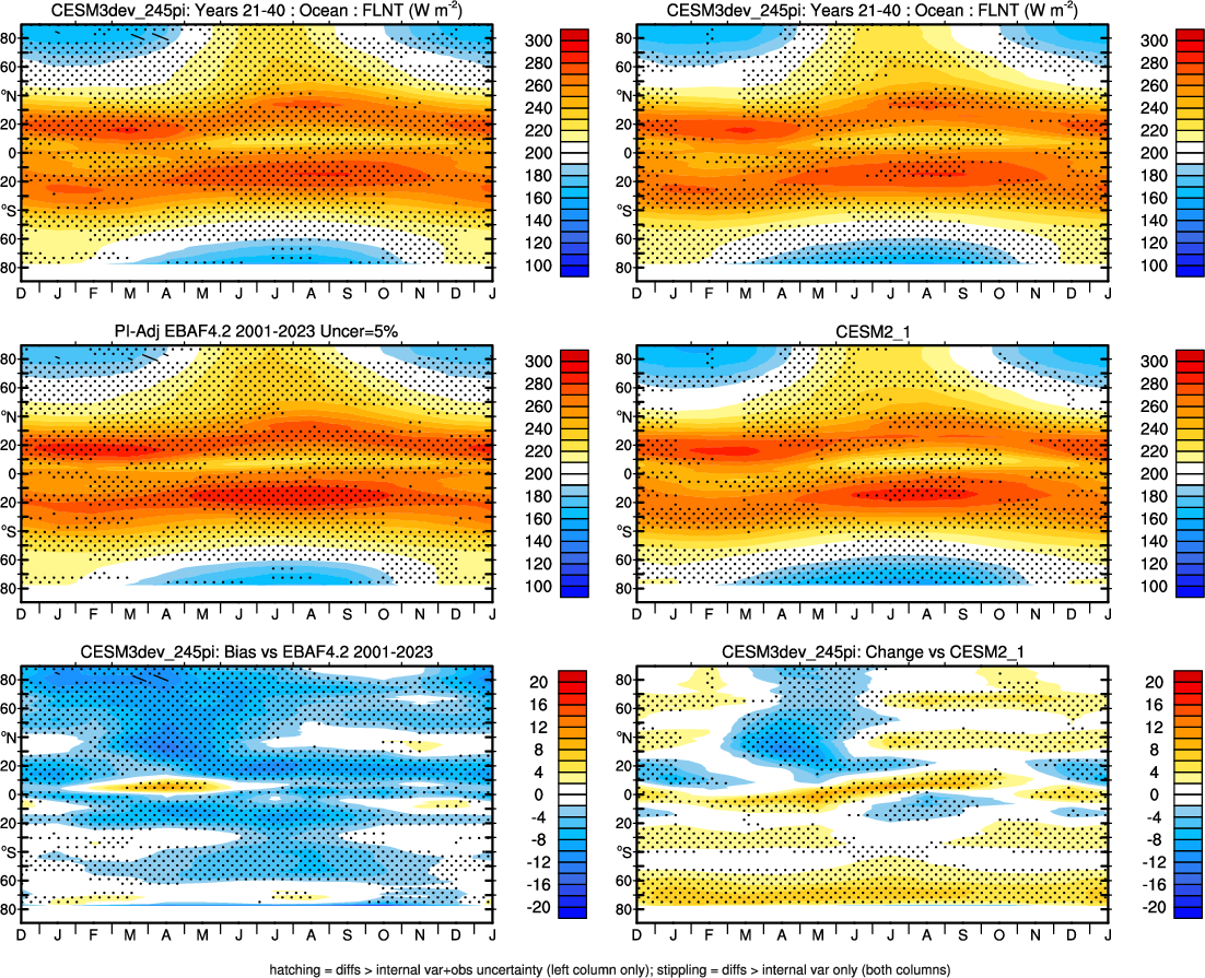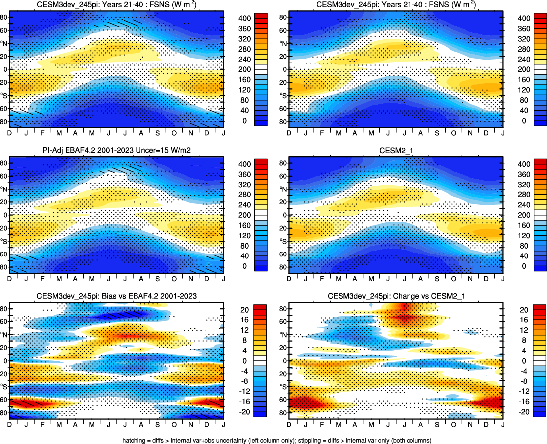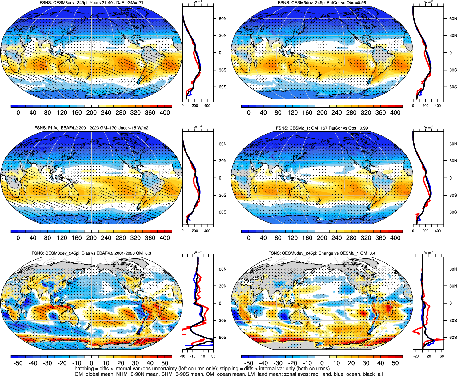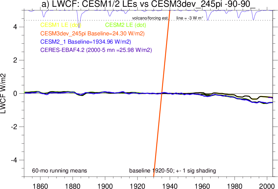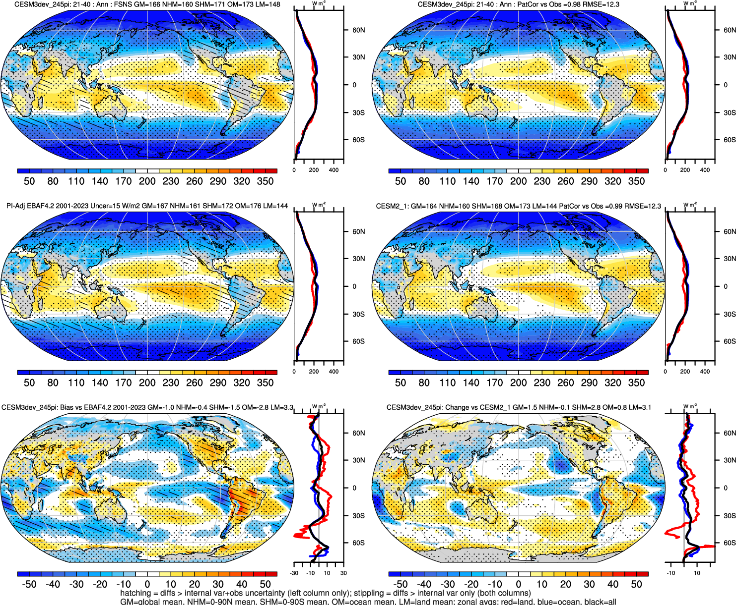 | CESM3dev | NHM-SHM FSNT too small. see also SWCF, ALBDS OM-LM FSNT too large. see also SWCF, ALBDS Global Mean LHFLX too large. OM-LM LHFLX too small. | FSNT PCor-ENSO improves. see also SWCF, ALBDS RTFS PCor-ENSO improves. | PR PCor-AM degrades. |