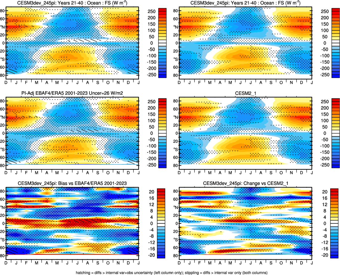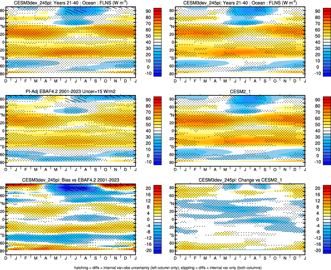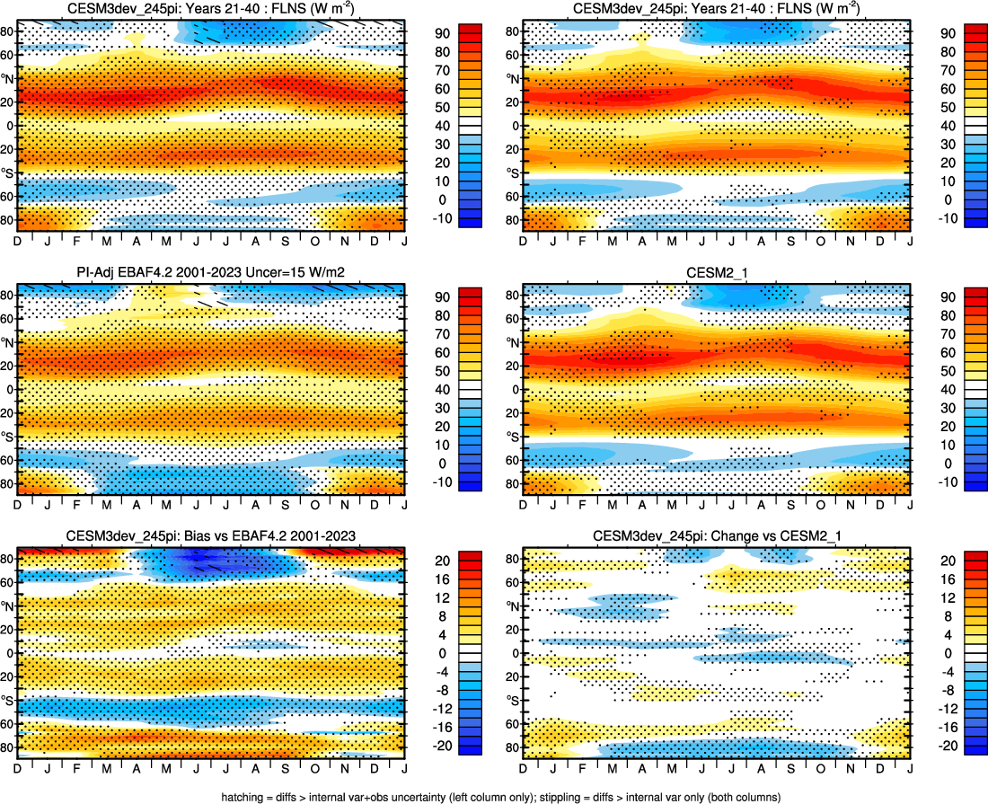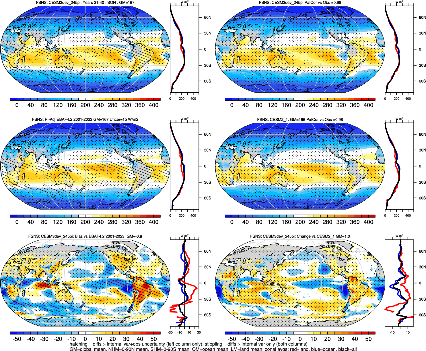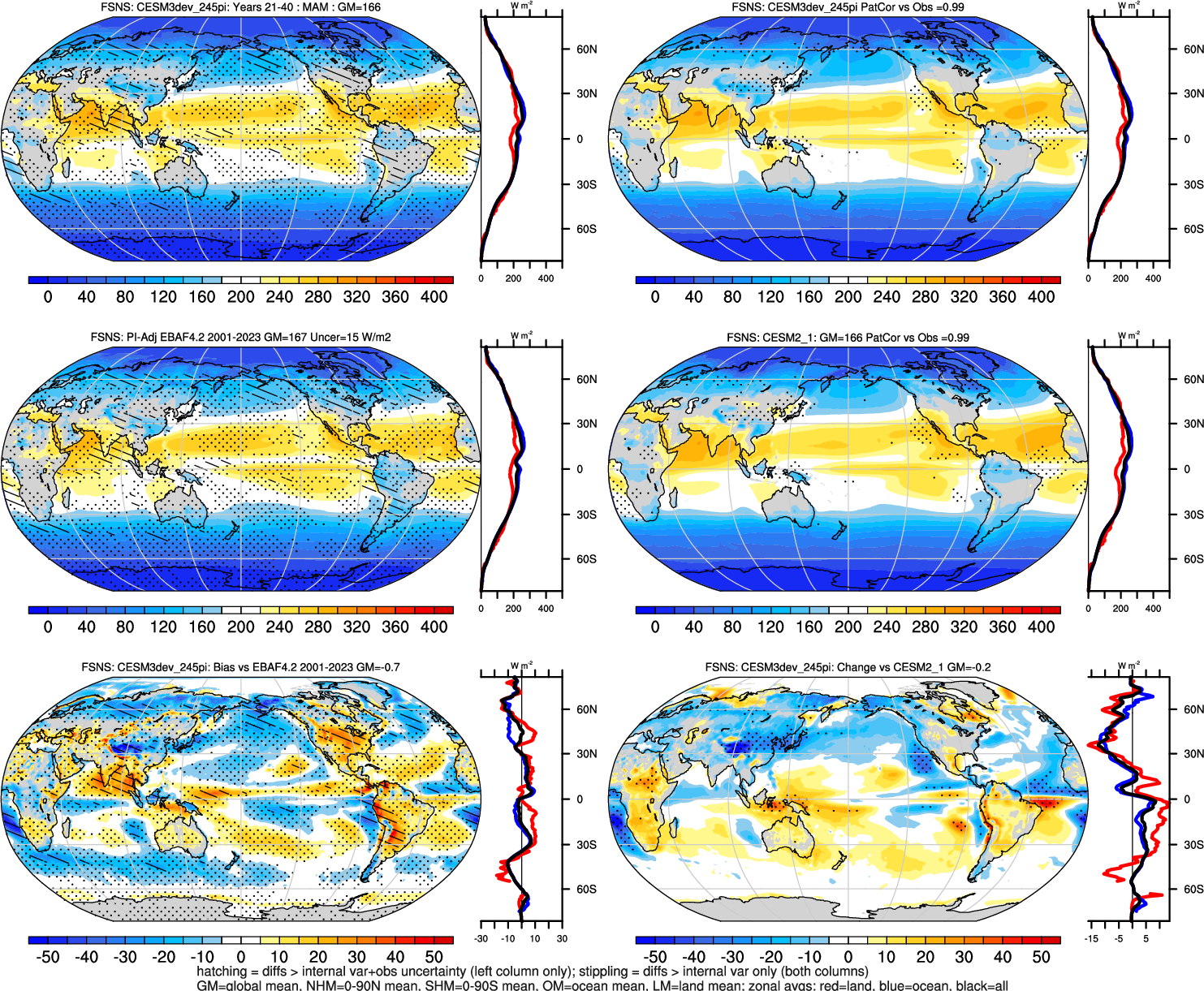 | CESM3dev | NHM-SHM FSNT too small. see also SWCF, ALBDS OM-LM FSNT too large. see also SWCF, ALBDS Global Mean LHFLX too large. OM-LM LHFLX too small. | FSNT PCor-ENSO improves. see also SWCF, ALBDS RTFS PCor-ENSO improves. | PR PCor-AM degrades. |