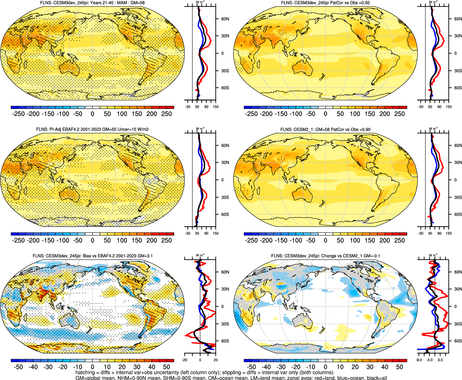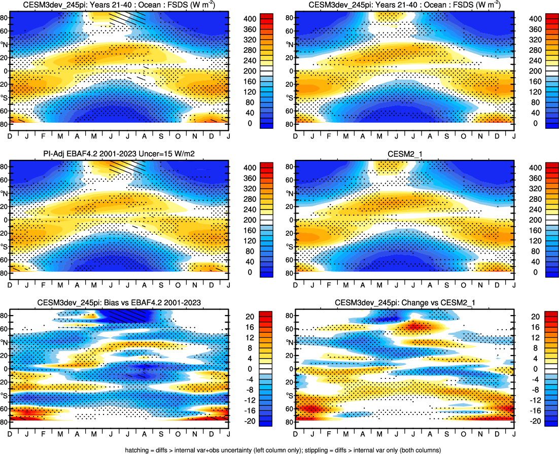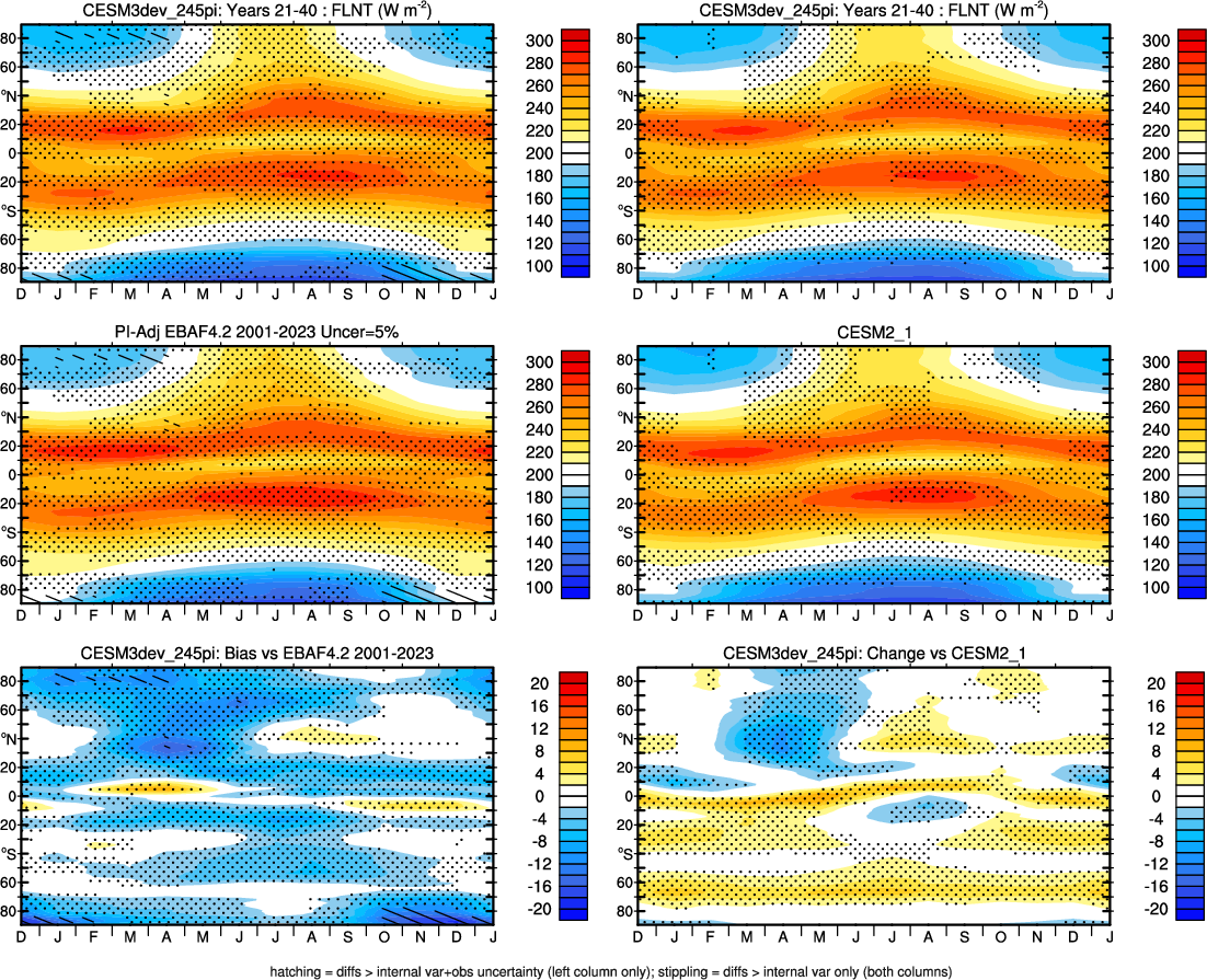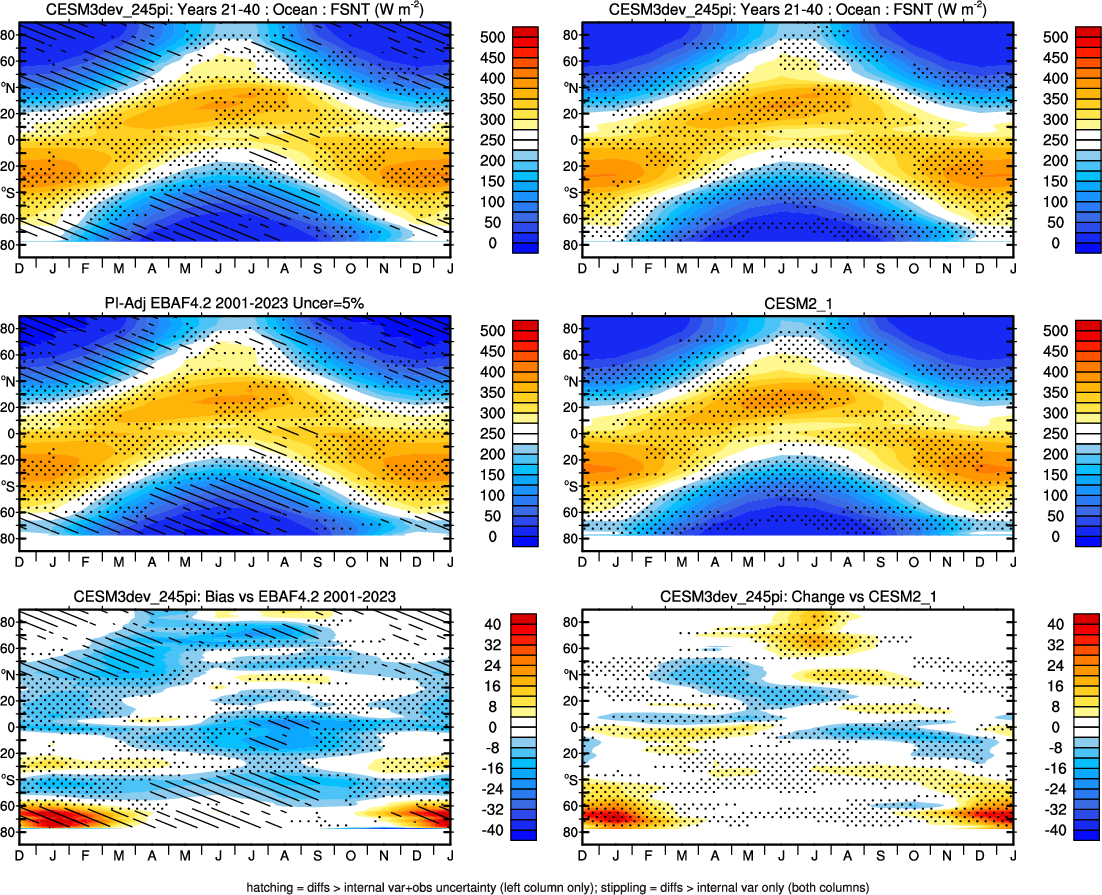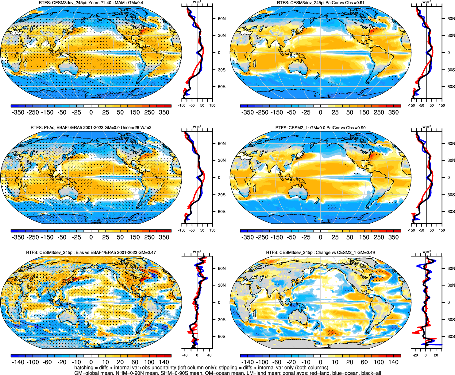 | CESM3dev | NHM-SHM FSNT too small. see also SWCF, ALBDS OM-LM FSNT too large. see also SWCF, ALBDS Global Mean LHFLX too large. OM-LM LHFLX too small. | FSNT PCor-ENSO improves. see also SWCF, ALBDS RTFS PCor-ENSO improves. | PR PCor-AM degrades. |