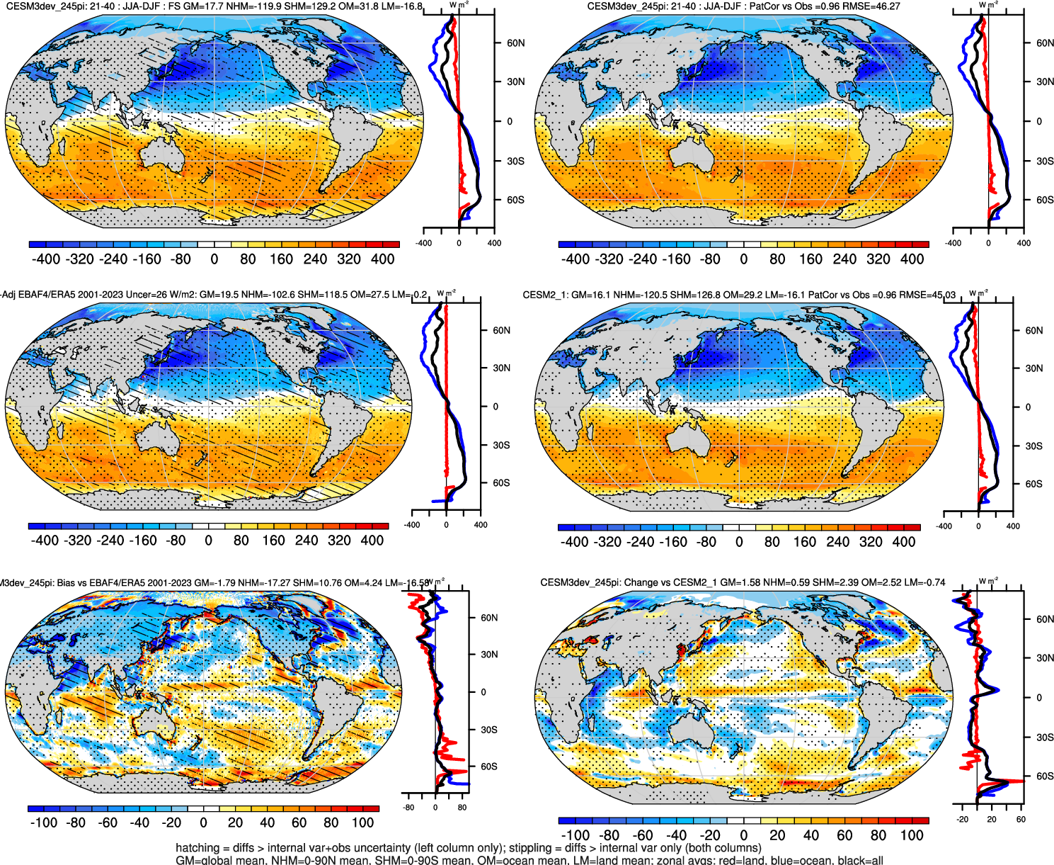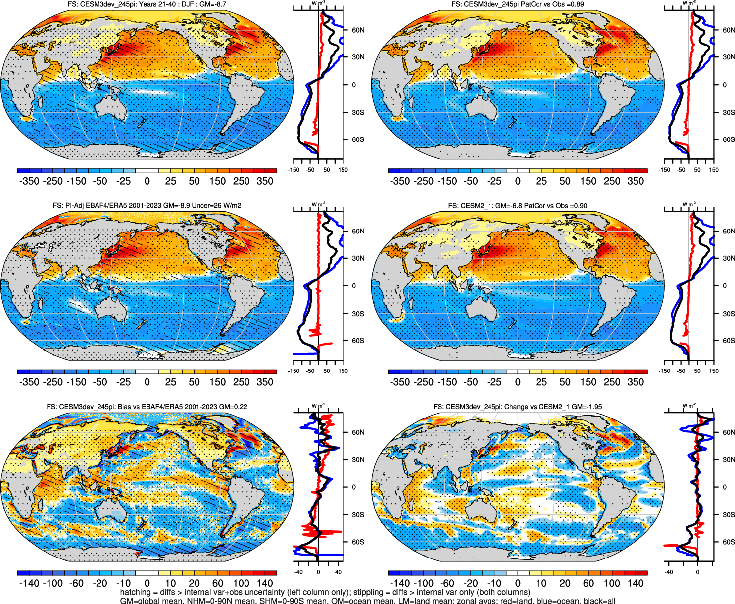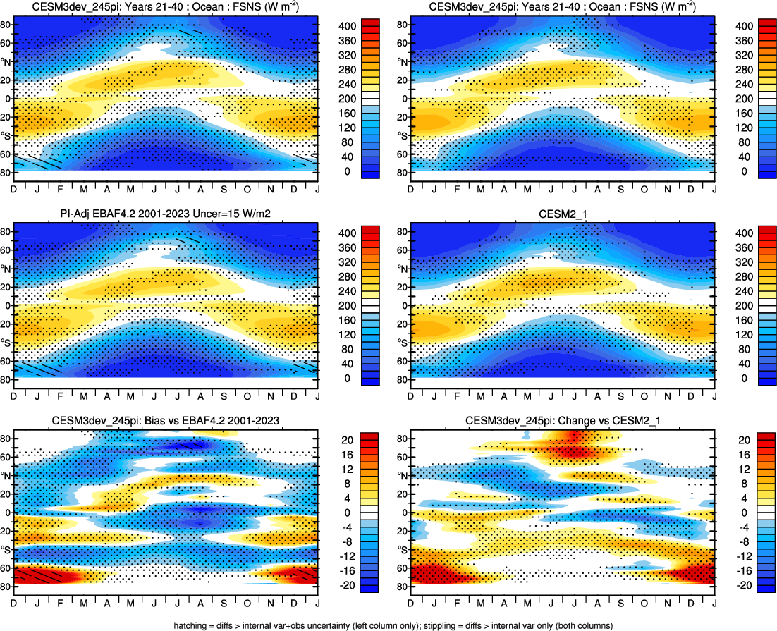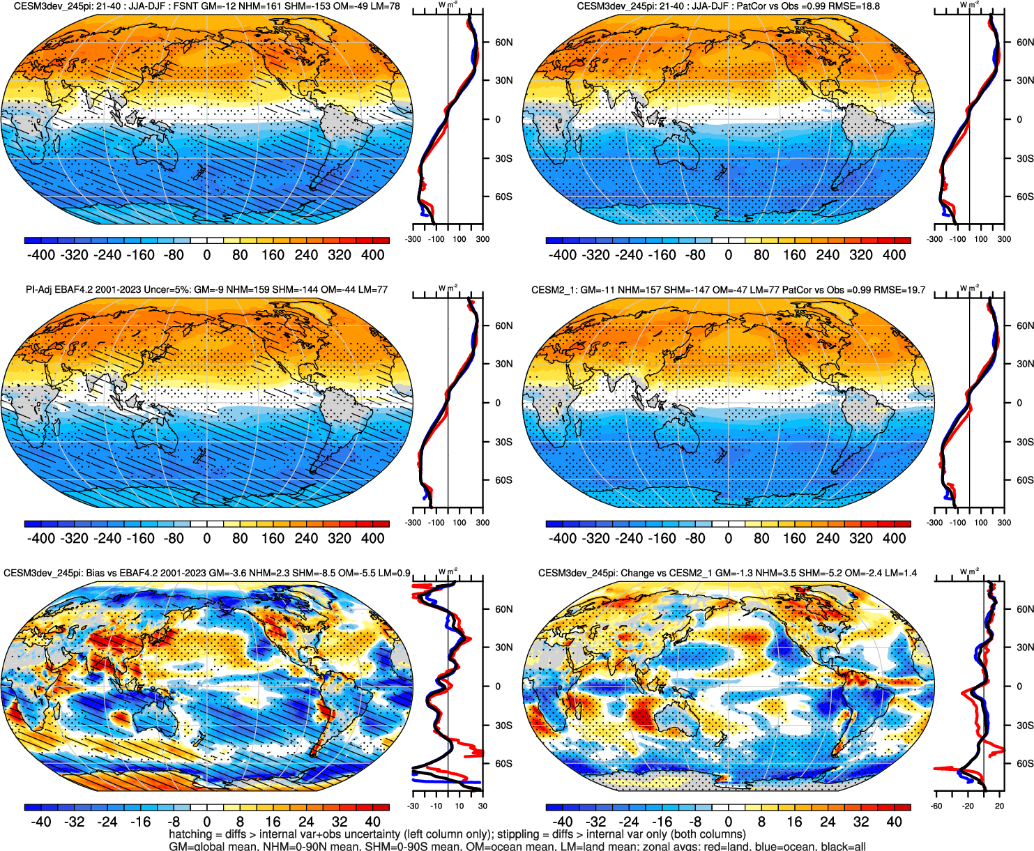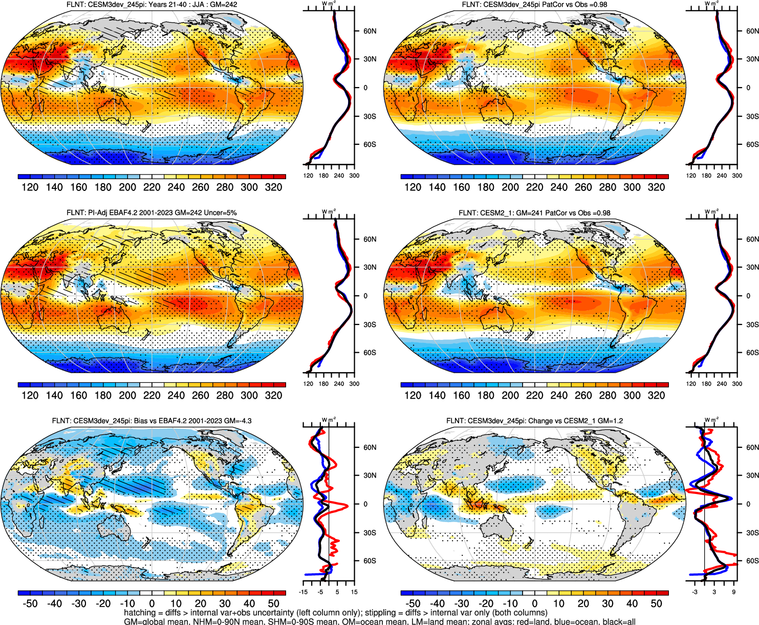 | CESM3dev | NHM-SHM FSNT too small. see also SWCF, ALBDS OM-LM FSNT too large. see also SWCF, ALBDS Global Mean LHFLX too large. OM-LM LHFLX too small. | FSNT PCor-ENSO improves. see also SWCF, ALBDS RTFS PCor-ENSO improves. | PR PCor-AM degrades. |