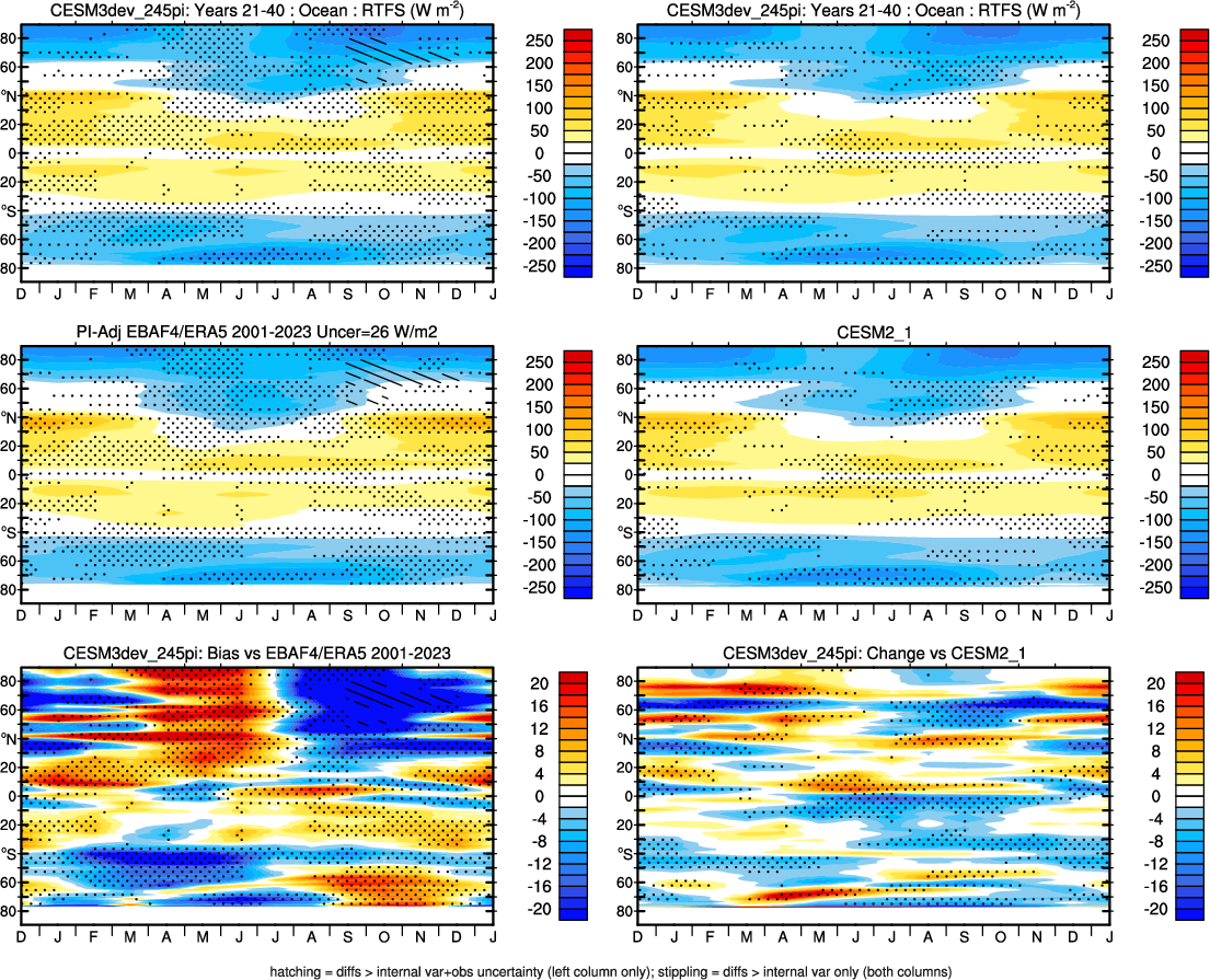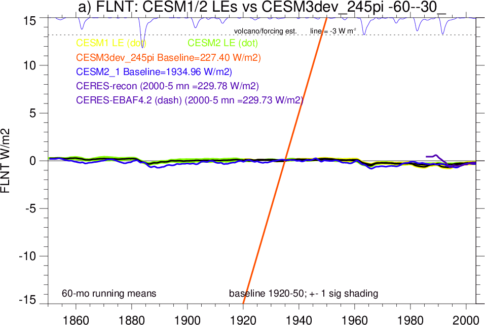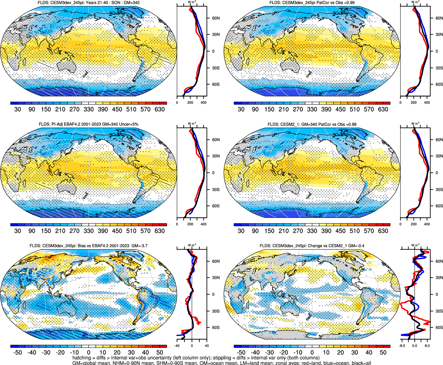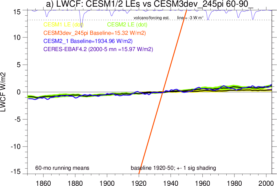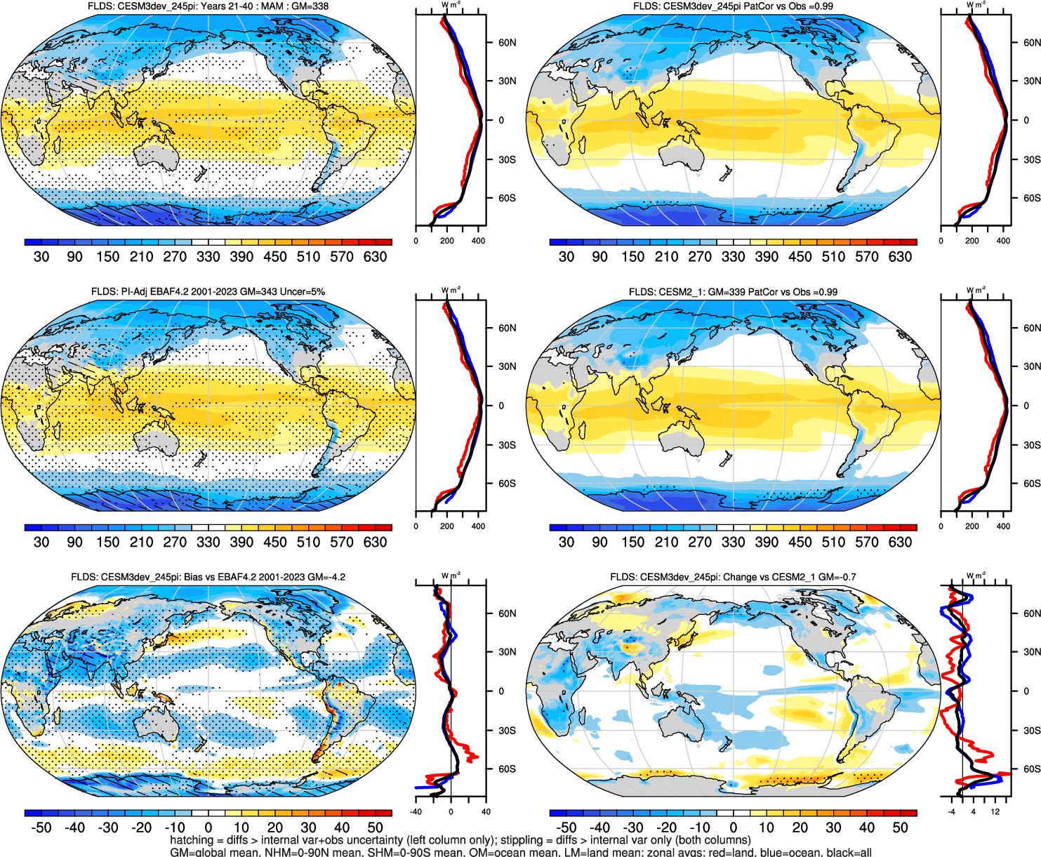 | CESM3dev | NHM-SHM FSNT too small. see also SWCF, ALBDS OM-LM FSNT too large. see also SWCF, ALBDS Global Mean LHFLX too large. OM-LM LHFLX too small. | FSNT PCor-ENSO improves. see also SWCF, ALBDS RTFS PCor-ENSO improves. | PR PCor-AM degrades. |