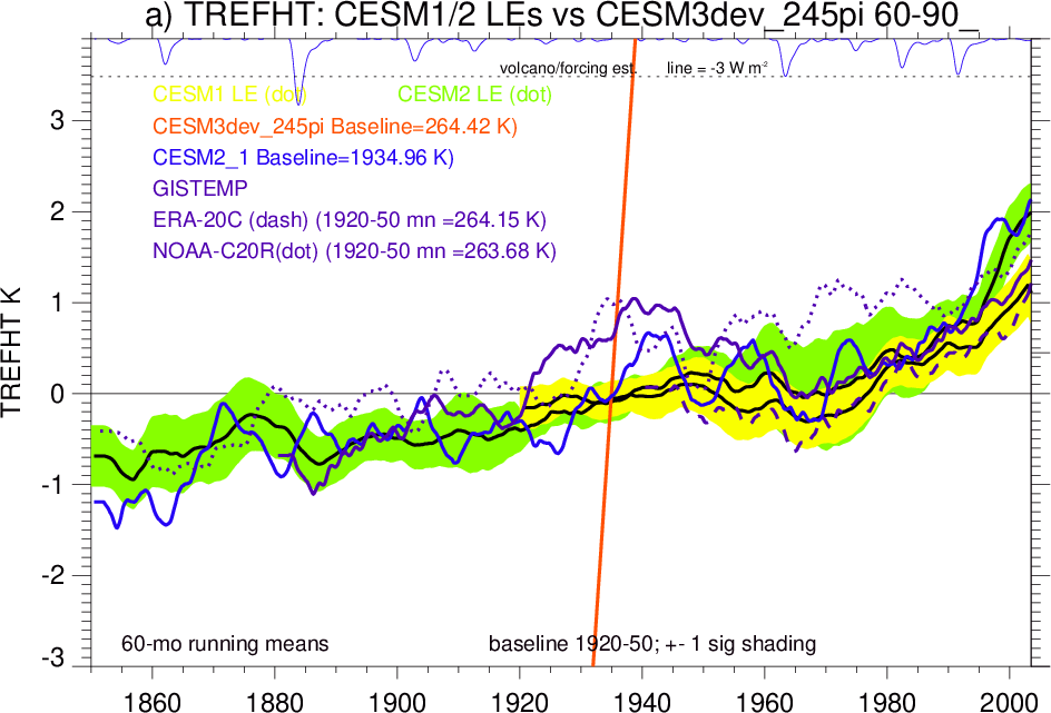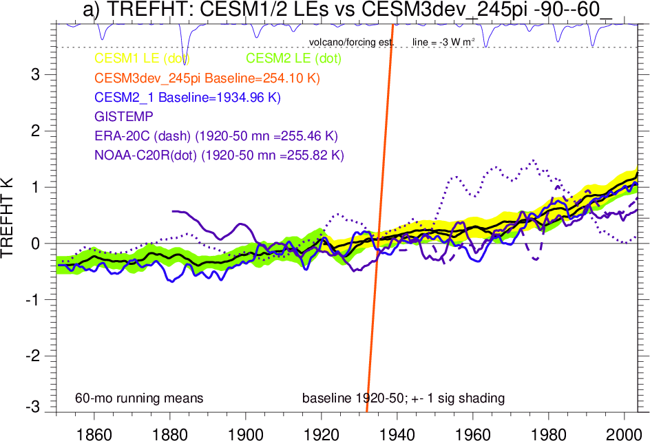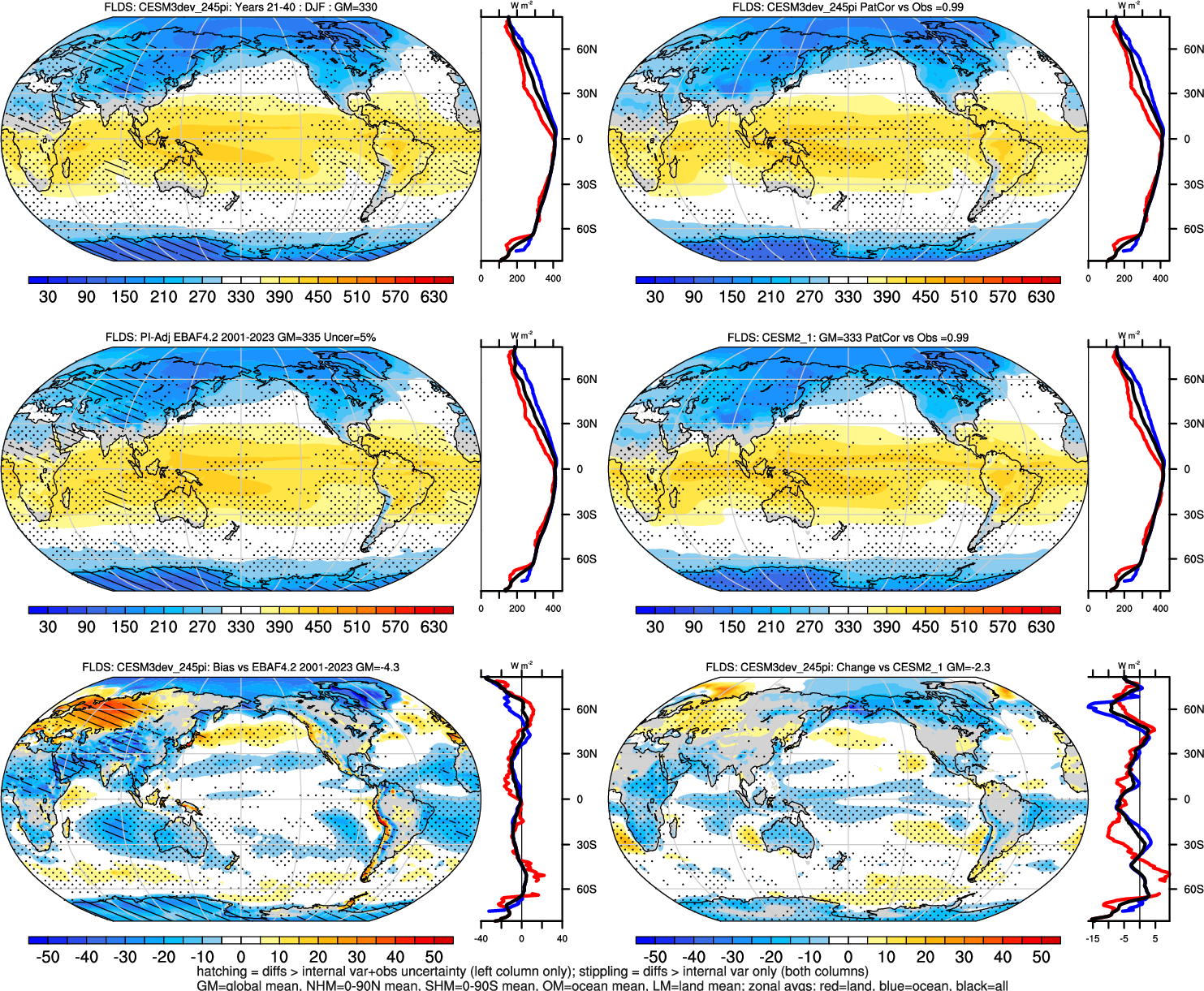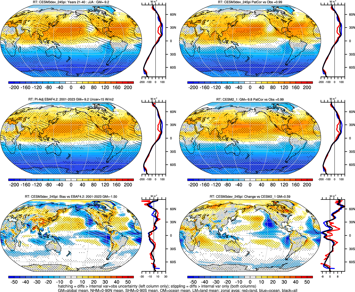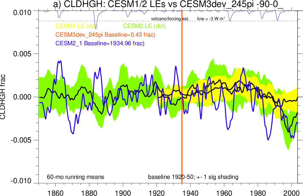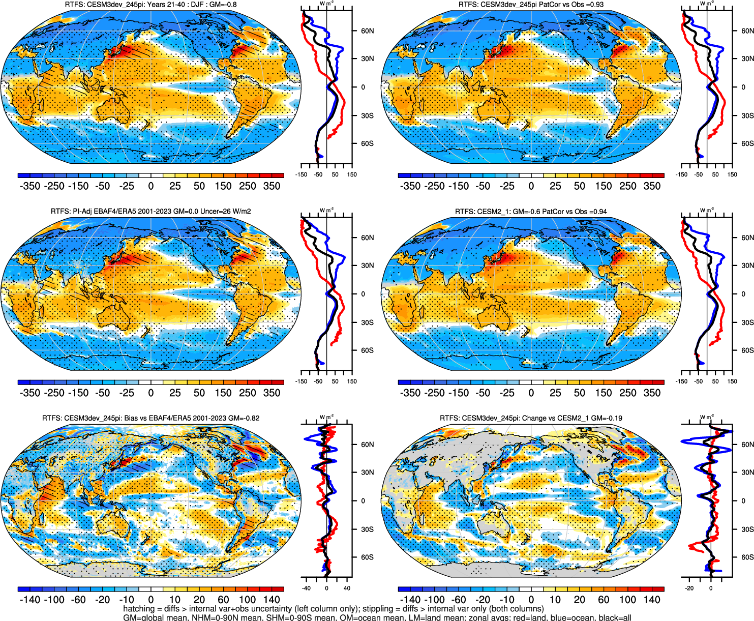 | CESM3dev | NHM-SHM FSNT too small. see also SWCF, ALBDS OM-LM FSNT too large. see also SWCF, ALBDS Global Mean LHFLX too large. OM-LM LHFLX too small. | FSNT PCor-ENSO improves. see also SWCF, ALBDS RTFS PCor-ENSO improves. | PR PCor-AM degrades. |