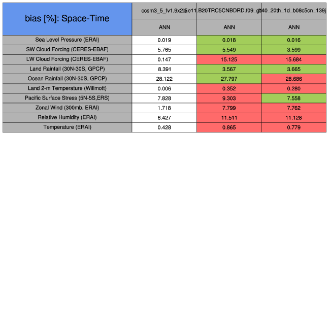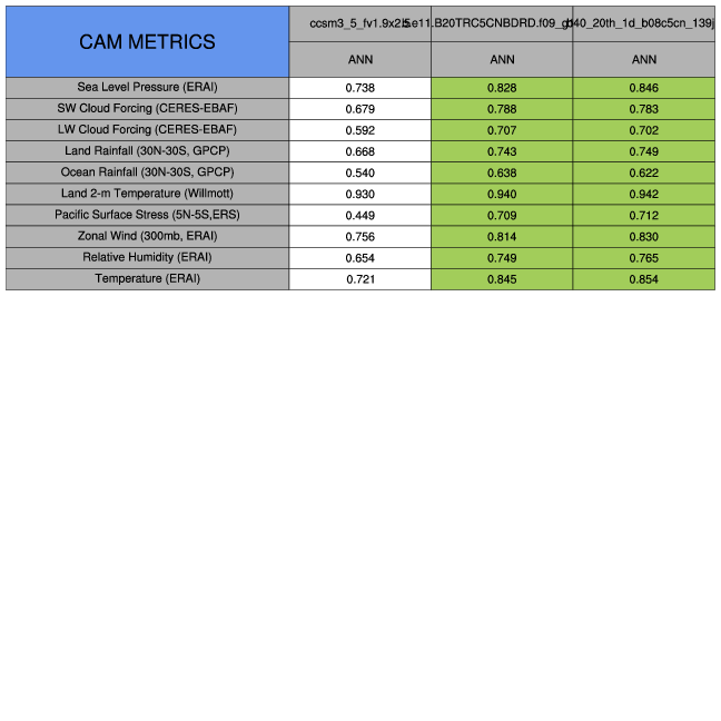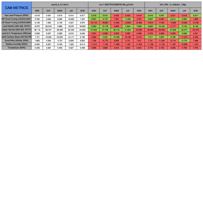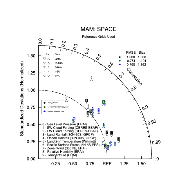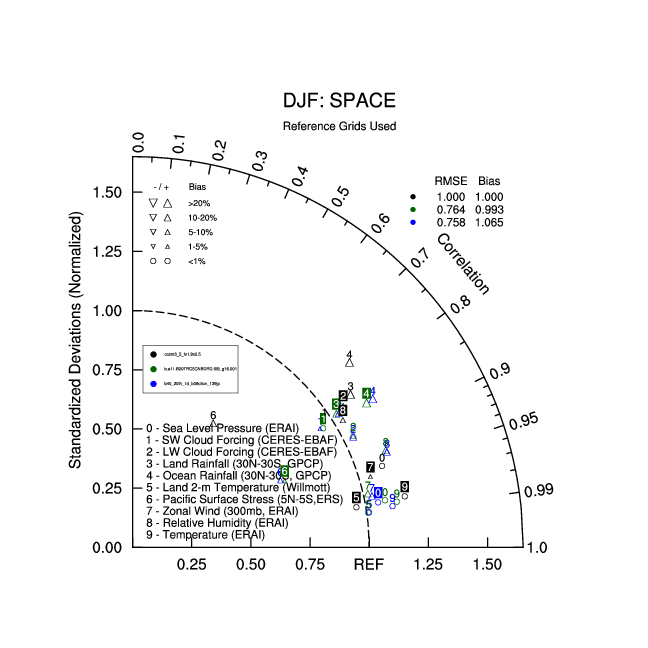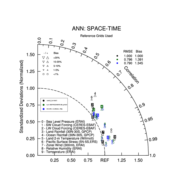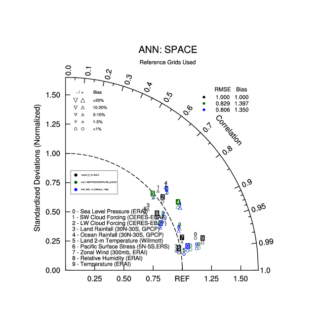 Taylor Diagrams were developed by Karl Taylor at PCMDI (paper|tech note) and aim to condense information about variance and RMSE characteristics of a particular model run when compared with observations in a single diagram. The tables summarize the individual metrics for each variable considered including: