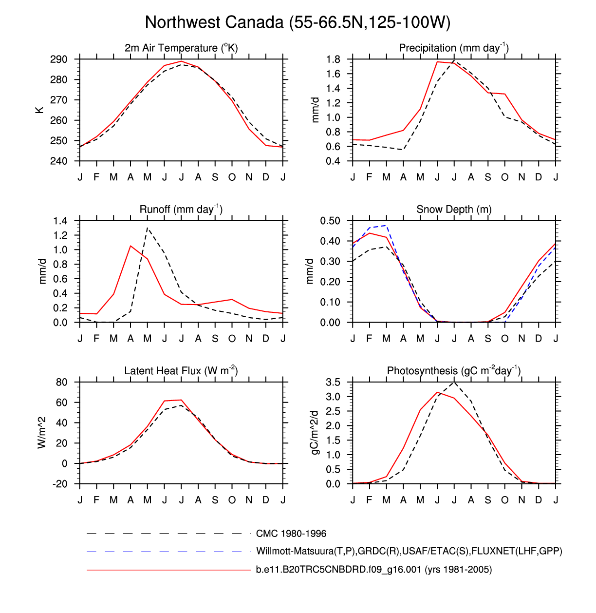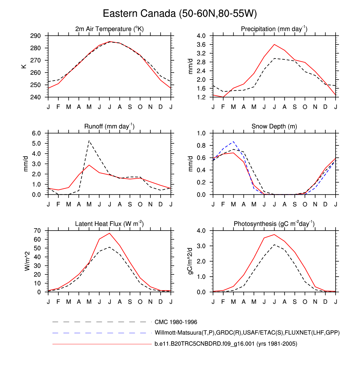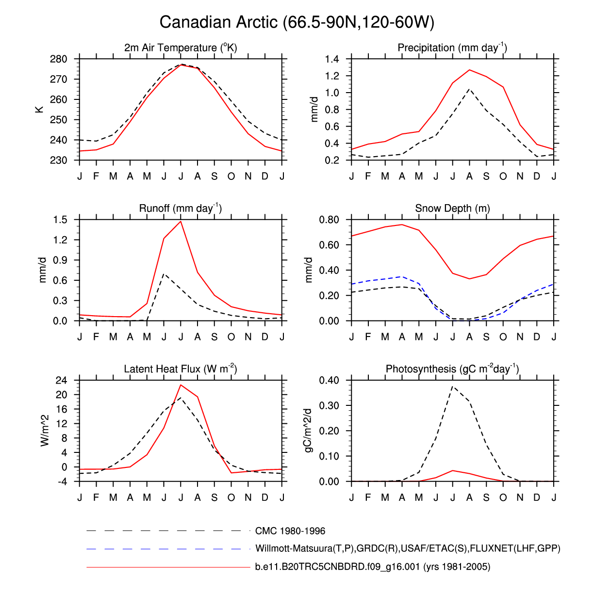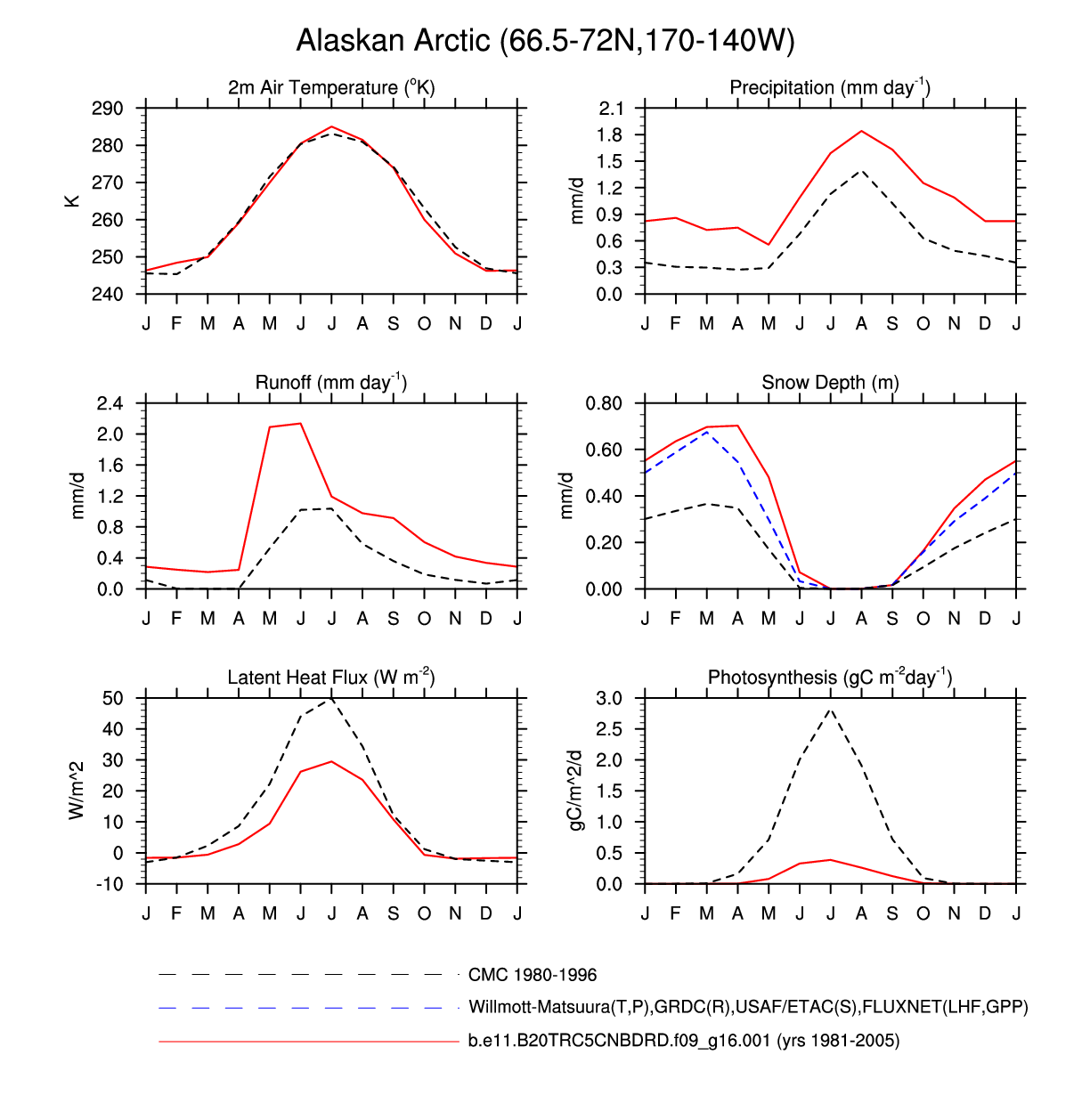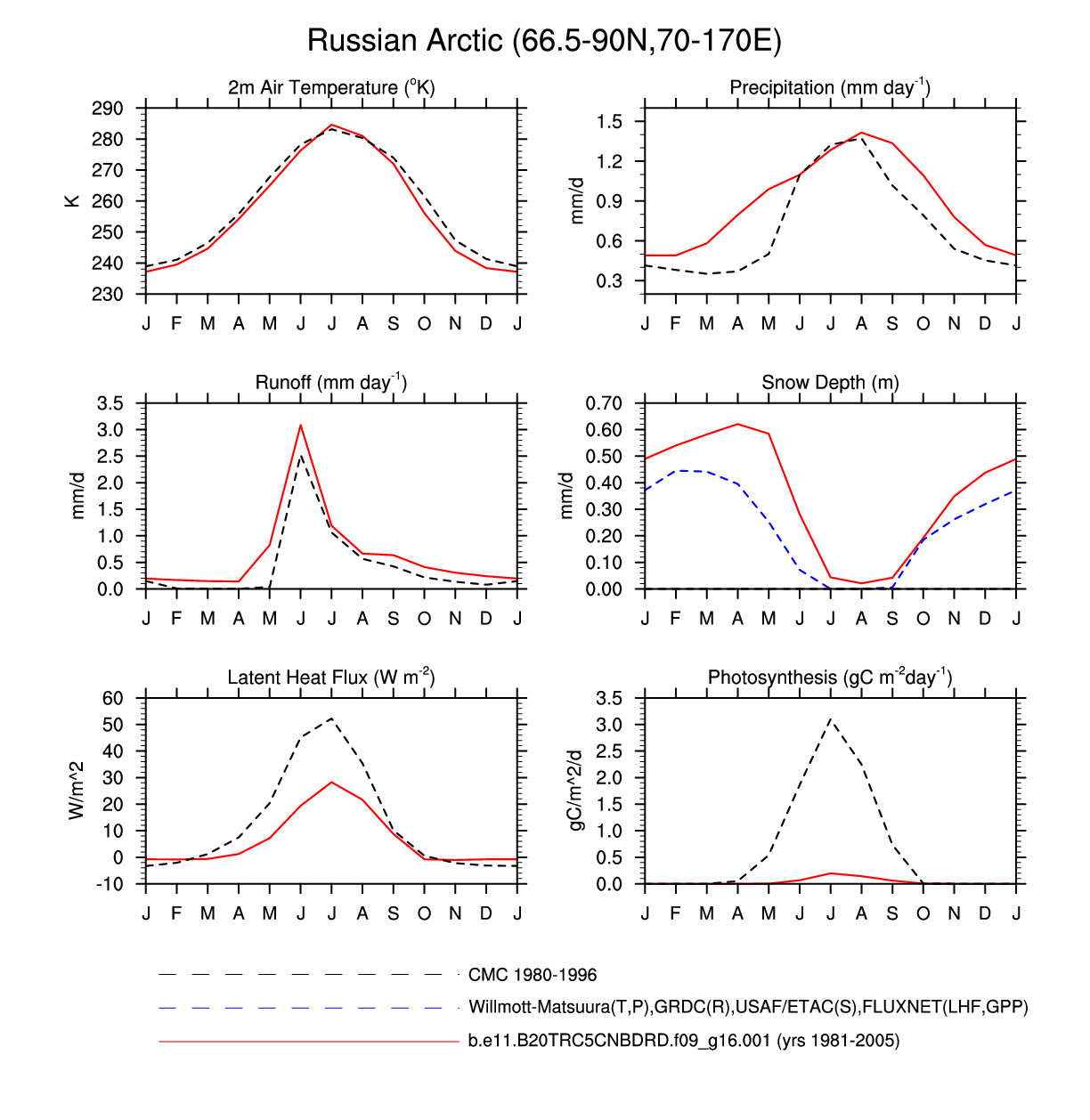 Set 3 Description: Line plots of monthly climatology: regional air temperature, precipitation, runoff, snow depth, radiative fluxes, and turbulent fluxes
