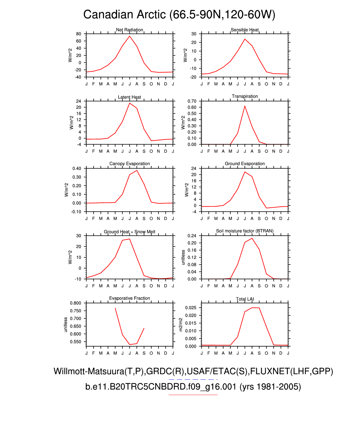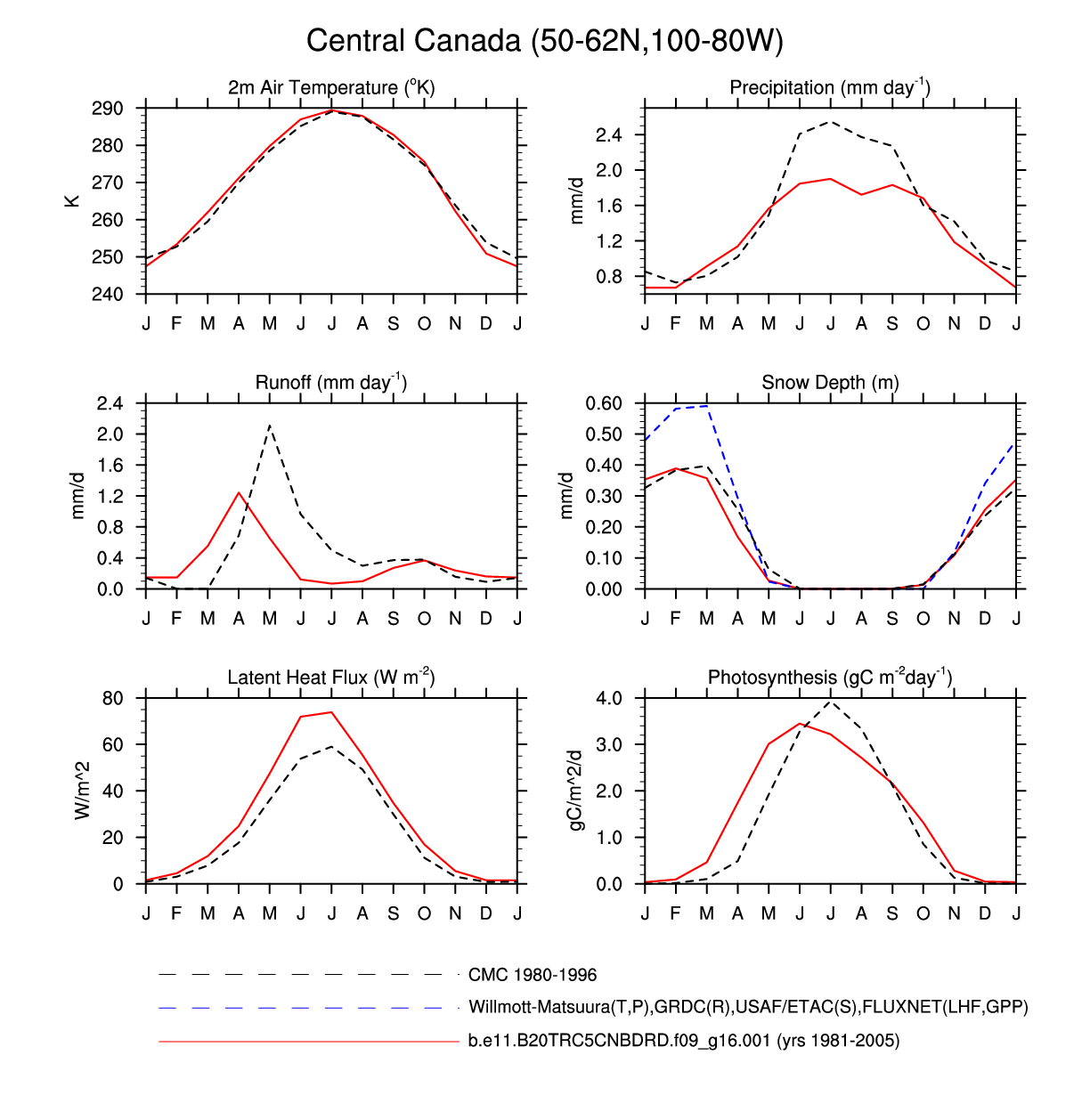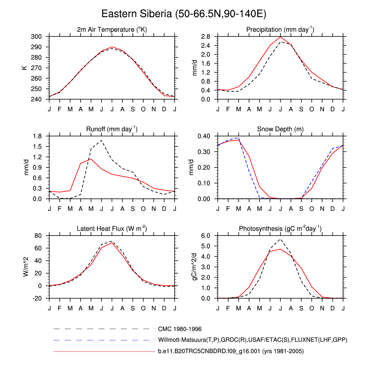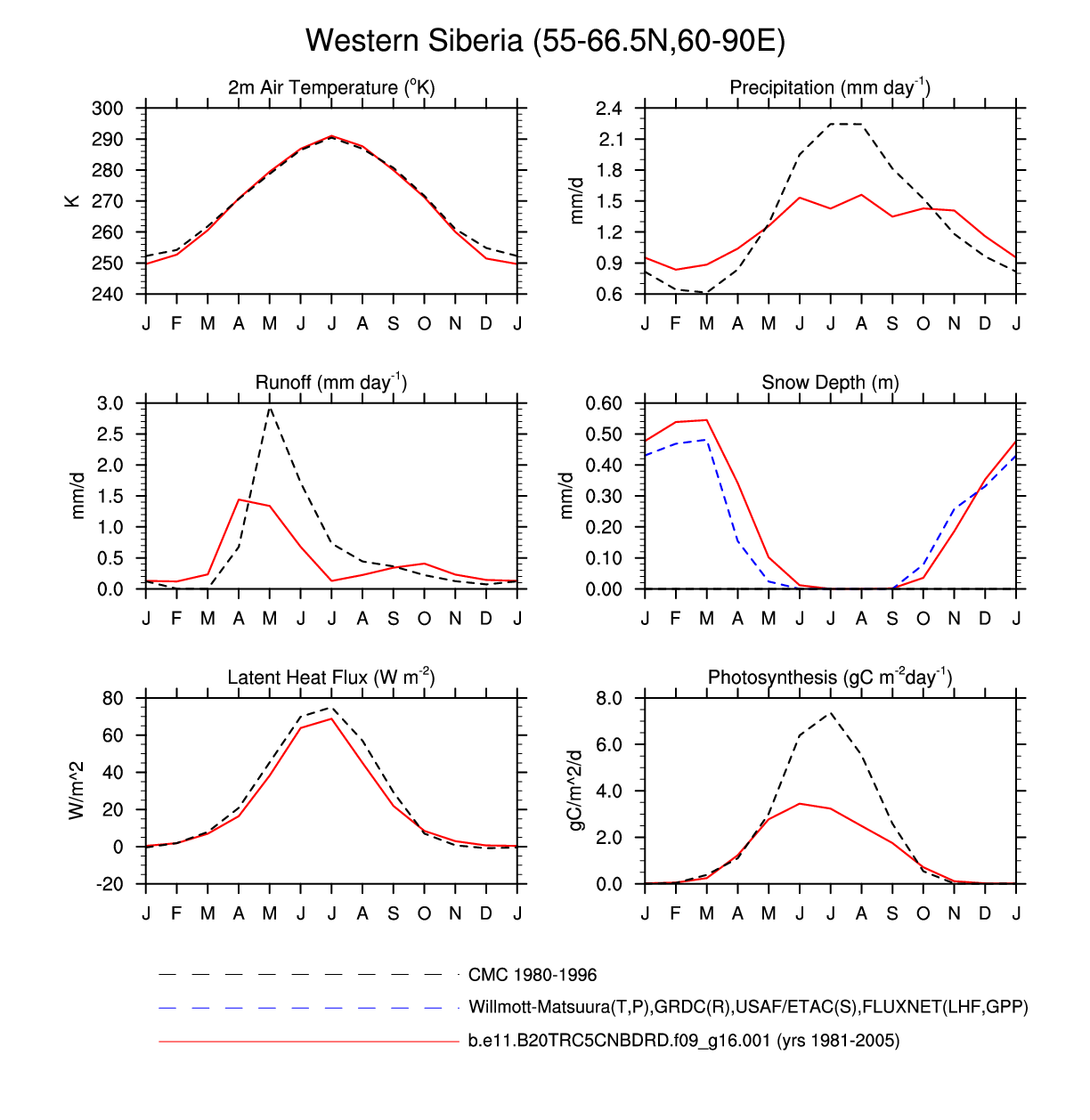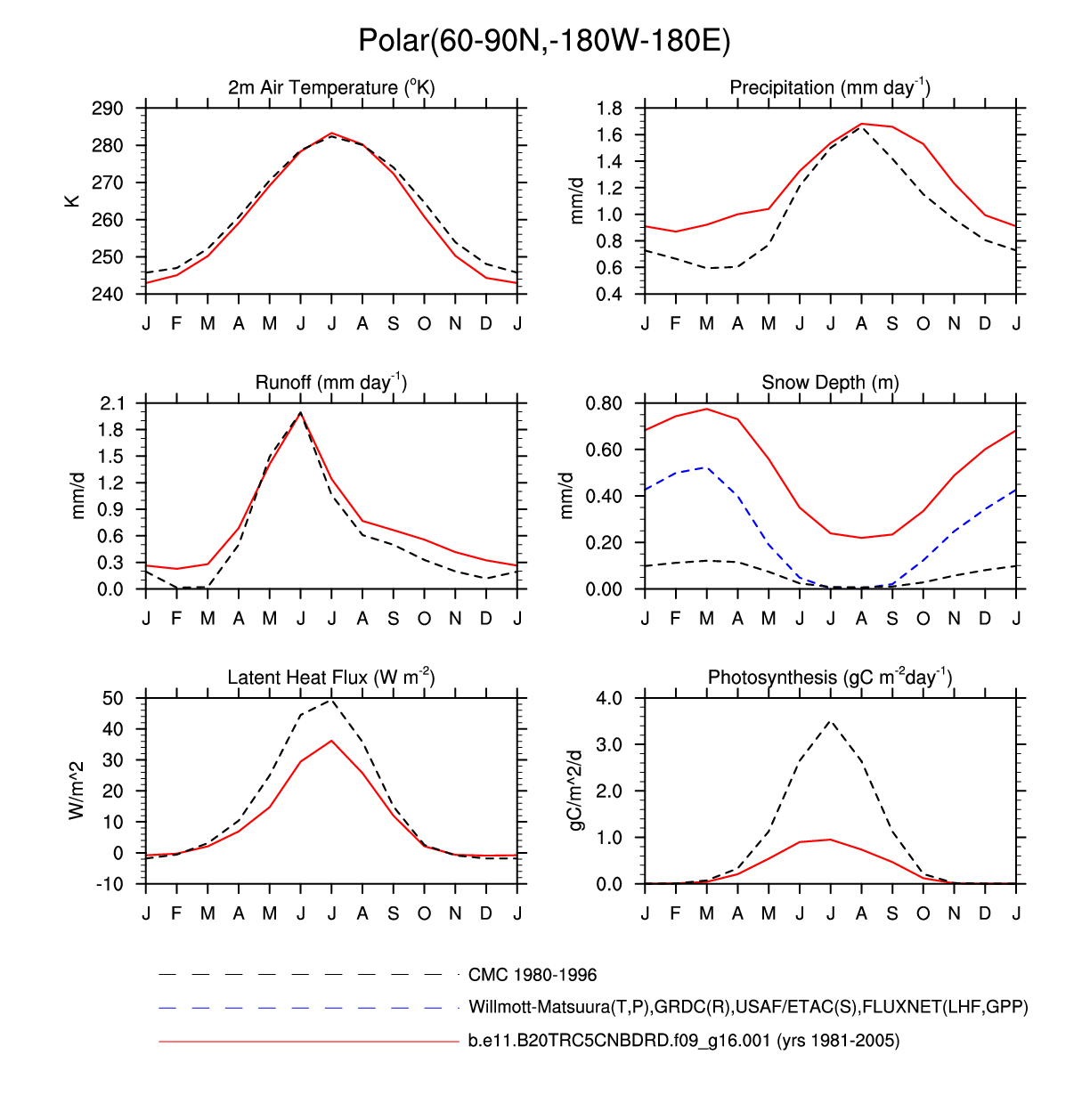 Set 3 Description: Line plots of monthly climatology: regional air temperature, precipitation, runoff, snow depth, radiative fluxes, and turbulent fluxes