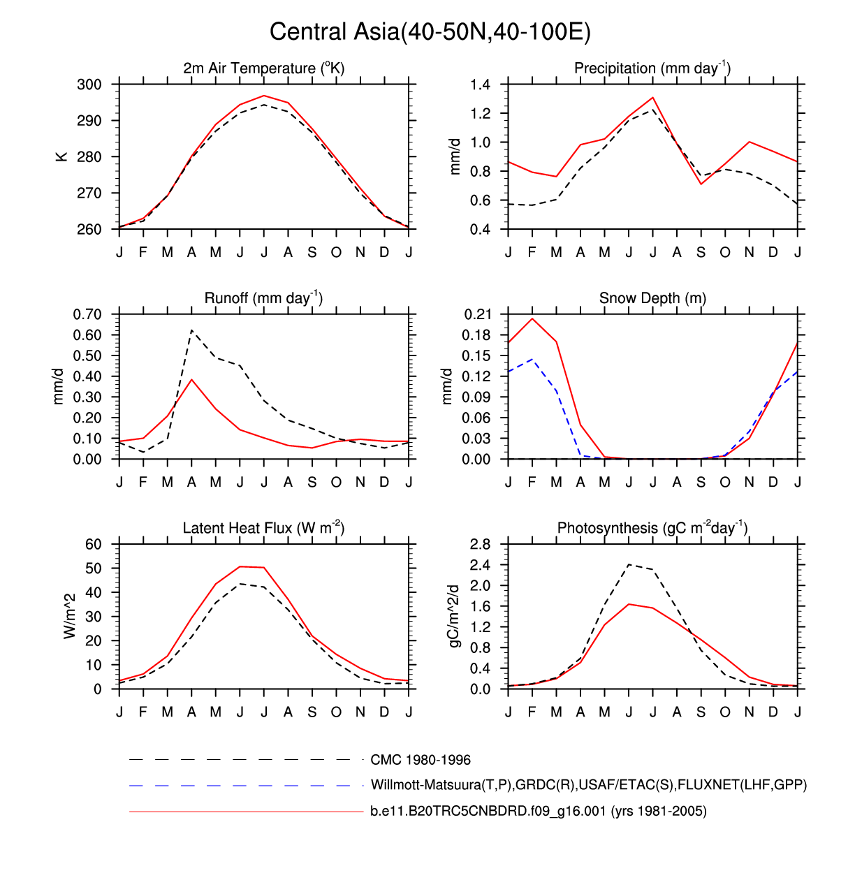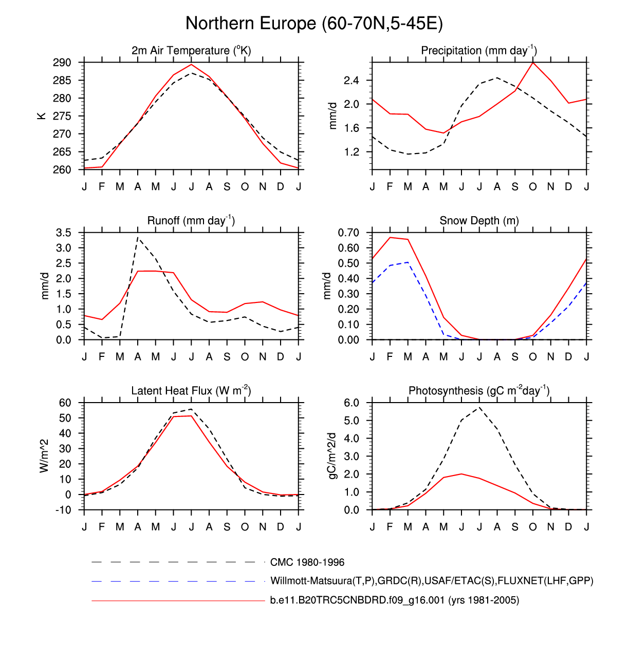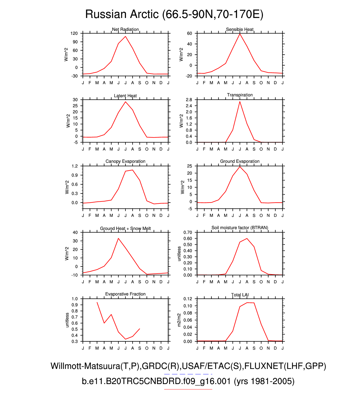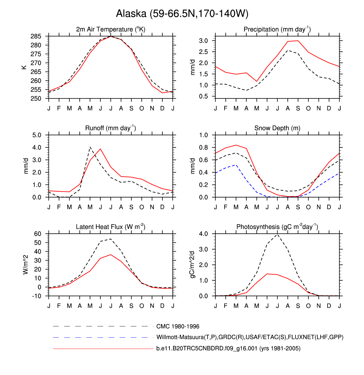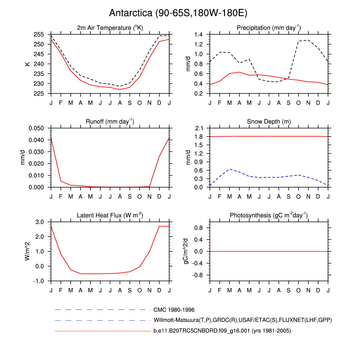 Set 3 Description: Line plots of monthly climatology: regional air temperature, precipitation, runoff, snow depth, radiative fluxes, and turbulent fluxes